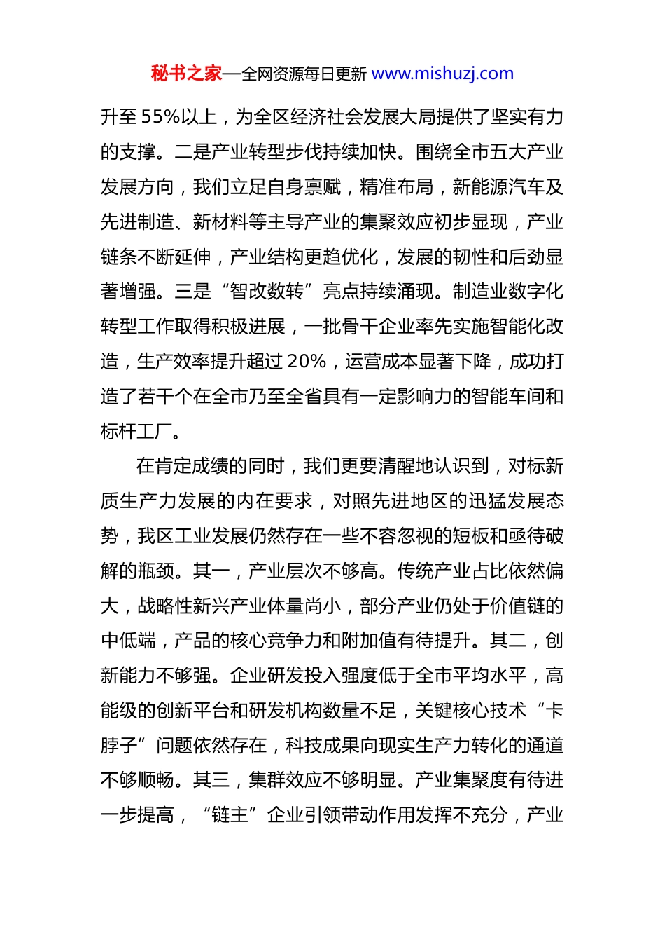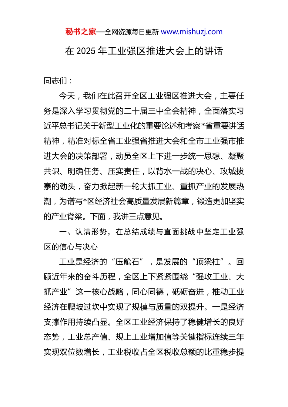 秘书之家—全网资源每日更新 www.mishuzj.com在 2025 年工业强区推进大会上的讲话 同志们:今天,我们在此召开全区工业强区推进大会,主要任务是深入学习贯彻党的二十届三中全会精神,全面落实习近平总书记关于新型工业化的重要论述和考察*省重要讲话精神,精准对标全省工业强省推进大会和全市工业强市推进大会的决策部署,动员全区上下进一步统一思想、凝聚共识、明确任务、压实责任,以背水一战的决心、攻城拔寨的劲头,奋力掀起新一轮大抓工业、重抓产业的发展热潮,为谱写*区经济社会高质量发展新篇章,锻造更加坚实的产业脊梁。下面,我讲三点意见。一、认清形势,在总结成绩与直面挑战中坚定工业强区的信心与决心工业是经济的“压舱石”,是发展的“顶梁柱”。回顾近年来的奋斗历程,全区上下紧紧围绕“强攻工业、大抓产业”这一核心战略,同心同德,砥砺奋进,推动工业经济在爬坡过坎中实现了规模与质量的双提升。一是经济支撑作用持续凸显。全区工业经济保持了稳健增长的良好态势,工业总产值、规上工业增加值等关键指标连续三年实现双位数增长,工业税收占全区税收总额的比重稳步提秘书之家—全网资源每日更新 www.mishuzj.com升至 55%以上,为全区经济社会发展大局提供了坚实有力的支撑。二是产业转型步伐持续加快。围绕全市五大产业发展方向,我们立足自身禀赋,精准布局,新能源汽车及先进制造、新材料等主导产业的集聚效应初步显现,产业链条不断延伸,产业结构更趋优化,发展的韧性和后劲显著增强。三是“智改数转”亮点持续涌现。制造业数字化转型工作取得积极进展,一批骨干企业率先实施智能化改造,生产效率提升超过 20%,运营成本显著下降,成功打造了若干个在全市乃至全省具有一定影响力的智能车间和标杆工厂。在肯定成绩的同时,我们更要清醒地认识到,对标新质生产力发展的内在要求,对照先进地区的迅猛发展态势,我区工业发展仍然存在一些不容忽视的短板和亟待破解的瓶颈。其一,产业层次不够高。传统产业占比依然偏大,战略性新兴产业体量尚小,部分产业仍处于价值链的中低端,产品的核心竞争力和附加值有待提升。其二,创新能力不够强。企业研发投入强度低于全市平均水平,高能级的创新平台和研发机构数量不足,关键核心技术“卡脖子”问题依然存在,科技成果向现实生产力转化的通道不够顺畅。其三,集群效应不够明显。产业集聚度有待进一步提高,“链主”企业引领带动作用发挥不充分,产业秘书之家—全网资源每日更新 www.mishuzj.com链上下游协同配套能力较弱,“攥指成拳”的合力尚未完全形成。其四,要素保障不够优。土地、资金、人才等关键要素供给仍然偏紧,营商环境对标一流标准还有差距,服务企业的精准性和实效性需要持续加强。面对这些问题,我们决不能视而不见、麻木不仁,必须坚持问题导向,增强危机意识和忧患意识,以刀刃向内的勇气,采取更加有力、更加精准的措施,切实加以解决。同时,我们也要看到,挑战与机遇并存。当前,国家正大力推进新型工业化,加快发展新质生产力;省委、市委相继召开高规格会议,吹响了工业强省、工业强市的“冲锋号”,一系列含金量高、针对性强的政策措施密集出台。这为我们加快工业发展提供了前所未有的战略机遇和政策红利。我们必须抢抓机遇、乘势而上,化挑战为动力,变压力为推力,在激烈的区域竞争中抢占先机、赢得主动。二、聚焦重点,在精准施策与协同发力中开创工业发展的新局面推进工业强区建设,是一项复杂的系统工程,必须坚持系统观念,抓住主要矛盾,纲举目张,重点突破。要紧紧围绕以下五个方面,集中力量,攻坚克难。(一)锚定产业方向,构筑集群发展新高地。产业是工业的根基。没有明确的产业方向,工业发展就会迷失方秘书之家—全网资源每日更新 www.mishuzj.com向;没有成群成势的产业集群,工业经济就难以做大做强。首先,要坚持五大产业主攻方向不动摇。这是立足我区产业基础和比较优势,经过深入研究、科学论证确定的发展路径,必须一以贯之,久久为功。新能源汽车和先进制造业要聚焦*电池等优势赛道,做深做透产业链研究,完善“四图五清单”,实施精准靶向招商,着力引进一...