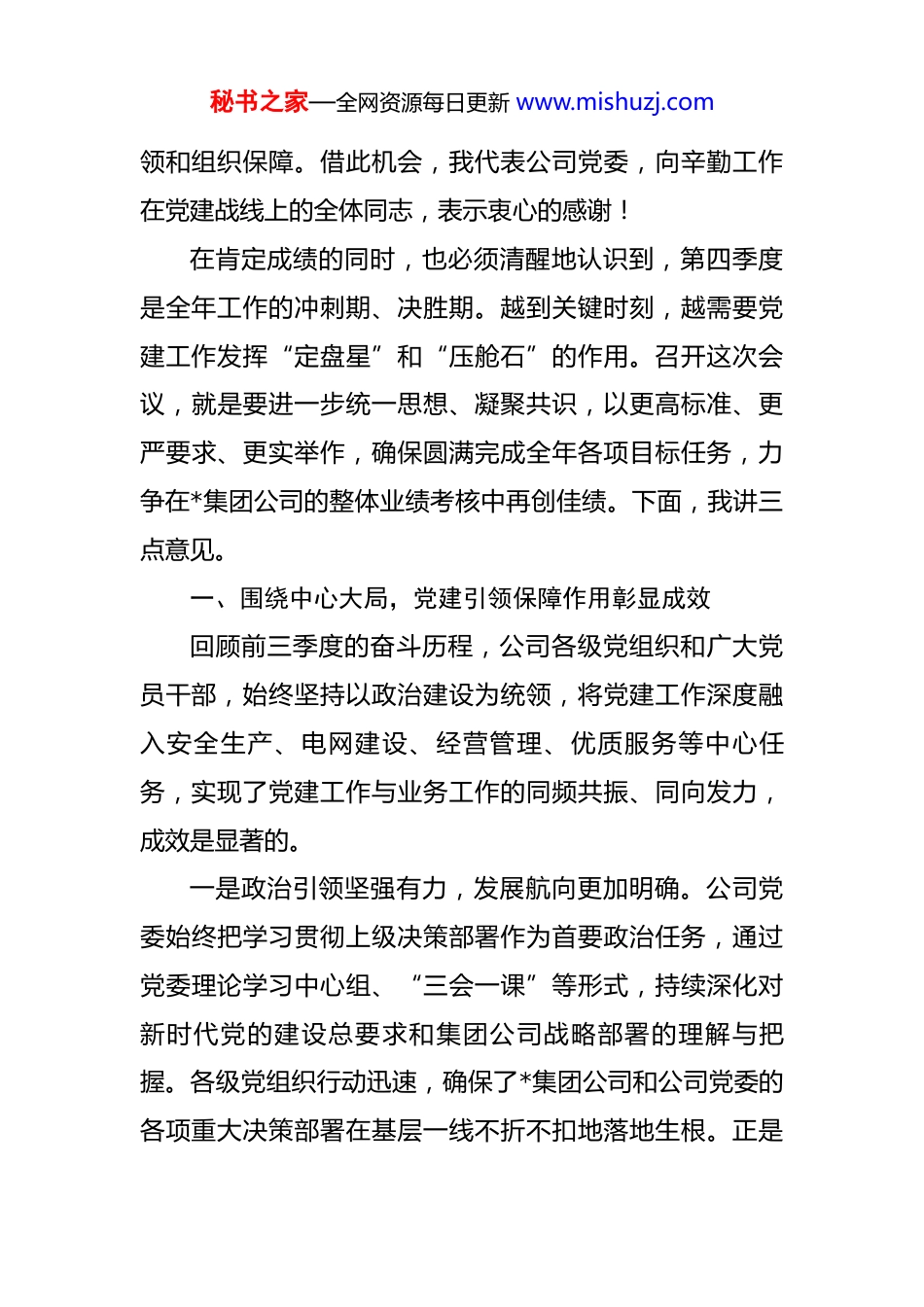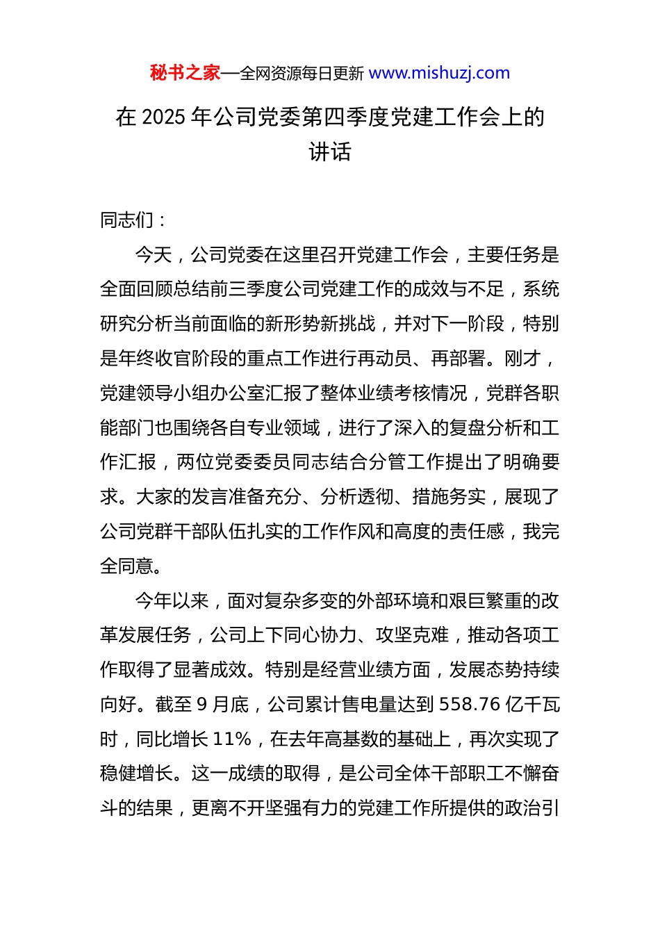 秘书之家—全网资源每日更新 www.mishuzj.com在 2025 年公司党委第四季度党建工作会上的讲话 同志们:今天,公司党委在这里召开党建工作会,主要任务是全面回顾总结前三季度公司党建工作的成效与不足,系统研究分析当前面临的新形势新挑战,并对下一阶段,特别是年终收官阶段的重点工作进行再动员、再部署。刚才,党建领导小组办公室汇报了整体业绩考核情况,党群各职能部门也围绕各自专业领域,进行了深入的复盘分析和工作汇报,两位党委委员同志结合分管工作提出了明确要求。大家的发言准备充分、分析透彻、措施务实,展现了公司党群干部队伍扎实的工作作风和高度的责任感,我完全同意。今年以来,面对复杂多变的外部环境和艰巨繁重的改革发展任务,公司上下同心协力、攻坚克难,推动各项工作取得了显著成效。特别是经营业绩方面,发展态势持续向好。截至 9 月底,公司累计售电量达到 558.76 亿千瓦时,同比增长 11%,在去年高基数的基础上,再次实现了稳健增长。这一成绩的取得,是公司全体干部职工不懈奋斗的结果,更离不开坚强有力的党建工作所提供的政治引秘书之家—全网资源每日更新 www.mishuzj.com领和组织保障。借此机会,我代表公司党委,向辛勤工作在党建战线上的全体同志,表示衷心的感谢!在肯定成绩的同时,也必须清醒地认识到,第四季度是全年工作的冲刺期、决胜期。越到关键时刻,越需要党建工作发挥“定盘星”和“压舱石”的作用。召开这次会议,就是要进一步统一思想、凝聚共识,以更高标准、更严要求、更实举作,确保圆满完成全年各项目标任务,力争在*集团公司的整体业绩考核中再创佳绩。下面,我讲三点意见。一、围绕中心大局,党建引领保障作用彰显成效回顾前三季度的奋斗历程,公司各级党组织和广大党员干部,始终坚持以政治建设为统领,将党建工作深度融入安全生产、电网建设、经营管理、优质服务等中心任务,实现了党建工作与业务工作的同频共振、同向发力,成效是显著的。一是政治引领坚强有力,发展航向更加明确。公司党委始终把学习贯彻上级决策部署作为首要政治任务,通过党委理论学习中心组、“三会一课”等形式,持续深化对新时代党的建设总要求和集团公司战略部署的理解与把握。各级党组织行动迅速,确保了*集团公司和公司党委的各项重大决策部署在基层一线不折不扣地落地生根。正是秘书之家—全网资源每日更新 www.mishuzj.com由于这种高度的政治自觉和行动自觉,公司在推进*区域智能电网升级、保障*重点产业园区可靠供电等重大项目中,始终能够统一意志、步调一致,形成了强大的工作合力。二是组织基础持续夯实,战斗堡垒更加坚固。围绕“强基固本”目标,扎实推进基层党组织标准化、规范化建设。通过实施“星级支部”动态管理,基层党组织的政治功能和组织功能得到显著增强。特别是在急难险重任务面前,党员的先锋模范作用得到了充分彰显。例如,在迎峰度夏期间,多个基层单位成立了“党员突击队”,带头奋战在保电一线,有效应对了历史极值负荷的考验,确保了电网安全稳定运行和电力可靠供应,相关经验做法获得了群众的广泛赞誉。这种平常时候看得出来、关键时刻站得出来、危急关头豁得出来的先锋本色,正是公司最宝贵的精神财富。三是深度融合走深走实,服务大局更加精准。各级党组织积极探索党建与业务融合的有效路径,逐步破解“两张皮”问题。物资供应部门党支部通过开展“红色供应链”主题活动,将党员责任区与关键物资保供任务直接挂钩,前三季度重点工程物资供应满足率达到 100%,有力地支持了工程建设进度。营销服务部门将“我为群众办实事”实践活动常态化,聚焦优化用电营商环境,党员带头秘书之家—全网资源每日更新 www.mishuzj.com推广线上办电服务,将高压客户办电环节压缩至 3 个以内,办电时长同比缩短 20%,客户满意度持续提升。这些实践充分证明,党建工作做实了就是生产力,做强了就是竞争力,做细了就是凝聚力。二、保持清醒认知,深刻检视党建工作短板弱项在总结成绩的同时,更要用辩证的、发展的眼光审视自身,以“吾日三省吾身”的态度,清醒地认识到工作中存在的差距和不足。对照*集团公司党建考核的...
