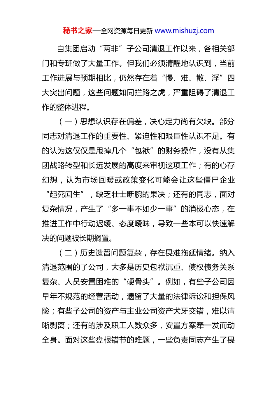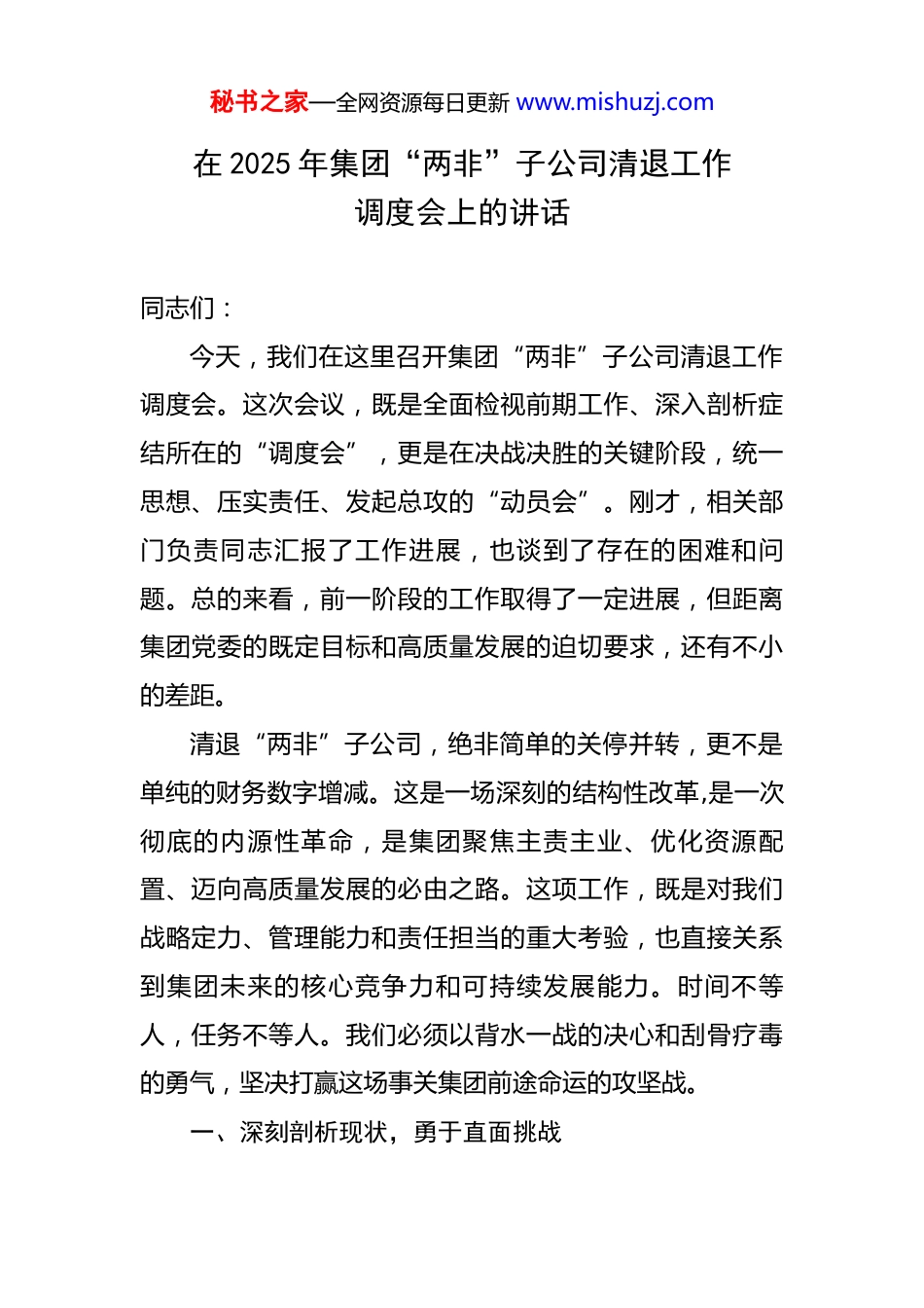 秘书之家—全网资源每日更新 www.mishuzj.com在 2025 年集团“两非”子公司清退工作调度会上的讲话 同志们:今天,我们在这里召开集团“两非”子公司清退工作调度会。这次会议,既是全面检视前期工作、深入剖析症结所在的“调度会”,更是在决战决胜的关键阶段,统一思想、压实责任、发起总攻的“动员会”。刚才,相关部门负责同志汇报了工作进展,也谈到了存在的困难和问题。总的来看,前一阶段的工作取得了一定进展,但距离集团党委的既定目标和高质量发展的迫切要求,还有不小的差距。清退“两非”子公司,绝非简单的关停并转,更不是单纯的财务数字增减。这是一场深刻的结构性改革,是一次彻底的内源性革命,是集团聚焦主责主业、优化资源配置、迈向高质量发展的必由之路。这项工作,既是对我们战略定力、管理能力和责任担当的重大考验,也直接关系到集团未来的核心竞争力和可持续发展能力。时间不等人,任务不等人。我们必须以背水一战的决心和刮骨疗毒的勇气,坚决打赢这场事关集团前途命运的攻坚战。一、深刻剖析现状,勇于直面挑战秘书之家—全网资源每日更新 www.mishuzj.com自集团启动“两非”子公司清退工作以来,各相关部门和专班做了大量工作。但我们必须清醒地认识到,当前工作进展与预期相比,仍然存在着“慢、难、散、浮”四大突出问题,这些问题如同拦路之虎,严重阻碍了清退工作的整体进程。(一)思想认识存在偏差,决心定力尚有欠缺。部分同志对清退工作的重要性、紧迫性和艰巨性认识不足。有的认为这仅仅是甩掉几个“包袱”的财务操作,没有从集团战略转型和长远发展的高度来审视这项工作;有的心存幻想,认为市场回暖或政策变化可能会让这些僵尸企业“起死回生”,缺乏壮士断腕的果决;还有的同志,面对复杂情况,产生了“多一事不如少一事”的消极心态,在推进工作中行动迟缓、态度暧昧,导致一些本可以快速解决的问题被长期搁置。(二)历史遗留问题复杂,存在畏难拖延情绪。纳入清退范围的子公司,大多是历史包袱沉重、债权债务关系复杂、人员安置困难的“硬骨头”。例如,有些子公司因早年不规范的经营活动,遗留了大量的法律诉讼和担保风险;有些子公司的资产与主业公司资产犬牙交错,难以清晰剥离;还有的涉及职工人数众多,安置方案牵一发而动全身。面对这些盘根错节的难题,一些负责同志产生了畏秘书之家—全网资源每日更新 www.mishuzj.com难情绪,习惯于“绕着走”,不愿意去触碰核心矛盾,导致清退工作长期停留在外围,无法取得实质性突破。(三)协同作战机制不畅,存在责任推诿现象。清退工作是一项系统工程,需要财务、法务、审计、人力、业务等部门形成拳头,协同作战。但在实际操作中,部门壁垒依然存在。财务部门侧重于账务清理和资产核算,法务部门聚焦于法律风险和诉讼程序,业务部门则关注市场影响,各部门之间缺乏高效的联动机制,信息沟通不畅,决策流程冗长。有时甚至出现“你等我、我等你”的现象,导致一个简单的审批或确认环节,就要耗费大量时间,严重影响了工作效率,未能形成攻坚克难的强大合力。(四)尽职调查浮于表面,病根症结未能找准。按照要求,清退工作的前提是“事实清楚、证据确凿、责任明确”。然而,部分子公司的清退前期调查工作做得不深不实。对于亏损的原因,分析报告往往停留在“市场竞争激烈”“原材料成本上升”等宏观层面,而没有深入到经营管理的肌理,没有精准回答“钱亏在哪里、谁该负责”这些根本性问题。有的子公司账目混乱,资产底数不清,负债情况不明,导致后续的资产评估和处置工作无法展开。据初步统计,截至 2025 年第三季度末,集团尚有*家“两非”子公司待清退,涉及资产总额高达*亿元,员工近*秘书之家—全网资源每日更新 www.mishuzj.com人。其中,连续亏损超过三年的企业有*家,累计亏损额已超过*亿元。这些触目惊心的数据背后,是国有资产的持续流失,是发展机遇的白白浪费,更是我们管理上的巨大漏洞。我们绝不能再熟视无睹,必须采取断然措施,彻底扭转这一被动局面。二、统一思想认识,明确清退工作的核心要义打赢这场攻坚战,首要任务是进一步统一思想,深刻领会清退“两非”...