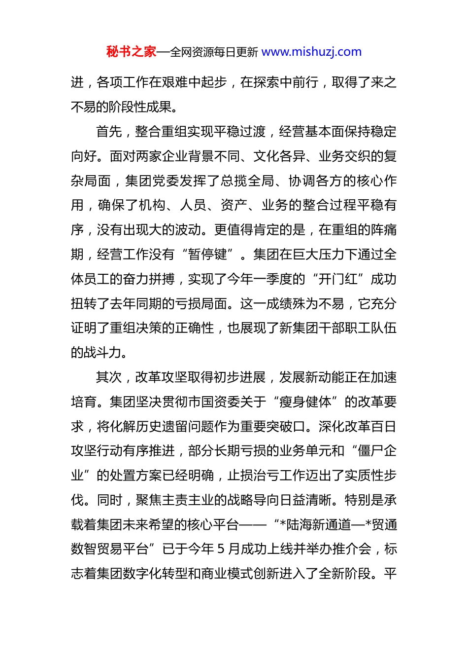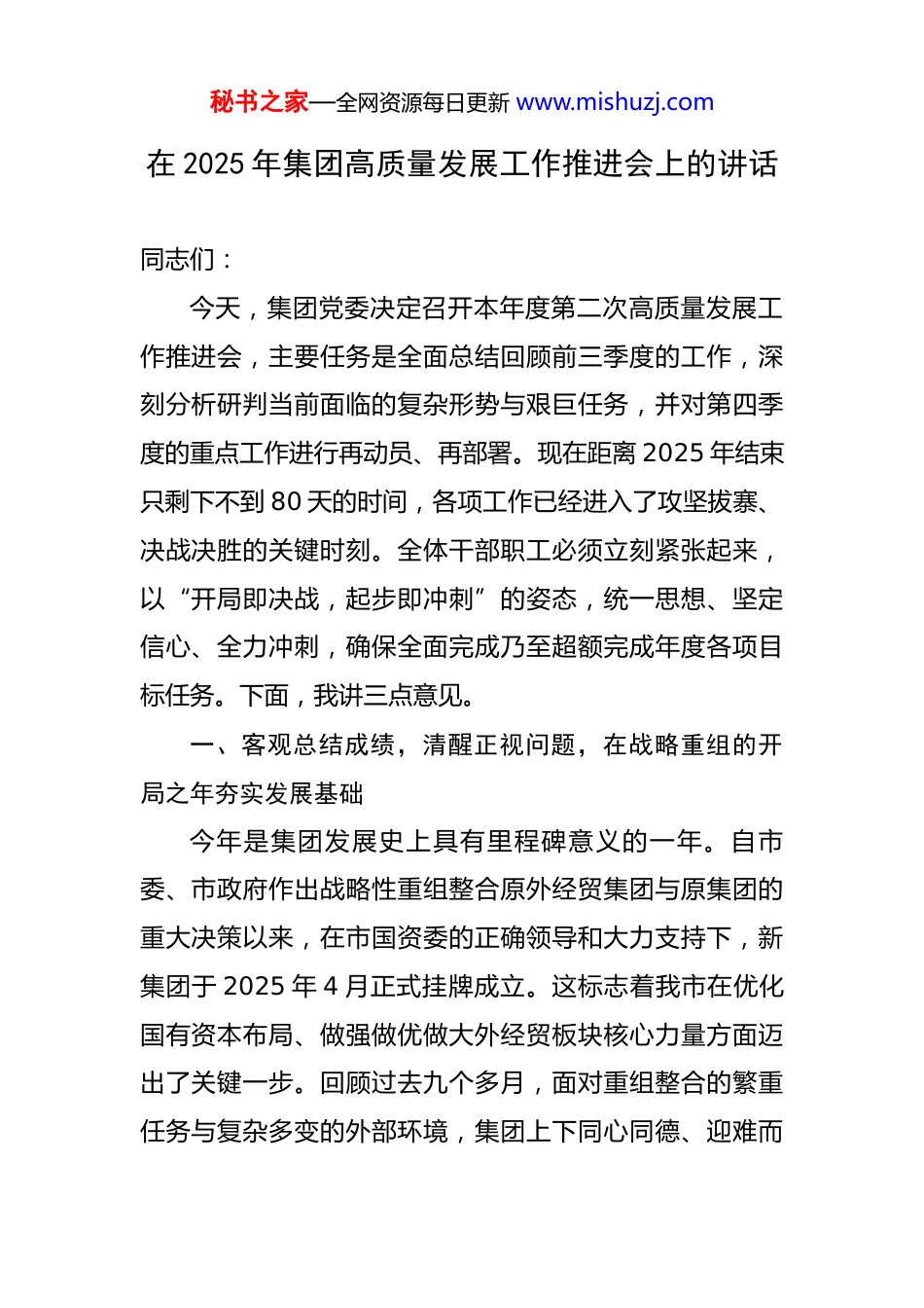秘书之家—全网资源每日更新 www.mishuzj.com在 2025 年集团高质量发展工作推进会上的讲话 同志们:今天,集团党委决定召开本年度第二次高质量发展工作推进会,主要任务是全面总结回顾前三季度的工作,深刻分析研判当前面临的复杂形势与艰巨任务,并对第四季度的重点工作进行再动员、再部署。现在距离 2025 年结束只剩下不到 80 天的时间,各项工作已经进入了攻坚拔寨、决战决胜的关键时刻。全体干部职工必须立刻紧张起来,以“开局即决战,起步即冲刺”的姿态,统一思想、坚定信心、全力冲刺,确保全面完成乃至超额完成年度各项目标任务。下面,我讲三点意见。一、客观总结成绩,清醒正视问题,在战略重组的开局之年夯实发展基础今年是集团发展史上具有里程碑意义的一年。自市委、市政府作出战略性重组整合原外经贸集团与原集团的重大决策以来,在市国资委的正确领导和大力支持下,新集团于 2025 年 4 月正式挂牌成立。这标志着我市在优化国有资本布局、做强做优做大外经贸板块核心力量方面迈出了关键一步。回顾过去九个多月,面对重组整合的繁重任务与复杂多变的外部环境,集团上下同心同德、迎难而秘书之家—全网资源每日更新 www.mishuzj.com进,各项工作在艰难中起步,在探索中前行,取得了来之不易的阶段性成果。首先,整合重组实现平稳过渡,经营基本面保持稳定向好。面对两家企业背景不同、文化各异、业务交织的复杂局面,集团党委发挥了总揽全局、协调各方的核心作用,确保了机构、人员、资产、业务的整合过程平稳有序,没有出现大的波动。更值得肯定的是,在重组的阵痛期,经营工作没有“暂停键”。集团在巨大压力下通过全体员工的奋力拼搏,实现了今年一季度的“开门红”成功扭转了去年同期的亏损局面。这一成绩殊为不易,它充分证明了重组决策的正确性,也展现了新集团干部职工队伍的战斗力。其次,改革攻坚取得初步进展,发展新动能正在加速培育。集团坚决贯彻市国资委关于“瘦身健体”的改革要求,将化解历史遗留问题作为重要突破口。深化改革百日攻坚行动有序推进,部分长期亏损的业务单元和“僵尸企业”的处置方案已经明确,止损治亏工作迈出了实质性步伐。同时,聚焦主责主业的战略导向日益清晰。特别是承载着集团未来希望的核心平台——“*陆海新通道—*贸通数智贸易平台”已于今年 5 月成功上线并举办推介会,标志着集团数字化转型和商业模式创新进入了全新阶段。平秘书之家—全网资源每日更新 www.mishuzj.com台上线以来,已吸引首批超过 400 家企业入驻,为集团打造供应链“链主”企业地位注入了强劲动力。最后,党建统领作用有效发挥,干事创业的氛围初步形成。集团新一届党委班子成立后,旗帜鲜明地坚持党的领导,加强党的建设,把方向、管大局、保落实。通过深入学习贯彻中央八项规定精神等系列主题教育活动,干部的纪律意识和规矩意识得到增强。面对改革中的难点、痛点,一批党员干部能够冲锋在前,展现了应有的担当。在肯定成绩的同时,更要以“吾日三省吾身”的态度,清醒地认识到当前存在的突出问题和严峻挑战。这些问题不解决,高质量发展就是一句空话。一是思想认识仍需进一步统一,改革共识尚需凝聚。重组后,部分干部职工依然存在“等、靠、要”的惯性思维,对市场化改革的残酷性和紧迫性认识不足。对于新集团的战略目标、发展路径,一些同志的理解还停留在表面,在行动上未能真正对标对表,存在“新瓶装旧酒”的现象。二是改革重组任务依然艰巨,财务模型极不稳定。必须清醒地看到,一季度的微利是在特定条件下实现的,并不代表集团已经走出了困境。截至今年 3 月末,集团总资产为 167.25 亿元,但资产负债率仍高达 73.66%。原*外经贸集团高达 99.5%的历史负债率所带来的巨大债务压力尚未完全化解,“止损治秘书之家—全网资源每日更新 www.mishuzj.com亏”“资产盘活”“债务接续”三大攻坚战才刚刚开始,每一项都是难啃的硬骨头。三是主责主业聚焦度不高,核心竞争力亟待加强。集团目前集成的业务组合庞杂,涵盖了贸易、能源、物流、电力甚至部分房地产业态资源配置分散,未能形成拳头优势。在外贸主业领域,传统的商...