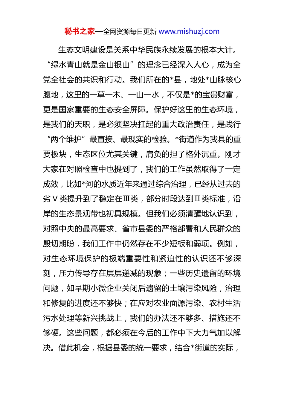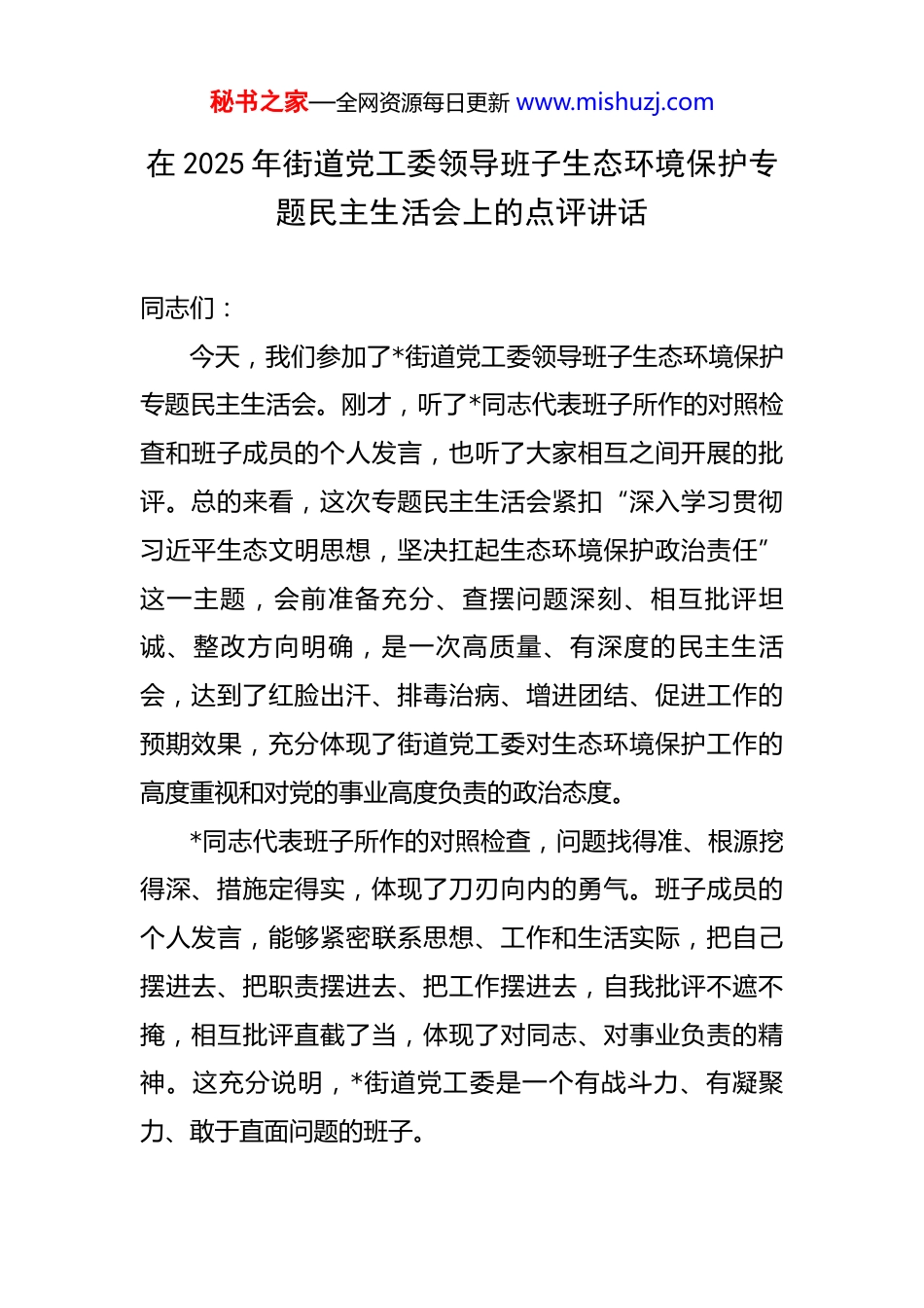 秘书之家—全网资源每日更新 www.mishuzj.com在 2025 年街道党工委领导班子生态环境保护专题民主生活会上的点评讲话 同志们:今天,我们参加了*街道党工委领导班子生态环境保护专题民主生活会。刚才,听了*同志代表班子所作的对照检查和班子成员的个人发言,也听了大家相互之间开展的批评。总的来看,这次专题民主生活会紧扣“深入学习贯彻习近平生态文明思想,坚决扛起生态环境保护政治责任”这一主题,会前准备充分、查摆问题深刻、相互批评坦诚、整改方向明确,是一次高质量、有深度的民主生活会,达到了红脸出汗、排毒治病、增进团结、促进工作的预期效果,充分体现了街道党工委对生态环境保护工作的高度重视和对党的事业高度负责的政治态度。*同志代表班子所作的对照检查,问题找得准、根源挖得深、措施定得实,体现了刀刃向内的勇气。班子成员的个人发言,能够紧密联系思想、工作和生活实际,把自己摆进去、把职责摆进去、把工作摆进去,自我批评不遮不掩,相互批评直截了当,体现了对同志、对事业负责的精神。这充分说明,*街道党工委是一个有战斗力、有凝聚力、敢于直面问题的班子。秘书之家—全网资源每日更新 www.mishuzj.com生态文明建设是关系中华民族永续发展的根本大计。“绿水青山就是金山银山”的理念已经深入人心,成为全党全社会的共识和行动。我们所在的*县,地处*山脉核心腹地,这里的一草一木、一山一水,不仅是*的宝贵财富,更是国家重要的生态安全屏障。保护好这里的生态环境,是我们的天职,是必须坚决扛起的重大政治责任,是践行“两个维护”最直接、最现实的检验。*街道作为我县的重要板块,生态区位尤其关键,肩负的担子格外沉重。刚才大家在对照检查中也提到了,我们的工作虽然取得了一定成效,比如*河的水质近年来通过综合治理,已经从过去的劣 V 类提升到了稳定在Ⅲ类,部分时段达到Ⅱ类标准,沿岸的生态景观带也初具规模。但我们必须清醒地认识到,对照中央的最高要求、省市县委的严格部署和人民群众的殷切期盼,我们工作中仍然存在不少短板和弱项。例如,对生态环境保护的极端重要性和紧迫性的认识还不够深刻,压力传导存在层层递减的现象;一些历史遗留的环境问题,如早期小微企业关闭后遗留的土壤污染风险,治理和修复的进度还不够快;在应对农业面源污染、农村生活污水处理等新兴挑战上,我们的办法还不够多、措施还不够硬。这些问题,都必须在今后的工作中下大力气加以解决。借此机会,根据县委的统一要求,结合*街道的实际,秘书之家—全网资源每日更新 www.mishuzj.com我讲五点意见,与同志们共勉。一、在深刻反思中把准方向、找准定位,不断提高政治判断力、政治领悟力、政治执行力方向决定道路,定位决定作为。这次专题民主生活会的首要任务,就是通过深刻反思,校准我们的思想航向,明确我们的时代坐标。首先,要站在“国之大者”的高度来认识生态环境保护工作。习近平总书记反复强调,秦岭山脉是我国的中央水塔,是中华民族的祖脉和中华文化的重要象征,保护好秦岭山脉的生态环境,对确保中华民族长盛不衰、实现“两个一百年”奋斗目标、实现可持续发展具有十分重要的战略意义。我们*街道的同志,每天生活、工作在这片青山绿水之间,绝不能有“见惯不惊”的麻木,更不能有“身在宝山不识宝”的迟钝。必须深刻认识到,我们守护的不仅仅是一片山林、一条河流,而是国家生态安全格局的关键一环,是中华民族的永续根脉。我们工作的每一项成效,都关系到下游数千万群众的饮水安全,关系到国家南水北调中线工程的水质安危。这个方向,是我们的政治方向,任何时候都不能有丝毫偏离。其次,要在服务全县发展大局中找准自身定位。当前,全县上下正在深入实施“生态立县、文旅兴县、产业秘书之家—全网资源每日更新 www.mishuzj.com强县”发展战略,绿色发展是我们的主基调和最亮丽的底色。*街道作为县域经济社会发展的排头兵之一,不能仅仅满足于完成指标任务,更要争当全县绿色发展的先行者、示范者。要把生态优势转化为发展优势,积极探索生态产品价值实现的有效路径。例如,我们能否依托*河沿岸的优美环境,发展高品质的生态旅游、康...