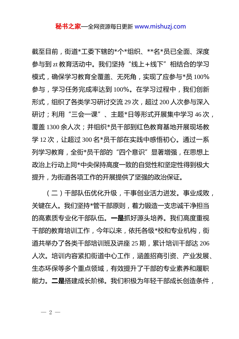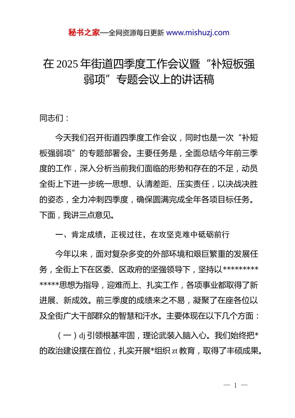 秘书之家—全网资源每日更新 www.mishuzj.com在 2025 年街道四季度工作会议暨“补短板强弱项”专题会议上的讲话稿同志们:今天我们召开街道四季度工作会议,同时也是一次“补短板强弱项”的专题部署会。主要任务是,全面总结今年前三季度的工作,深入分析当前我们面临的形势和存在的不足,动员全街上下进一步统一思想、认清差距、压实责任,以决战决胜的姿态,全力冲刺四季度,确保圆满完成全年各项目标任务。下面,我讲三点意见。一、肯定成绩,正视过往,在攻坚克难中砥砺前行今年以来,面对复杂多变的外部环境和艰巨繁重的发展任务,全街上下在区委、区政府的坚强领导下,坚持以**************思想为指导,迎难而上、扎实工作,各项事业都取得了新进展、新成效。前三季度的成绩来之不易,凝聚了在座各位以及全街广大干部群众的智慧和汗水。主要体现在以下几个方面:(一)dj 引领根基牢固,理论武装入脑入心。我们始终把*的政治建设摆在首位,扎实开展*组织 zt 教育,取得了丰硕成果。— 1 —秘书之家—全网资源每日更新 www.mishuzj.com截至目前,街道*工委下辖的*个*组织、**名*员已全面、深度参与到 zt 教育活动中。我们坚持“线上+线下”相结合的学习模式,确保学习教育全覆盖、无死角,实现了应参与*员 100%参与,学习任务完成率达到 100%。在学习过程中,我们创新形式,组织了各类学习研讨交流 29 次,超过 200 人次参与深入研讨;利用“三会一课”、主题*日等形式开展集中学习 46 次,覆盖 1300 余人次;并组织*员干部到红色教育基地开展现场教学 12 次,让超过 300 名*员干部在实践中感悟初心。通过一系列学习教育,全街*员干部的“四个意识”显著增强,在思想上政治上行动上同*中央保持高度一致的自觉性和坚定性得到极大提升,为街道各项工作的开展提供了坚强的政治保证。(二)干部队伍优化升级,干事创业活力迸发。事业成败,关键在人。我们坚持*管干部原则,着力锻造一支忠诚干净担当的高素质专业化干部队伍。一是抓好源头培养。我们高度重视干部的教育培训工作,今年以来,依托各级*校和专业机构,街道共举办了各类干部培训班及讲座 25 期,累计培训干部达 206人次。培训内容紧扣街道中心工作,涵盖招商引资、产业发展、生态环保等多个重点领域,有效提升了干部的专业素养和履职能力。二是搭建成长阶梯。我们积极为年轻干部成长创造条件,— 2 —秘书之家—全网资源每日更新 www.mishuzj.com选派了 16 名优秀年轻干部到信访维稳、项目建设等一线岗位进行为期一年半的挂职锻炼,让他们在基层一线和急难险重任务中锤炼本领、增长才干。这种“墩苗”历练,为我们的干部队伍储备了充足的后备力量。三是树立鲜明导向。我们坚持在实践中识人、在实干中选人,今年以来,根据工作需要和干部德才表现,街道内部竞争上岗、提拔重用了*名表现优异的干部,其中有*人是从重点项目和中心工作中脱颖而出的业务骨干。形成了能者上、优者奖、庸者下、劣者汰的鲜明用人导向,极大地激发了干部队伍的干事创业热情。(三)为民服务精准高效,群众获得感显著增强。我们始终坚持以人民为中心的发展思想,将群众的急难愁盼作为工作的出发点和落脚点。特别是围绕 12345 市民服务热线这一“送上门的群众工作”,我们下足了“绣花”功夫。通过建立健全首问负责、限时办结、定期回访等制度,我们的工单办理质效得到了革命性提升。数据显示,我街 12345 热线办理的市民满意率,已经从年初的约 64%大幅提升至目前的超过 87%部分领域的服务过程满意率和办理结果满意率甚至连续保持在 100%的水平。这一成绩的取得,得益于我们从“接诉即办”向“未诉先办”的深化转型。我们利用大数据分析,对高频诉求进行— 3 —秘书之家—全网资源每日更新 www.mishuzj.com源头治理,主动排查化解潜在矛盾,真正做到“民有所呼、我有所应,民未有呼、我已先行”。例如,我们及时收集群众意见建议超过 400 条,将房屋安全、饮水保障等难点问题作为 zt教育整改的切入点,推动了一批民生实事项目的落地。(四)中心工作统筹推进,区域发展稳中有进。在抓好以上重点工...