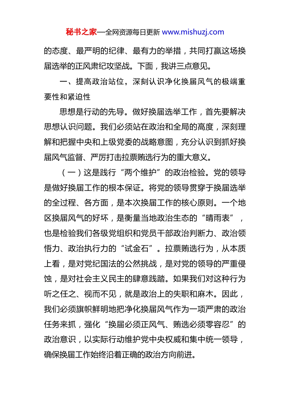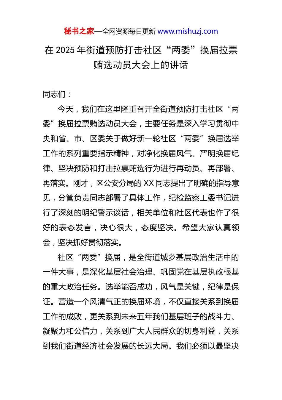 秘书之家—全网资源每日更新 www.mishuzj.com在 2025 年街道预防打击社区“两委”换届拉票贿选动员大会上的讲话 同志们:今天,我们在这里隆重召开全街道预防打击社区“两委”换届拉票贿选动员大会,主要任务是深入学习贯彻中央和省、市、区委关于做好新一轮社区“两委”换届选举工作的系列重要指示精神,对净化换届风气、严明换届纪律、坚决预防和打击拉票贿选行为进行再动员、再部署、再落实。刚才,区公安分局的 XX 同志提出了明确的指导意见,分管负责同志部署了具体工作,纪检监察工委书记进行了深刻的明纪警示谈话,相关单位和社区代表也作了很好的表态发言,决心很大,态度坚决。希望大家认真领会,坚决抓好贯彻落实。社区“两委”换届,是全街道城乡基层政治生活中的一件大事,是深化基层社会治理、巩固党在基层执政根基的重大政治任务。选举能否成功,风气是关键,纪律是保证。营造一个风清气正的换届环境,不仅直接关系到换届工作的成败,更关系到未来五年我们基层班子的战斗力、凝聚力和公信力,关系到广大人民群众的切身利益,关系到我们街道经济社会发展的长远大局。我们必须以最坚决秘书之家—全网资源每日更新 www.mishuzj.com的态度、最严明的纪律、最有力的举措,共同打赢这场换届选举的正风肃纪攻坚战。下面,我讲三点意见。一、提高政治站位,深刻认识净化换届风气的极端重要性和紧迫性思想是行动的先导。做好换届选举工作,首先要解决思想认识问题。我们必须站在政治和全局的高度,深刻理解和把握中央和上级党委的战略意图,充分认识到抓好换届风气监督、严厉打击拉票贿选行为的重大意义。(一)这是践行“两个维护”的政治检验。党的领导是做好换届工作的根本保证。将党的领导贯穿于换届选举的全过程、各方面,是本次换届工作的核心原则。一个地区换届风气的好坏,是衡量当地政治生态的“晴雨表”,也是检验我们各级党组织和党员干部政治判断力、政治领悟力、政治执行力的“试金石”。拉票贿选行为,从本质上看,是对党纪国法的公然挑战,是对党的领导的严重侵蚀,是对社会主义民主的肆意践踏。如果我们对这种行为听之任之、视而不见,就是政治上的失职和麻木。因此,我们必须旗帜鲜明地把净化换届风气作为一项严肃的政治任务来抓,强化“换届必须正风气、贿选必须零容忍”的政治意识,以实际行动维护党中央权威和集中统一领导,确保换届工作始终沿着正确的政治方向前进。秘书之家—全网资源每日更新 www.mishuzj.com(二)这是夯实执政根基的固本之举。基础不牢,地动山摇。社区“两委”班子是党和政府联系服务群众的“最后一公里”,是国家治理体系的“神经末梢”。这个班子强不强,直接决定了党的路线方针政策能否在基层落地生根,直接影响着人民群众的获得感、幸福感、安全感。拉票贿选选出来的干部,往往不是德才兼备、一心为民的“领头雁”,而是投机钻营、追逐私利的“害群马”。他们上台后,想的不是如何为群众办事、为集体谋利,而是如何捞回“成本”、以权谋私,最终损害的是群众的利益,败坏的是党和政府的形象,动摇的是党的执政根基。近几年来,一些地方之所以出现基层矛盾多发、集体经济滑坡、群众上访不断的现象,追根溯源,很多都与当初换届选举风气不正、选人不准有关。我们必须从巩固党的执政地位的战略高度出发,把好换届“入口关”,坚决把那些搞歪门邪道的人挡在门外,确保选出的人民代表是真正能代表人民、服务人民的。(三)这是推动高质量发展的现实需要。当前,我们街道正处在转型升级、跨越发展的关键时期。无论是推进城市更新、优化产业布局,还是深化社会治理、提升民生福祉,都需要一个政治坚定、能力突出、作风过硬、群众拥护的坚强基层领导班子来团结带领广大群众共同奋斗。秘书之家—全网资源每日更新 www.mishuzj.com一场风清气正的换届选举,本身就是一次凝心聚力、鼓舞士气的过程。它能够激发广大党员群众的政治热情,能够树立正确的用人导向,能够把蕴藏在干部群众中的干事创业激情充分调动起来。反之,如果换届选举乌烟瘴气,拉票贿选横行,必然会搞乱人心、搞散队伍、搞坏风气,挫伤广大干部群众的积极性,给...