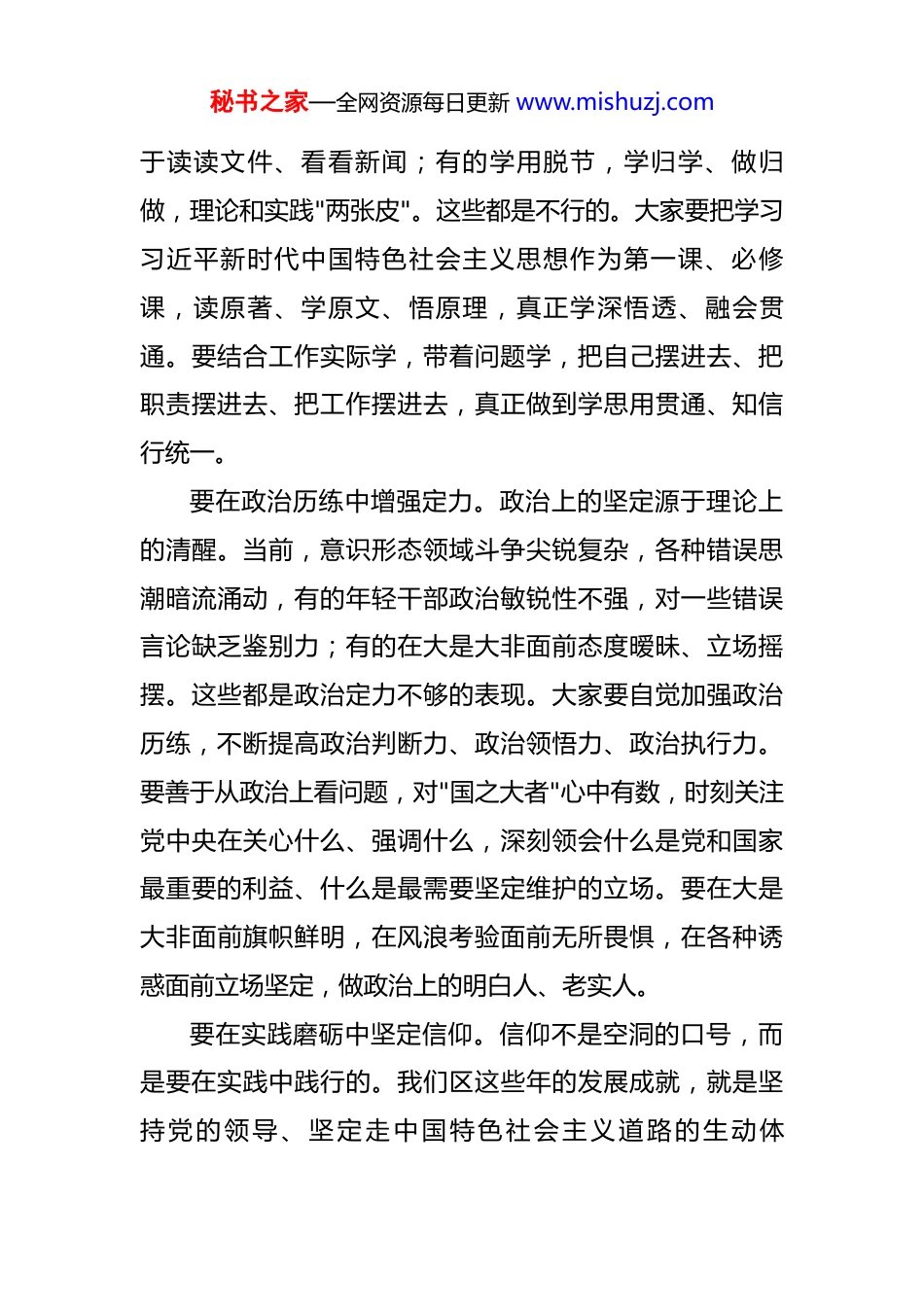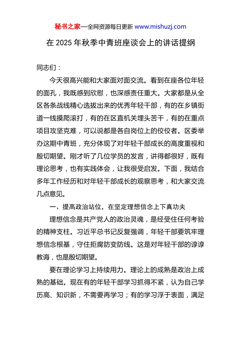 秘书之家—全网资源每日更新 www.mishuzj.com在 2025 年秋季中青班座谈会上的讲话提纲 同志们:今天很高兴能和大家面对面交流。看到在座各位年轻的面孔,我既感到欣慰,也深感责任重大。大家都是从全区各条战线精心选拔出来的优秀年轻干部,有的在乡镇街道一线摸爬滚打,有的在区直机关埋头苦干,有的在重点项目攻坚克难,可以说都是各自岗位上的佼佼者。区委举办这期中青班,充分体现了对年轻干部成长的高度重视和殷切期望。刚才听了几位学员的发言,讲得都很好,既有理论思考,也有实践体会,让我很受启发。下面,我结合多年工作经历和对年轻干部成长的观察思考,和大家交流几点意见。一、提高政治站位,在坚定理想信念上下真功夫理想信念是共产党人的政治灵魂,是经受住任何考验的精神支柱。习近平总书记反复强调,年轻干部要筑牢理想信念根基,守住拒腐防变防线。这是对年轻干部的谆谆教诲,也是殷切期望。要在理论学习上持续用力。理论上的成熟是政治上成熟的基础。现在有的年轻干部学习抓得不紧,认为自己学历高、知识新,不需要再学习;有的学习浮于表面,满足秘书之家—全网资源每日更新 www.mishuzj.com于读读文件、看看新闻;有的学用脱节,学归学、做归做,理论和实践"两张皮"。这些都是不行的。大家要把学习习近平新时代中国特色社会主义思想作为第一课、必修课,读原著、学原文、悟原理,真正学深悟透、融会贯通。要结合工作实际学,带着问题学,把自己摆进去、把职责摆进去、把工作摆进去,真正做到学思用贯通、知信行统一。要在政治历练中增强定力。政治上的坚定源于理论上的清醒。当前,意识形态领域斗争尖锐复杂,各种错误思潮暗流涌动,有的年轻干部政治敏锐性不强,对一些错误言论缺乏鉴别力;有的在大是大非面前态度暧昧、立场摇摆。这些都是政治定力不够的表现。大家要自觉加强政治历练,不断提高政治判断力、政治领悟力、政治执行力。要善于从政治上看问题,对"国之大者"心中有数,时刻关注党中央在关心什么、强调什么,深刻领会什么是党和国家最重要的利益、什么是最需要坚定维护的立场。要在大是大非面前旗帜鲜明,在风浪考验面前无所畏惧,在各种诱惑面前立场坚定,做政治上的明白人、老实人。要在实践磨砺中坚定信仰。信仰不是空洞的口号,而是要在实践中践行的。我们区这些年的发展成就,就是坚持党的领导、坚定走中国特色社会主义道路的生动体秘书之家—全网资源每日更新 www.mishuzj.com现。2024 年全区地区生产总值突破×亿元,城乡居民人均可支配收入分别达到×元和×元,这些实实在在的成绩,充分证明了中国特色社会主义制度的优越性。大家要从全区改革发展的生动实践中,从人民群众生活的显著改善中,进一步坚定"四个自信",增强"四个意识",做到"两个维护",把对党忠诚、为党分忧、为党尽职、为民造福作为根本政治担当。二、强化能力建设,在提升专业素养上下苦功夫能力是立身之本、成事之基。当前,全区正处在推动高质量发展、加快现代化建设的关键时期,对干部的能力素质提出了更高要求。作为年轻干部,必须强化能力建设,不断提升专业素养。要提升战略思维能力。战略问题是一个政党、一个国家的根本性问题。现在有的干部缺乏战略眼光,看问题只见树木不见森林,抓工作只顾眼前不管长远;有的站位不高,习惯于就事论事,不善于从全局谋划一域。这些都是战略思维能力不强的表现。大家要自觉站在全局高度思考问题,善于把握大势、抓住关键、谋划长远。要把本地区本部门的工作放到全区发展大局中去思考、去定位、去摆布,做到既为一域争光、更为全局添彩。要提升创新思维能力。创新是引领发展的第一动力。秘书之家—全网资源每日更新 www.mishuzj.com当前,我们面临的形势在变、任务在变、工作要求也在变,老办法不管用、新办法不会用的问题比较突出。有的干部思想僵化、因循守旧,习惯于按老套路办事;有的不敢创新、不愿创新,怕担风险、怕担责任。这些都是创新能力不足的表现。大家要解放思想、开动脑筋,敢于突破传统思维定势,善于用改革的办法、创新的思路解决发展中的问题。要大胆探索、勇于实践,不怕失败、不怕挫折,在创新中积...