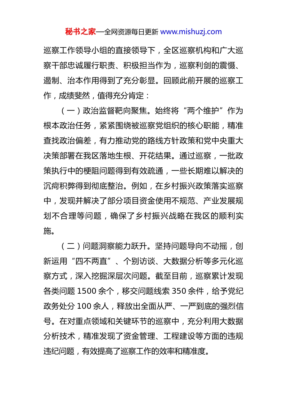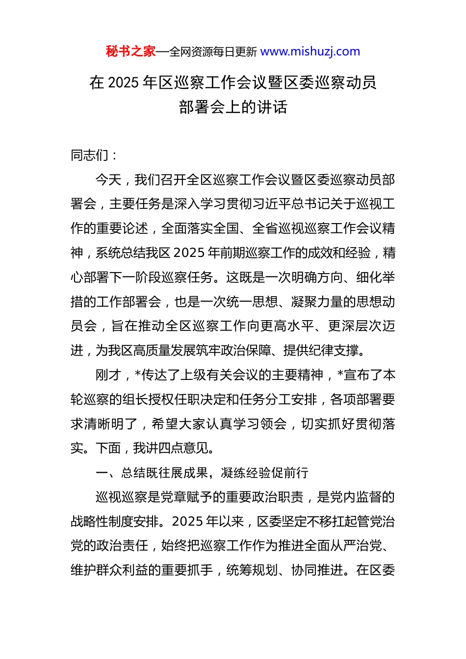 秘书之家—全网资源每日更新 www.mishuzj.com在 2025 年区巡察工作会议暨区委巡察动员部署会上的讲话 同志们:今天,我们召开全区巡察工作会议暨区委巡察动员部署会,主要任务是深入学习贯彻习近平总书记关于巡视工作的重要论述,全面落实全国、全省巡视巡察工作会议精神,系统总结我区 2025 年前期巡察工作的成效和经验,精心部署下一阶段巡察任务。这既是一次明确方向、细化举措的工作部署会,也是一次统一思想、凝聚力量的思想动员会,旨在推动全区巡察工作向更高水平、更深层次迈进,为我区高质量发展筑牢政治保障、提供纪律支撑。刚才,*传达了上级有关会议的主要精神,*宣布了本轮巡察的组长授权任职决定和任务分工安排,各项部署要求清晰明了,希望大家认真学习领会,切实抓好贯彻落实。下面,我讲四点意见。一、总结既往展成果,凝练经验促前行巡视巡察是党章赋予的重要政治职责,是党内监督的战略性制度安排。2025 年以来,区委坚定不移扛起管党治党的政治责任,始终把巡察工作作为推进全面从严治党、维护群众利益的重要抓手,统筹规划、协同推进。在区委秘书之家—全网资源每日更新 www.mishuzj.com巡察工作领导小组的直接领导下,全区巡察机构和广大巡察干部忠诚履行职责、积极担当作为,巡察利剑的震慑、遏制、治本作用得到了充分彰显。回顾此前开展的巡察工作,成绩斐然,值得充分肯定:(一)政治监督靶向聚焦。始终将“两个维护”作为根本政治任务,紧紧围绕被巡察党组织的核心职能,精准查找政治偏差,有力推动党的路线方针政策和党中央重大决策部署在我区落地生根、开花结果。通过巡察,一批政策执行中的梗阻问题得到有效疏通,一些长期难以解决的沉疴积弊得到彻底整治。例如,在乡村振兴政策落实巡察中,发现并解决了部分项目资金使用不规范、产业发展规划不合理等问题,确保了乡村振兴战略在我区的顺利实施。(二)问题洞察能力跃升。坚持问题导向不动摇,创新运用“四不两直”、个别访谈、大数据分析等多元化巡察方式,深入挖掘深层次问题。截至目前,巡察累计发现各类问题 1500 余个,移交问题线索 350 余件,给予党纪政务处分 100 余人,释放出全面从严、一严到底的强烈信号。在对重点领域和关键环节的巡察中,充分利用大数据分析技术,精准发现了资金管理、工程建设等方面的违规违纪问题,有效提高了巡察工作的效率和精准度。秘书之家—全网资源每日更新 www.mishuzj.com(三)成果运用效能凸显。高度重视巡察成果的综合运用,建立健全了问题整改、线索处置、专项治理等工作机制。被巡察党组织切实履行整改主体责任,认真制定整改方案,扎实推进整改工作,做到了事事有回音、件件有着落。同时,针对巡察发现的共性问题,开展专项治理,推动了制度机制的完善和优化。例如,针对巡察中发现的财务管理漏洞,出台了一系列加强财务监管的制度规定,从源头上防范了类似问题的再次发生。(四)队伍建设成效显著。注重加强巡察队伍的政治建设、能力建设和作风建设,通过开展业务培训、实战锻炼、廉政教育等活动,打造了一支政治过硬、本领高强、作风优良的巡察干部队伍。巡察干部们在工作中坚守原则、敢于碰硬,展现出了良好的精神风貌和职业素养。二、把握形势明任务,锚定目标再出发当前,我区正处于经济社会高质量发展的关键时期,面临着诸多机遇和挑战。在全面从严治党的大背景下,巡察工作肩负着更加重要的使命和责任。我们要准确把握形势任务,明确工作目标,以更加坚定的决心、更加有力的举措,推动巡察工作不断取得新成效。(一)深刻认识巡察工作的重要性。巡察是全面从严治党的重要利器,是加强党内监督的重要形式。通过巡秘书之家—全网资源每日更新 www.mishuzj.com察,可以及时发现和解决党组织和党员干部存在的问题,防止小毛病演变成大错误,维护党的先进性和纯洁性。同时,巡察也是密切党群干群关系的重要桥梁,能够倾听群众呼声,解决群众反映的突出问题,增强群众的获得感和幸福感。我们要站在政治和全局的高度,充分认识巡察工作的重要意义,切实增强做好巡察工作的责任感和使命感。(二)准确把握巡察工作的新要求。随着全面从...