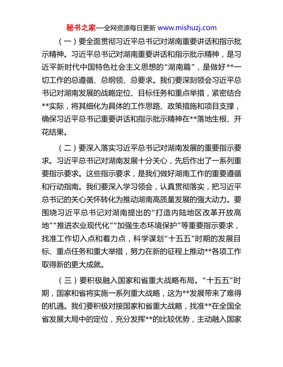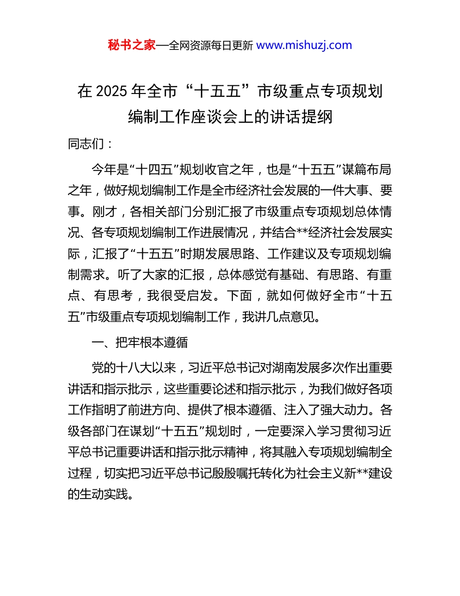 秘书之家—全网资源每日更新 www.mishuzj.com在 2025 年全市“十五五”市级重点专项规划编制工作座谈会上的讲话提纲同志们:“”“”今年是 十四五 规划收官之年,也是 十五五 谋篇布局之年,做好规划编制工作是全市经济社会发展的一件大事、要事。刚才,各相关部门分别汇报了市级重点专项规划总体情况、各专项规划编制工作进展情况,并结合**经济社会发展实“”际,汇报了 十五五 时期发展思路、工作建议及专项规划编制需求。听了大家的汇报,总体感觉有基础、有思路、有重“点、有思考,我很受启发。下面,就如何做好全市 十五”五 市级重点专项规划编制工作,我讲几点意见。一、把牢根本遵循党的十八大以来,习近平总书记对湖南发展多次作出重要讲话和指示批示,这些重要论述和指示批示,为我们做好各项工作指明了前进方向、提供了根本遵循、注入了强大动力。各“”级各部门在谋划 十五五 规划时,一定要深入学习贯彻习近平总书记重要讲话和指示批示精神,将其融入专项规划编制全过程,切实把习近平总书记殷殷嘱托转化为社会主义新**建设的生动实践。秘书之家—全网资源每日更新 www.mishuzj.com(一)要全面贯彻习近平总书记对湖南重要讲话和指示批示精神。习近平总书记对湖南重要讲话和指示批示精神,是习“”近平新时代中国特色社会主义思想的 湖南篇 ,是做好**一切工作的总遵循、总纲领、总要求。我们要深刻领会习近平总书记对湖南发展的战略定位、目标任务和重点举措,紧密结合**实际,将其细化为具体的工作思路、政策措施和项目支撑,确保习近平总书记重要讲话和指示批示精神在**落地生根、开花结果。(二)要深入落实习近平总书记对湖南发展的重要指示要求。习近平总书记对湖南发展十分关心,先后作出了一系列重要指示要求。这些指示要求,是我们做好湖南工作的重要遵循和行动指南。我们要深入学习领会,认真贯彻落实,把习近平总书记的关心关怀转化为推动湖南高质量发展的强大动力。要“围绕习近平总书记对湖南提出的 打造内陆地区改革开放高”“”“”地推进农业现代化加强生态环境保护 等重要指示要求,“”找准工作切入点和着力点,科学谋划 十五五 时期的发展目标、重点任务和重大举措,努力在新的征程上推动**各项工作取得新的更大成就。“”(三)要积极融入国家和省重大战略布局。 十五五 时期,国家和省将实施一系列重大战略,这为**发展带来了难得的机遇。我们要积极对接国家和省重大战略,找准**在全国全省发展大局中的定位,充分发挥**的比较优势,主动融入国家秘书之家—全网资源每日更新 www.mishuzj.com和省重大战略布局,努力在服务大局中实现**的高质量发展。要加强与国家和省相关部门的沟通衔接,积极争取将**更多的重大项目、重大政策、重大改革纳入国家和省规划盘子,为**发展赢得更多的政策支持和发展空间。二、找准编制方向“”方向决定前途,思路决定出路。做好 十五五 市级重点专项规划编制工作,必须找准方向,明确思路,确保规划编制的科学性、前瞻性和可操作性。(一)要统筹好市内和市外。我们既要把发展立足点放在我们自身,充分挖掘和发挥**的优势和潜力,牢牢把握发展主动权;又要把**一城之计放在全国全省大局中去谋划推进,跳出**看**,以全球视野、战略眼光审视**的发展,主动对接国家和省重大战略,积极融入区域发展格局,努力以一域之光为全局添彩。要加强与周边地区的协同合作,在产业发展、基础设施建设、生态环境保护、公共服务等方面实现优势互补、互利共赢,共同推动区域协调发展。(二)要统筹好目标导向和问题导向。在规划编制过程“”中,我们既要明确 十五五 时期的发展目标,细化阶段性任务,确保目标任务可量化、可考核、可实现;又要聚焦制约**高质量发展的突出短板和问题,深入分析问题产生的原因,提出更加有针对性的政策举措,着力破解发展难题,补齐发展短板,增强发展动力。要坚持目标导向和问题导向相统一,以目秘书之家—全网资源每日更新 www.mishuzj.com标引领方向,以问题倒逼改革,推动**经济社会持续健康发展。(三)要统筹好当前和长远。我们既要立足当前,合理确定未来五年...