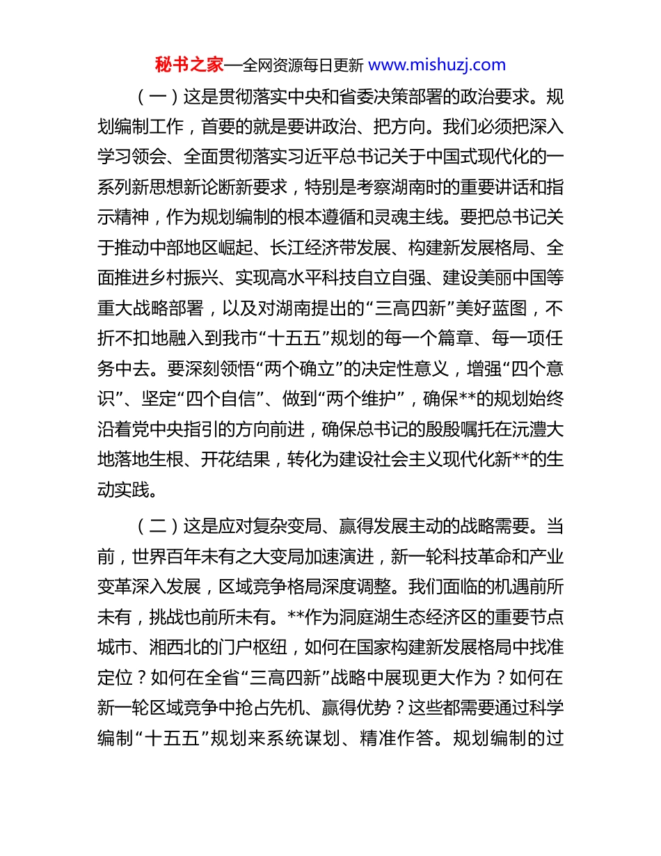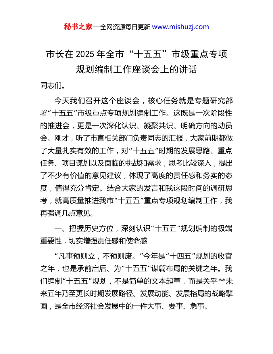 秘书之家—全网资源每日更新 www.mishuzj.com市长在 2025 年全市“十五五”市级重点专项规划编制工作座谈会上的讲话同志们。今天我们召开这个座谈会,核心任务就是专题研究部“”署 十五五 市级重点专项规划编制工作。这既是一次阶段性的推进会,更是一次深化认识、凝聚共识、明确方向的动员会。刚才,听了市直相关部门负责同志的汇报,大家前期都做“”了大量扎实有效的工作,对 十五五 时期的发展思路、重点任务、项目谋划以及面临的挑战和需求,思考比较深入,提出了不少有价值的意见建议,体现了高度的责任感和务实的态度,值得充分肯定。结合大家的发言和我这段时间的调研思“”考,就高质量推进我市 十五五 重点专项规划编制工作,我再强调几点意见。“”一、把握历史方位,深刻认识 十五五 规划编制的极端重要性,切实增强责任感和使命感“”“”凡事预则立,不预则废。 今年是 十四五 规划的收官“”之年,也是承前启后、为 十五五 谋篇布局的关键之年。我“”们编制 十五五 规划,不是简单的文本起草,而是关乎**未来五年乃至更长时期发展路径、发展动能、发展格局的战略擘画,是全市经济社会发展中的一件大事、要事、急事。秘书之家—全网资源每日更新 www.mishuzj.com(一)这是贯彻落实中央和省委决策部署的政治要求。规划编制工作,首要的就是要讲政治、把方向。我们必须把深入学习领会、全面贯彻落实习近平总书记关于中国式现代化的一系列新思想新论断新要求,特别是考察湖南时的重要讲话和指示精神,作为规划编制的根本遵循和灵魂主线。要把总书记关于推动中部地区崛起、长江经济带发展、构建新发展格局、全面推进乡村振兴、实现高水平科技自立自强、建设美丽中国等“”重大战略部署,以及对湖南提出的 三高四新 美好蓝图,不“”折不扣地融入到我市 十五五 规划的每一个篇章、每一项任“”“务中去。要深刻领悟 两个确立 的决定性意义,增强 四个意”“”“”识 、坚定 四个自信 、做到 两个维护 ,确保**的规划始终沿着党中央指引的方向前进,确保总书记的殷殷嘱托在沅澧大地落地生根、开花结果,转化为建设社会主义现代化新**的生动实践。(二)这是应对复杂变局、赢得发展主动的战略需要。当前,世界百年未有之大变局加速演进,新一轮科技革命和产业变革深入发展,区域竞争格局深度调整。我们面临的机遇前所未有,挑战也前所未有。**作为洞庭湖生态经济区的重要节点城市、湘西北的门户枢纽,如何在国家构建新发展格局中找准“”定位?如何在全省 三高四新 战略中展现更大作为?如何在新一轮区域竞争中抢占先机、赢得优势?这些都需要通过科学“”编制 十五五 规划来系统谋划、精准作答。规划编制的过秘书之家—全网资源每日更新 www.mishuzj.com程,就是一次解放思想、统一认识、凝聚智慧的过程,就是一次审视市情、找准短板、明确路径的过程。我们必须以高度的战略清醒和强烈的忧患意识,把规划编制作为把握发展主动权、塑造未来发展新优势的关键一招来抓。(三)这是破解发展难题、推动高质量发展的关键抓手。过去几年,在市委的坚强领导下,在全市上下的共同努力下,**“”经济社会发展取得了显著成就, 十四五 规划确定的主要目标任务总体进展顺利。但同时也要清醒看到,我市发展“不平衡不充分的问题依然突出。产业 大而不强、全而不”优 的结构性矛盾有待深化破解,创新驱动能力亟待加强,县域经济整体实力偏弱,中心城区辐射带动能力仍需提升,生态“环保、民生保障、安全稳定等领域还面临不少挑战。 十五”五 规划编制,必须直面这些深层次矛盾和问题,聚焦制约高质量发展的突出短板,提出更加精准、更有力度的解决方案和政策举措,为**在新起点上实现更高质量、更有效率、更加公平、更可持续、更为安全的发展提供坚实的规划引领和项目支撑。“”二、明确核心要义,精准把握 十五五 规划编制的方向路径,切实提升前瞻性和科学性规划编制,方向比努力更重要。方向对了,路子才能走对。我们要坚持系统观念、辩证思维,着力处理好几个重大关系,确保规划方向不偏、靶心不散。秘书之家—全网资源每日更新 www...