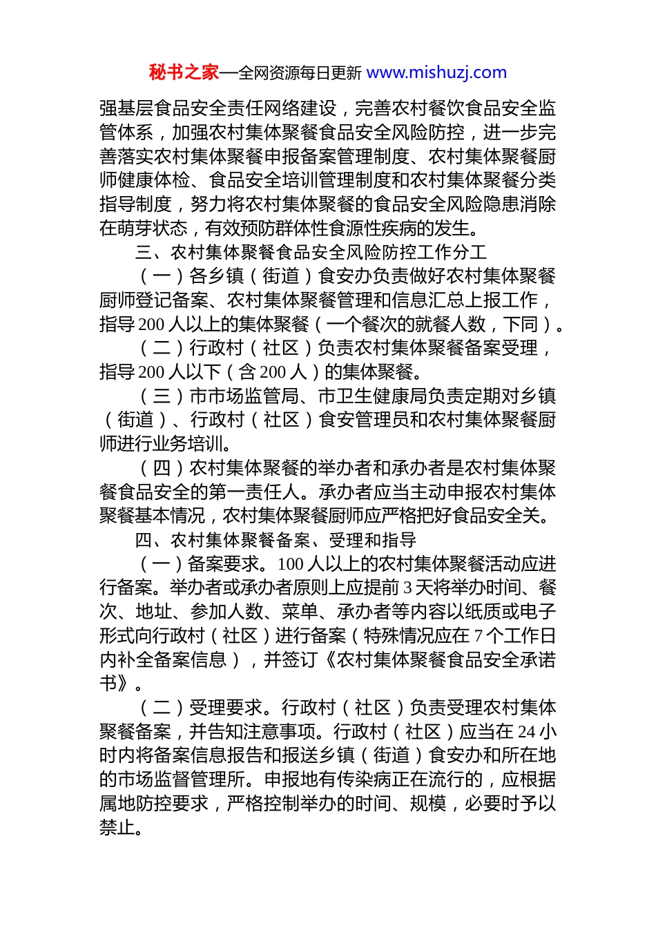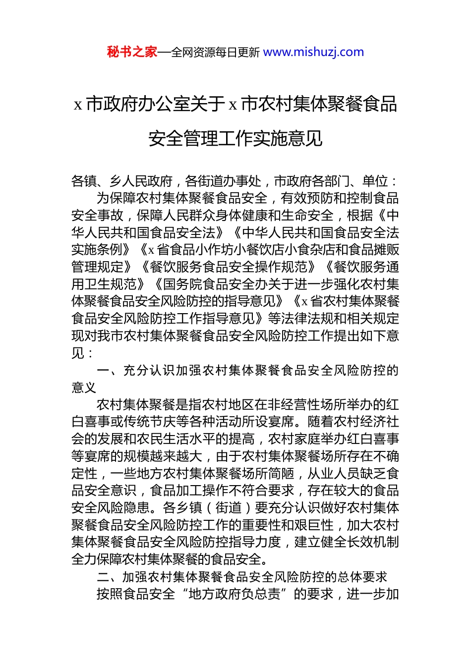 秘书之家—全网资源每日更新 www.mishuzj.comx 市政府办公室关于 x 市农村集体聚餐食品安全管理工作实施意见各镇、乡人民政府,各街道办事处,市政府各部门、单位:为保障农村集体聚餐食品安全,有效预防和控制食品安全事故,保障人民群众身体健康和生命安全,根据《中华人民共和国食品安全法》《中华人民共和国食品安全法实施条例》《x 省食品小作坊小餐饮店小食杂店和食品摊贩管理规定》《餐饮服务食品安全操作规范》《餐饮服务通用卫生规范》《国务院食品安全办关于进一步强化农村集体聚餐食品安全风险防控的指导意见》《x 省农村集体聚餐食品安全风险防控工作指导意见》等法律法规和相关规定现对我市农村集体聚餐食品安全风险防控工作提出如下意见:一、充分认识加强农村集体聚餐食品安全风险防控的意义农村集体聚餐是指农村地区在非经营性场所举办的红白喜事或传统节庆等各种活动所设宴席。随着农村经济社会的发展和农民生活水平的提高,农村家庭举办红白喜事等宴席的规模越来越大,由于农村集体聚餐场所存在不确定性,一些地方农村集体聚餐场所简陋,从业人员缺乏食品安全意识,食品加工操作不符合要求,存在较大的食品安全风险隐患。各乡镇(街道)要充分认识做好农村集体聚餐食品安全风险防控工作的重要性和艰巨性,加大农村集体聚餐食品安全风险防控指导力度,建立健全长效机制全力保障农村集体聚餐的食品安全。二、加强农村集体聚餐食品安全风险防控的总体要求按照食品安全“地方政府负总责”的要求,进一步加秘书之家—全网资源每日更新 www.mishuzj.com强基层食品安全责任网络建设,完善农村餐饮食品安全监管体系,加强农村集体聚餐食品安全风险防控,进一步完善落实农村集体聚餐申报备案管理制度、农村集体聚餐厨师健康体检、食品安全培训管理制度和农村集体聚餐分类指导制度,努力将农村集体聚餐的食品安全风险隐患消除在萌芽状态,有效预防群体性食源性疾病的发生。三、农村集体聚餐食品安全风险防控工作分工(一)各乡镇(街道)食安办负责做好农村集体聚餐厨师登记备案、农村集体聚餐管理和信息汇总上报工作,指导 200 人以上的集体聚餐(一个餐次的就餐人数,下同)。(二)行政村(社区)负责农村集体聚餐备案受理,指导 200 人以下(含 200 人)的集体聚餐。(三)市市场监管局、市卫生健康局负责定期对乡镇(街道)、行政村(社区)食安管理员和农村集体聚餐厨师进行业务培训。(四)农村集体聚餐的举办者和承办者是农村集体聚餐食品安全的第一责任人。承办者应当主动申报农村集体聚餐基本情况,农村集体聚餐厨师应严格把好食品安全关。四、农村集体聚餐备案、受理和指导(一)备案要求。100 人以上的农村集体聚餐活动应进行备案。举办者或承办者原则上应提前 3 天将举办时间、餐次、地址、参加人数、菜单、承办者等内容以纸质或电子形式向行政村(社区)进行备案(特殊情况应在 7 个工作日内补全备案信息),并签订《农村集体聚餐食品安全承诺书》。(二)受理要求。行政村(社区)负责受理农村集体聚餐备案,并告知注意事项。行政村(社区)应当在 24 小时内将备案信息报告和报送乡镇(街道)食安办和所在地的市场监督管理所。申报地有传染病正在流行的,应根据属地防控要求,严格控制举办的时间、规模,必要时予以禁止。秘书之家—全网资源每日更新 www.mishuzj.com(三)分类指导。各乡镇(街道)食安办、行政村(社区)根据农村集体聚餐的规模,承担指导任务。指导方式可采取现场指导或远程视频指导等方式。(四)数字赋能。鼓励运用信息化手段开展农村集体聚餐报告管理、承办者登记备案管理和食品安全知识培训鼓励农村聚餐举办者或农村聚餐承办者对供餐过程进行全程录像,流动餐车加装 gps、监控设备等,并将视频保存 7天以上。五、农村集体聚餐厨师管理农村集体聚餐厨师及其他直接接触食品加工制作人员必须每年进行健康检查,取得健康合格证明和食品安全知识培训合格证后方可从事承办农村集体聚餐服务。患有国务院卫生行政部门规定的有碍食品安全疾病的人员,不得从事接触直接入口食品的工作。农村集体聚餐厨师应向所在地乡镇...