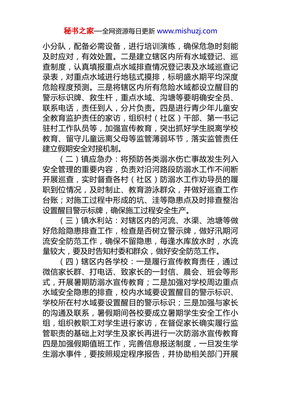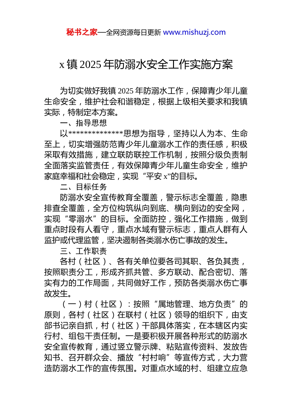 秘书之家—全网资源每日更新 www.mishuzj.comx 镇 2025 年防溺水安全工作实施方案为切实做好我镇 2025 年防溺水工作,保障青少年儿童生命安全,维护社会和谐稳定,根据上级相关要求和我镇实际,特制定本方案。一、指导思想以**************思想为指导,坚持以人为本、生命至上,切实增强防范青少年儿童溺水工作的责任感,积极采取有效措施,建立联防联控工作机制,按照分级负责制全面落实监管责任,有效保障青少年儿童生命安全,维护家庭幸福和社会稳定,实现“平安 x”的目标。二、目标任务防溺水安全宣传教育全覆盖,警示标志全覆盖,隐患排查全覆盖,全方位构筑纵向到底、横向到边的安全网,实现“零溺水”的目标。全面防控,强化工作措施,做到重点时段有人看守,重点水域有警示标志,重点人群有人监护或代理监管,坚决遏制各类溺水伤亡事故的发生。三、工作职责各村(社区)、各有关单位要各司其职、各负其责,按照职责分工,形成齐抓共管、多方联动、配合密切、落实有力的工作局面,共同做好工作,预防各类溺水伤亡事故发生。(一)村(社区):按照“属地管理、地方负责”的原则,各村(社区)在联村(社区)领导的组织下,由支部书记亲自抓,村(社区)干部具体落实,在本辖区内实行村、组包干责任制。一是要积极开展各种形式的防溺水安全宣传教育,通过竖立警示牌、粘贴宣传资料、发放告知书、召开群众会、播放“村村响”等宣传方式,大力营造防溺水工作的宣传氛围。对重点水域的村、组建立应急秘书之家—全网资源每日更新 www.mishuzj.com小分队,配备必需设备,进行培训演练,确保危急时刻能及时应对,有效处置。二是建立辖区内所有水域登记、巡查制度,认真填报重点水域排查情况登记表及水域巡查记录表,对重点水域进行地毯式摸排,标明盛水期平均深度危险程度预测。三是将辖区内所有危险水域都设立醒目的警示标识牌、救生杆,重点水域、沟塘等要明确安全员、联系电话,责任到人,分片负责。四是进行青少年儿童安全教育监护责任的家访,组织村(社区)干部、第一书记驻村工作队员等,加强宣传教育,突出抓好学生脱离学校教育、留守儿童远离父母等监管薄弱环节,落实监管责任建立假期安全对接机制。(二)镇应急办:将预防各类溺水伤亡事故发生列入安全管理的重要内容,负责对沿河路段防溺水工作不间断开展巡查,实时督查各村(社区)防溺水工作劝导员的履职到位情况,及时制止、教育游泳群众,并做好巡查工作台账;对施工过程中形成的坑、洼等隐患点及时排查整治设置醒目警示标牌,确保施工过程安全生产。(三)镇水利站:对辖区内的河流、水渠、池塘等做好危险隐患排查工作,检查是否树立警示牌,做好汛期河流安全防范工作,确保不留隐患,每逢水库放水时,水流量较大,要及时告知村委和群众,做好安全防范工作。(四)辖区内各学校:一是履行宣传教育责任,通过微信家长群、打电话、致家长的一封信、晨会、班会等形式,开展暑期防溺水宣传教育;二是加强对学校周边重点水域安全隐患的排查,校内水域要设置醒目的警示标识、学校所在村水域要设置醒目的警示标识;三是加强与家长的沟通及联系,暑假期间各校要成立暑期学生安全工作小组,组织教职工对学生进行家访,在督促家长确实履行监管职责的基础上对学生及家长再进行一次防溺水宣传教育四是加强假期值班工作,完善信息报送制度,一旦发生学生溺水事件,要按照规定程序报告,并协助相关部门开展秘书之家—全网资源每日更新 www.mishuzj.com工作。(五)卫生院:及时组织对溺水事故的救援,配合学校做好预防溺水宣传教育工作,帮助学生学习和掌握正确的救人自救常识。(六)镇妇联、团委、民政:发挥妇联、共青团、少先队和青年志愿者作用,开展形式多样的防溺水教育宣传活动,向青少年儿童特别是留守儿童及其监护人宣传讲解防溺水安全知识。(七)镇纪委:负责对全镇的防溺水工作开展监督检查,以及配合县纪委监委开展调查取证和问责追责工作。四、工作要求(一)提高认识,加强领导。预防各类溺水伤亡事故发生是各村(社区)、各相关单位义不容辞的责任和义务各村(社区)、各相关单位要树立“生命至上、...
