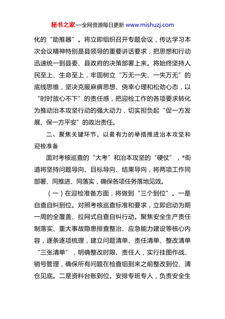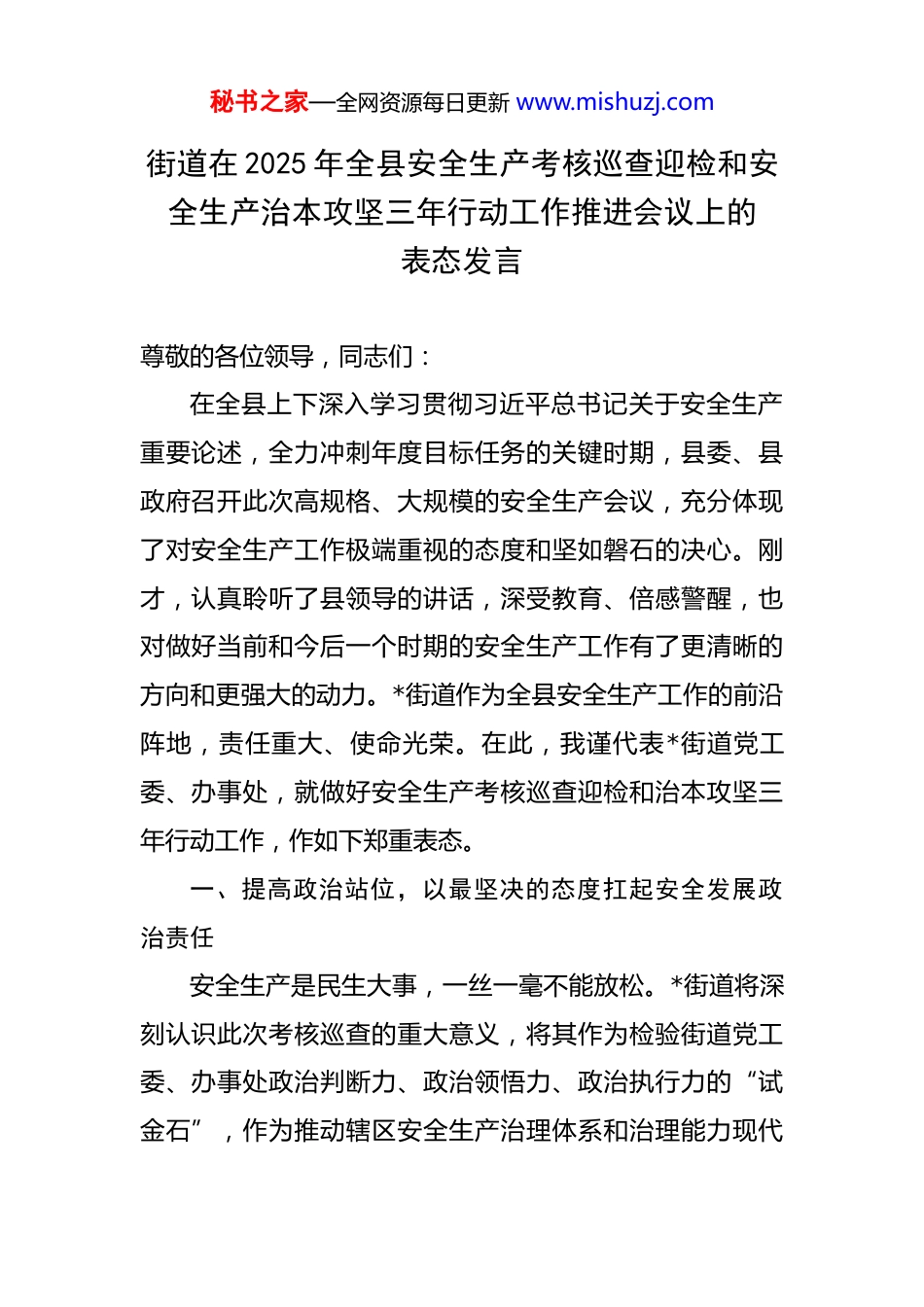 秘书之家—全网资源每日更新 www.mishuzj.com街道在 2025 年全县安全生产考核巡查迎检和安全生产治本攻坚三年行动工作推进会议上的表态发言 尊敬的各位领导,同志们:在全县上下深入学习贯彻习近平总书记关于安全生产重要论述,全力冲刺年度目标任务的关键时期,县委、县政府召开此次高规格、大规模的安全生产会议,充分体现了对安全生产工作极端重视的态度和坚如磐石的决心。刚才,认真聆听了县领导的讲话,深受教育、倍感警醒,也对做好当前和今后一个时期的安全生产工作有了更清晰的方向和更强大的动力。*街道作为全县安全生产工作的前沿阵地,责任重大、使命光荣。在此,我谨代表*街道党工委、办事处,就做好安全生产考核巡查迎检和治本攻坚三年行动工作,作如下郑重表态。一、提高政治站位,以最坚决的态度扛起安全发展政治责任安全生产是民生大事,一丝一毫不能放松。*街道将深刻认识此次考核巡查的重大意义,将其作为检验街道党工委、办事处政治判断力、政治领悟力、政治执行力的“试金石”,作为推动辖区安全生产治理体系和治理能力现代秘书之家—全网资源每日更新 www.mishuzj.com化的“助推器”。将立即组织召开专题会议,传达学习本次会议精神特别是县领导的重要讲话要求,把思想和行动迅速统一到县委、县政府的决策部署上来。将始终坚持人民至上、生命至上,牢固树立“万无一失、一失万无”的底线思维,坚决克服麻痹思想、侥幸心理和松劲心态,以“时时放心不下”的责任感,把迎检工作的各项要求转化为推动治本攻坚行动的强大动力,切实担负起“促一方发展、保一方平安”的政治责任。二、聚焦关键环节,以最有力的举措推进治本攻坚和迎检准备面对考核巡查的“大考”和治本攻坚的“硬仗”,*街道将坚持问题导向、目标导向、结果导向,将两项工作同部署、同推进、同落实,确保各项任务落地见效。(一)在迎检准备方面,将做到“三个到位”。一是自查自纠到位。对照考核巡查标准和要求,立即启动为期一周的全覆盖、拉网式自查自纠行动。聚焦安全生产责任制落实、重大事故隐患排查整治、应急能力建设等核心内容,逐条逐项梳理,建立问题清单、责任清单、整改清单“三张清单”,明确整改时限、责任人,实行挂图作战、销号管理,确保所有问题在检查组到来之前整改到位、清仓见底。二是资料台账到位。安排专班专人,负责安全生秘书之家—全网资源每日更新 www.mishuzj.com产各类文件、记录、台账的收集、整理、归档工作。确保资料齐全、分类清晰、逻辑严密、数据真实准确,能够全面、客观、真实地反映街道安全生产工作全貌,决不让档案资料成为迎检工作的短板。三是服务配合到位。坚决服从巡查组的统一安排,全力做好沟通协调、后勤保障等各项工作。对巡查组指出的问题、提出的意见,诚恳接受、照单全收,做到不回避、不遮掩、不推诿,并第一时间组织研究、制定方案、坚决整改,确保事事有回音、件件有着落。(二)在治本攻坚行动方面,将突出“三个狠抓”。一是狠抓隐患排查整治。坚持标本兼治、重在治本,以安全生产治本攻坚三年行动为总抓手,深入推进重大事故隐患动态清零。聚焦消防、燃气、建筑施工、道路交通、自建房、人员密集场所等重点行业领域,发挥网格化管理优势,动员社区、企业各方力量,开展常态化、专业化、精准化的风险隐患排查。对发现的隐患,坚决做到发现一处、整改一处、销号一处,形成闭环管理,坚决遏制重特大事故发生。二是狠抓安全基础提升。加大安全投入,推动老旧小区消防设施改造、燃气安全装置更新等民生工程。加强对企业负责人、安全管理人员和一线从业者的安全教育培训,提升全民安全意识和应急避险能力。完善应秘书之家—全网资源每日更新 www.mishuzj.com急预案,定期组织开展实战化应急演练,检验预案、锻炼队伍、磨合机制,提升街道整体应急处置水平。三是狠抓长效机制建设。深刻剖析隐患背后深层次矛盾和原因,举一反三,将行之有效的做法固化为制度规范。进一步健全“党政同责、‘一岗双责’、齐抓共管、失职追责”的安全生产责任体系,压实企业主体责任,推动企业由被动接受监管向主动加强管理转变,从根本上提升街道本质安全水...