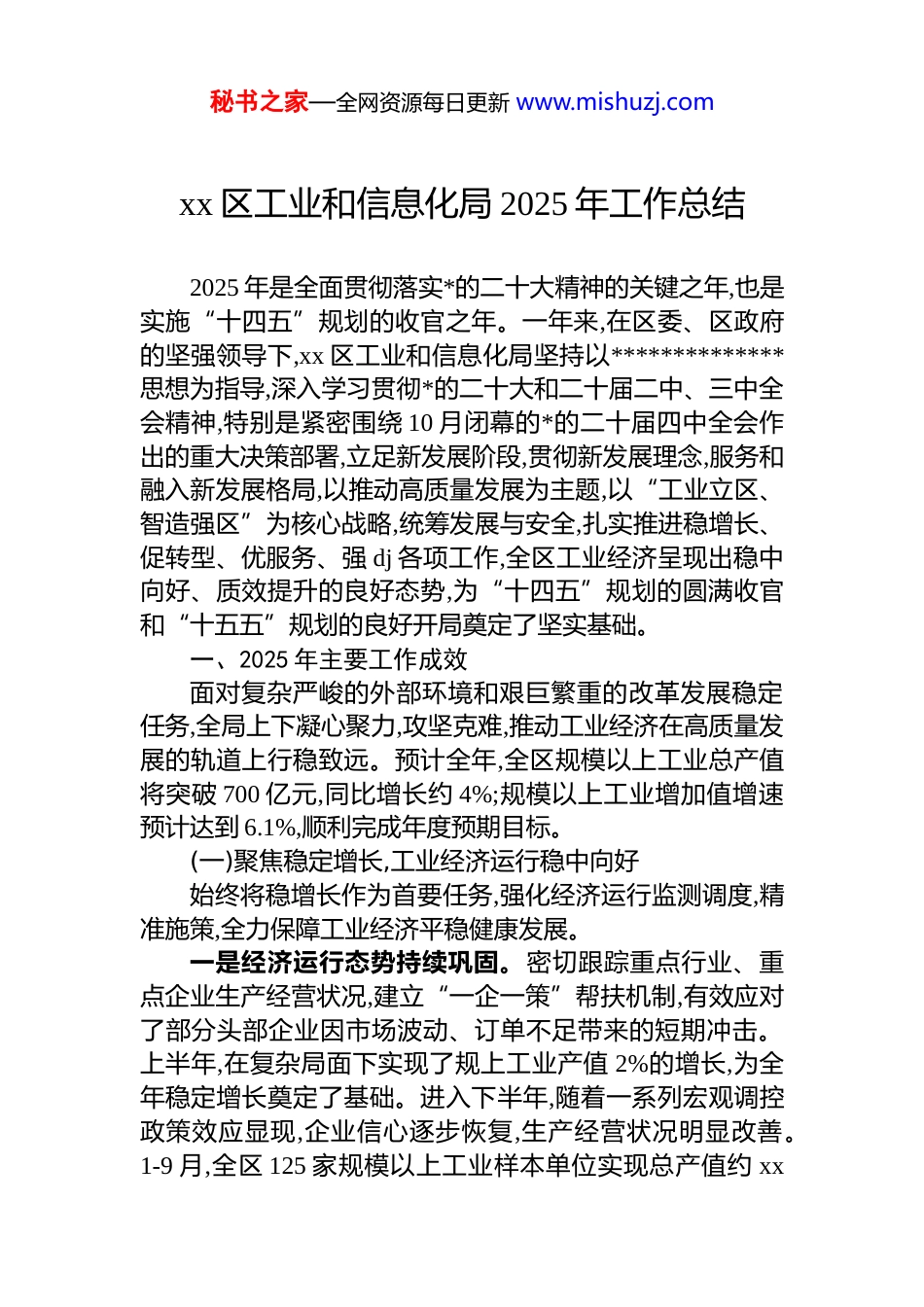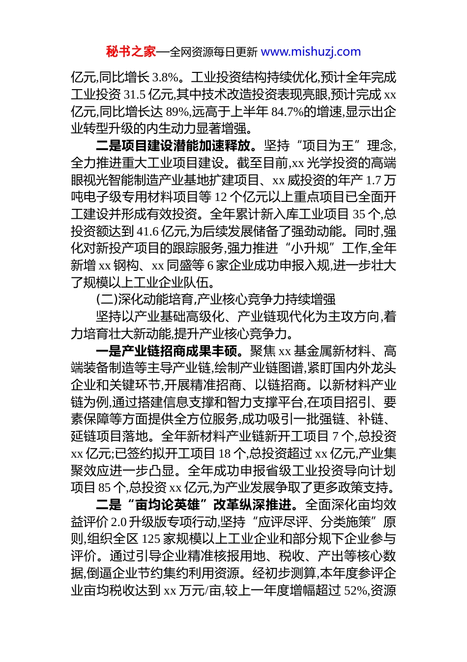 秘书之家—全网资源每日更新 www.mishuzj.comxx 区工业和信息化局 2025 年工作总结2025 年是全面贯彻落实*的二十大精神的关键之年,也是实施“十四五”规划的收官之年。一年来,在区委、区政府的坚强领导下,xx 区工业和信息化局坚持以**************思想为指导,深入学习贯彻*的二十大和二十届二中、三中全会精神,特别是紧密围绕 10 月闭幕的*的二十届四中全会作出的重大决策部署,立足新发展阶段,贯彻新发展理念,服务和融入新发展格局,以推动高质量发展为主题,以“工业立区、智造强区”为核心战略,统筹发展与安全,扎实推进稳增长、促转型、优服务、强 dj 各项工作,全区工业经济呈现出稳中向好、质效提升的良好态势,为“十四五”规划的圆满收官和“十五五”规划的良好开局奠定了坚实基础。一、2025 年主要工作成效面对复杂严峻的外部环境和艰巨繁重的改革发展稳定任务,全局上下凝心聚力,攻坚克难,推动工业经济在高质量发展的轨道上行稳致远。预计全年,全区规模以上工业总产值将突破 700 亿元,同比增长约 4%;规模以上工业增加值增速预计达到 6.1%,顺利完成年度预期目标。(一)聚焦稳定增长,工业经济运行稳中向好始终将稳增长作为首要任务,强化经济运行监测调度,精准施策,全力保障工业经济平稳健康发展。一是经济运行态势持续巩固。密切跟踪重点行业、重点企业生产经营状况,建立“一企一策”帮扶机制,有效应对了部分头部企业因市场波动、订单不足带来的短期冲击。上半年,在复杂局面下实现了规上工业产值 2%的增长,为全年稳定增长奠定了基础。进入下半年,随着一系列宏观调控政策效应显现,企业信心逐步恢复,生产经营状况明显改善。1-9 月,全区 125 家规模以上工业样本单位实现总产值约 xx秘书之家—全网资源每日更新 www.mishuzj.com亿元,同比增长 3.8%。工业投资结构持续优化,预计全年完成工业投资 31.5 亿元,其中技术改造投资表现亮眼,预计完成 xx亿元,同比增长达 89%,远高于上半年 84.7%的增速,显示出企业转型升级的内生动力显著增强。二是项目建设潜能加速释放。坚持“项目为王”理念,全力推进重大工业项目建设。截至目前,xx 光学投资的高端眼视光智能制造产业基地扩建项目、xx 威投资的年产 1.7 万吨电子级专用材料项目等 12 个亿元以上重点项目已全面开工建设并形成有效投资。全年累计新入库工业项目 35 个,总投资额达到 41.6 亿元,为后续发展储备了强劲动能。同时,强化对新投产项目的跟踪服务,强力推进“小升规”工作,全年新增 xx 钢构、xx 同盛等 6 家企业成功申报入规,进一步壮大了规模以上工业企业队伍。(二)深化动能培育,产业核心竞争力持续增强坚持以产业基础高级化、产业链现代化为主攻方向,着力培育壮大新动能,提升产业核心竞争力。一是产业链招商成果丰硕。聚焦 xx 基金属新材料、高端装备制造等主导产业链,绘制产业链图谱,紧盯国内外龙头企业和关键环节,开展精准招商、以链招商。以新材料产业链为例,通过搭建信息支撑和智力支撑平台,在项目招引、要素保障等方面提供全方位服务,成功吸引一批强链、补链、延链项目落地。全年新材料产业链新开工项目 7 个,总投资xx 亿元;已签约拟开工项目 18 个,总投资超过 xx 亿元,产业集聚效应进一步凸显。全年成功申报省级工业投资导向计划项目 85 个,总投资 xx 亿元,为产业发展争取了更多政策支持。二是“亩均论英雄”改革纵深推进。全面深化亩均效益评价 2.0 升级版专项行动,坚持“应评尽评、分类施策”原则,组织全区 125 家规模以上工业企业和部分规下企业参与评价。通过引导企业精准核报用地、税收、产出等核心数据,倒逼企业节约集约利用资源。经初步测算,本年度参评企业亩均税收达到 xx 万元/亩,较上一年度增幅超过 52%,资源秘书之家—全网资源每日更新 www.mishuzj.com配置效率和土地产出效益得到显著提升。评价结果被广泛应用于资源要素差别化配置,有力地促进了产业结构优化和发展方式转变。三是特色产业集群优势更加巩固。依托 xx 基金属新材料省级中小企业特色产业集群,充分发挥 xx 铜业等链主企业的引领带动作用,推动产业链上下游协同发展。在年度复核中,该...