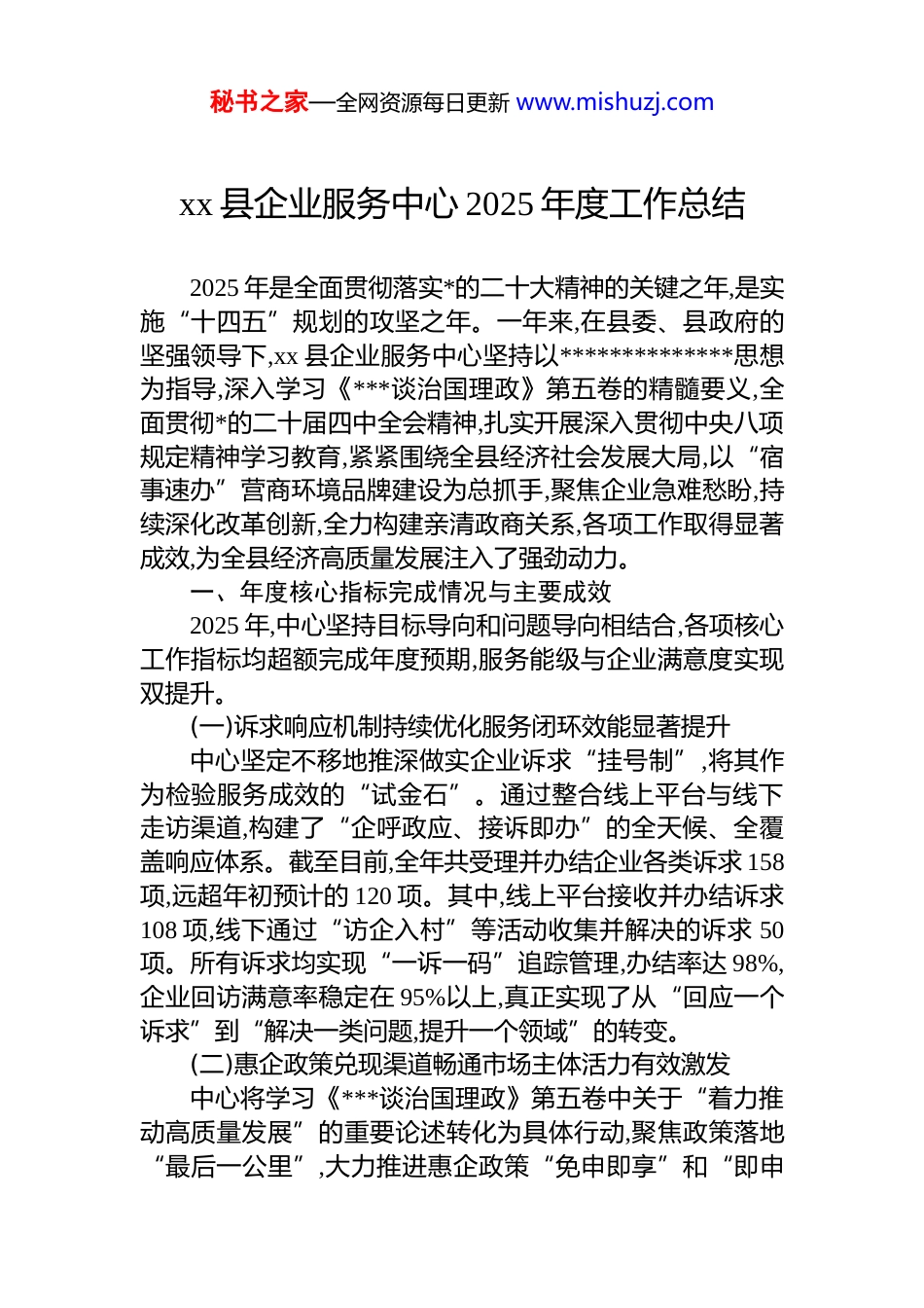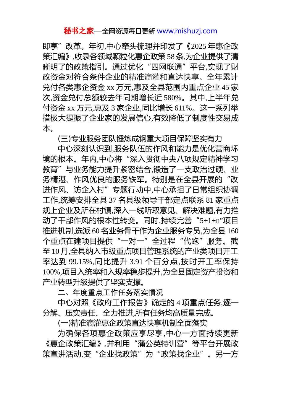 秘书之家—全网资源每日更新 www.mishuzj.comxx 县企业服务中心 2025 年度工作总结2025 年是全面贯彻落实*的二十大精神的关键之年,是实施“十四五”规划的攻坚之年。一年来,在县委、县政府的坚强领导下,xx 县企业服务中心坚持以**************思想为指导,深入学习《***谈治国理政》第五卷的精髓要义,全面贯彻*的二十届四中全会精神,扎实开展深入贯彻中央八项规定精神学习教育,紧紧围绕全县经济社会发展大局,以“宿事速办”营商环境品牌建设为总抓手,聚焦企业急难愁盼,持续深化改革创新,全力构建亲清政商关系,各项工作取得显著成效,为全县经济高质量发展注入了强劲动力。一、年度核心指标完成情况与主要成效2025 年,中心坚持目标导向和问题导向相结合,各项核心工作指标均超额完成年度预期,服务能级与企业满意度实现双提升。(一)诉求响应机制持续优化服务闭环效能显著提升中心坚定不移地推深做实企业诉求“挂号制”,将其作为检验服务成效的“试金石”。通过整合线上平台与线下走访渠道,构建了“企呼政应、接诉即办”的全天候、全覆盖响应体系。截至目前,全年共受理并办结企业各类诉求 158项,远超年初预计的 120 项。其中,线上平台接收并办结诉求108 项,线下通过“访企入村”等活动收集并解决的诉求 50项。所有诉求均实现“一诉一码”追踪管理,办结率达 98%,企业回访满意率稳定在 95%以上,真正实现了从“回应一个诉求”到“解决一类问题,提升一个领域”的转变。(二)惠企政策兑现渠道畅通市场主体活力有效激发中心将学习《***谈治国理政》第五卷中关于“着力推动高质量发展”的重要论述转化为具体行动,聚焦政策落地“最后一公里”,大力推进惠企政策“免申即享”和“即申秘书之家—全网资源每日更新 www.mishuzj.com即享”改革。年初,中心牵头梳理并印发了《2025 年惠企政策汇编》,收录各领域颗粒化惠企政策 58 条,为企业提供了清晰明了的政策指引。通过优化“四网联通”平台,实现了财政资金对符合条件企业的精准滴灌和直达快享。全年累计兑付各类惠企资金 xx 万元,惠及全县范围内重点企业 45 家次,资金兑付总额较去年同期增长近 580%。其中,上半年兑付资金 xx 万元,惠及 3 家企业,同比增长 611%。这一系列举措极大提振了企业家的发展信心,有效降低了制度性交易成本。(三)专业服务团队锤炼成钢重大项目保障坚实有力中心深刻认识到,服务队伍的作风和能力是优化营商环境的根本。年内,中心将“深入贯彻中央八项规定精神学习教育”与业务能力提升紧密结合,锻造了一支政治过硬、业务精湛、作风优良的服务铁军。特别是在全县开展的“改进作风、访企入村”专题行动中,中心承担了日常组织协调工作,统筹安排全县 37 名县级领导干部定点联系 81 家重点规上企业及所在村镇,深入一线听取意见、解决难题,有力推动了干部作风的根本性转变。同时,持续完善“5+1+n”项目推进机制,选派 60 名业务骨干作为企业服务专员,为全县 160个重点在建项目提供“一对一”全过程“代跑”服务。截至 10 月,全县纳入市级重点项目管理系统的产业类项目开工率达到 99.15%,同比提升 3.91 个百分点,按时开工率保持100%,项目入统率和入规率稳步提升,为全县固定资产投资和产业转型升级提供了坚实支撑。二、年度重点工作任务落实情况中心对照《政府工作报告》确定的 4 项重点任务,逐一分解、压实责任、全力推进,所有任务均高质量完成。(一)精准滴灌惠企政策直达快享机制全面落实为确保各项惠企政策应享尽享,中心一方面持续更新《惠企政策汇编》,并利用“蒲公英特训营”等平台开展政策宣讲活动,变“企业找政策”为“政策找企业”。另一方秘书之家—全网资源每日更新 www.mishuzj.com面,依托大数据技术对企业进行精准画像,主动筛选符合“免申即享”条件的企业名单,并协调财政、税务等部门简化兑付流程。全年的资金兑付实践表明,“免申即享”模式已成为我县激发企业活力的重要引擎,尤其在支持科技创新和专精特新企业发展方面成效卓著。(二)全程帮办企业服务专员制度持续深化中心起草并推动实施了《xx 县企业服务专员服务三化改革方案》,以标准化、专业化、规范化为目标,进一步明确了...