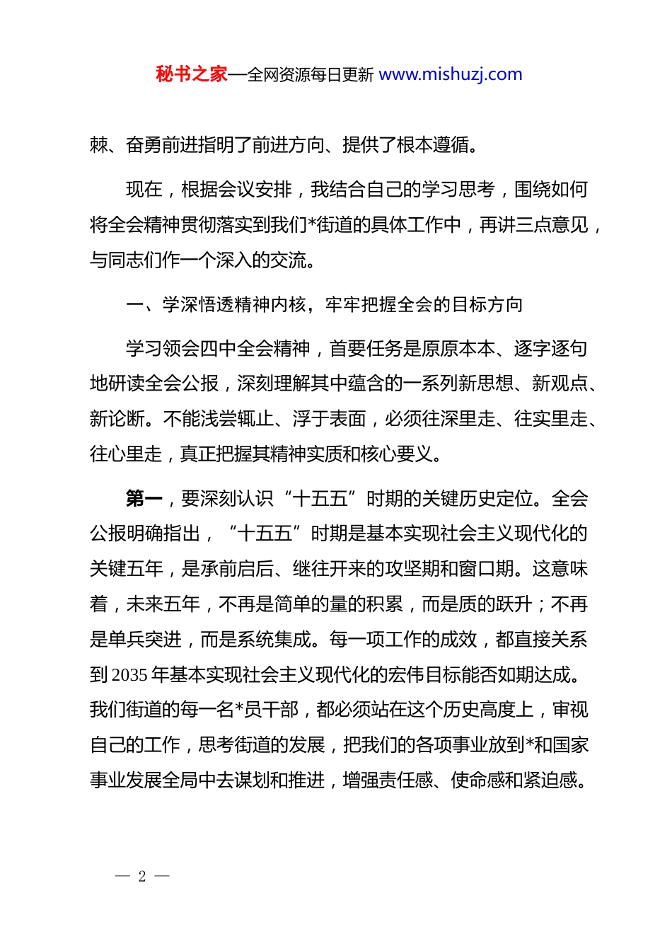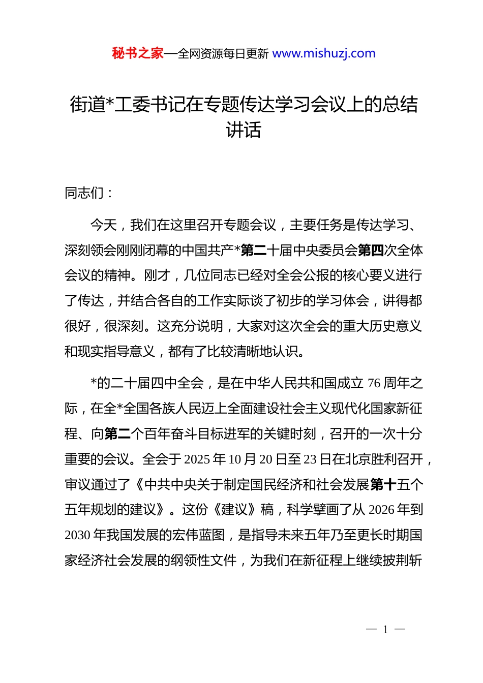 秘书之家—全网资源每日更新 www.mishuzj.com街道*工委书记在专题传达学习会议上的总结讲话同志们:今天,我们在这里召开专题会议,主要任务是传达学习、深刻领会刚刚闭幕的中国共产*第二十届中央委员会第四次全体会议的精神。刚才,几位同志已经对全会公报的核心要义进行了传达,并结合各自的工作实际谈了初步的学习体会,讲得都很好,很深刻。这充分说明,大家对这次全会的重大历史意义和现实指导意义,都有了比较清晰地认识。*的二十届四中全会,是在中华人民共和国成立 76 周年之际,在全*全国各族人民迈上全面建设社会主义现代化国家新征程、向第二个百年奋斗目标进军的关键时刻,召开的一次十分重要的会议。全会于 2025 年 10 月 20 日至 23 日在北京胜利召开,审议通过了《中共中央关于制定国民经济和社会发展第十五个五年规划的建议》。这份《建议》稿,科学擘画了从 2026 年到2030 年我国发展的宏伟蓝图,是指导未来五年乃至更长时期国家经济社会发展的纲领性文件,为我们在新征程上继续披荆斩— 1 —秘书之家—全网资源每日更新 www.mishuzj.com棘、奋勇前进指明了前进方向、提供了根本遵循。现在,根据会议安排,我结合自己的学习思考,围绕如何将全会精神贯彻落实到我们*街道的具体工作中,再讲三点意见,与同志们作一个深入的交流。一、学深悟透精神内核,牢牢把握全会的目标方向学习领会四中全会精神,首要任务是原原本本、逐字逐句地研读全会公报,深刻理解其中蕴含的一系列新思想、新观点、新论断。不能浅尝辄止、浮于表面,必须往深里走、往实里走、往心里走,真正把握其精神实质和核心要义。第一,要深刻认识“十五五”时期的关键历史定位。全会公报明确指出,“十五五”时期是基本实现社会主义现代化的关键五年,是承前启后、继往开来的攻坚期和窗口期。这意味着,未来五年,不再是简单的量的积累,而是质的跃升;不再是单兵突进,而是系统集成。每一项工作的成效,都直接关系到 2035 年基本实现社会主义现代化的宏伟目标能否如期达成。我们街道的每一名*员干部,都必须站在这个历史高度上,审视自己的工作,思考街道的发展,把我们的各项事业放到*和国家事业发展全局中去谋划和推进,增强责任感、使命感和紧迫感。— 2 —秘书之家—全网资源每日更新 www.mishuzj.com第二,要准确把握以高质量发展为主题的战略导向。全会精神通篇贯穿着高质量发展这条主线。公报提出的一系列目标任务,无论是构建现代化产业体系、强化国家战略科技力量,还是全面推进乡村振兴、促进区域协调发展,最终都指向发展的质量和效益。对于我们街道而言,高质量发展不是一个空洞的概念。它体现在我们经济发展的“含金量”上,要求我们不能只盯着传统的指标,更要关注科技创新企业的引进、楼宇经济的坪效、辖区商圈的活力;它体现在城市管理的“精细度”上,要求我们从群众身边的一条路、一盏灯、一个井盖做起,下足“绣花”功夫;它体现在公共服务的“满意度”上,要求我们的服务供给更加均衡、更加优质、更加精准地对接群众需求。第三,要坚定贯彻全面深化改革和推进治理能力现代化的核心要求。改革是发展的根本动力。全会强调,要坚定不移推进全面深化改革,着力破解深层次体制机制障碍,为高质量发展注入强大动能。同时,全会也对推进国家治理体系和治理能力现代化作出了新的重大部署。这与我们基层工作息息相关。街道作为国家治理体系的“神经末梢”,是*和政府联系群众、服务群众的“最后一公里”。全会释放出的强烈信号是,基层— 3 —秘书之家—全网资源每日更新 www.mishuzj.com治理必须向更高效能、更高水平迈进。这意味着过去的“老办法”可能不灵了,过去的“旧路径”可能走不通了。我们必须以改革的精神、创新的勇气,去探索基层治理的新模式、新手段,切实提升我们应对复杂局面、服务人民群众的本领。二、立足街道职能定位,持续提升基层治理能力水平学习的目的全在于应用。将四中全会描绘的宏伟蓝图转化为*街道的生动实践,关键在于找准结合点和发力点,把街道的职能定位与全会的要求部署精准对接。街道办事处作为区委、区政府的派出机关,承担...
