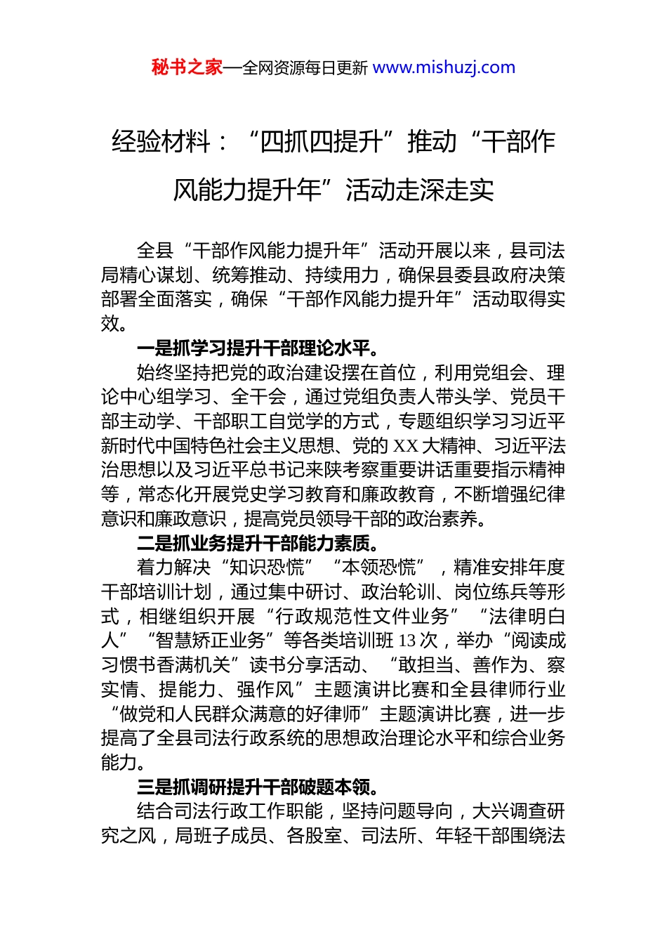 秘书之家—全网资源每日更新 www.mishuzj.com经验材料:“四抓四提升”推动“干部作风能力提升年”活动走深走实全县“干部作风能力提升年”活动开展以来,县司法局精心谋划、统筹推动、持续用力,确保县委县政府决策部署全面落实,确保“干部作风能力提升年”活动取得实效。一是抓学习提升干部理论水平。始终坚持把党的政治建设摆在首位,利用党组会、理论中心组学习、全干会,通过党组负责人带头学、党员干部主动学、干部职工自觉学的方式,专题组织学习习近平新时代中国特色社会主义思想、党的 XX 大精神、习近平法治思想以及习近平总书记来陕考察重要讲话重要指示精神等,常态化开展党史学习教育和廉政教育,不断增强纪律意识和廉政意识,提高党员领导干部的政治素养。二是抓业务提升干部能力素质。着力解决“知识恐慌”“本领恐慌”,精准安排年度干部培训计划,通过集中研讨、政治轮训、岗位练兵等形式,相继组织开展“行政规范性文件业务”“法律明白人”“智慧矫正业务”等各类培训班 13 次,举办“阅读成习惯书香满机关”读书分享活动、“敢担当、善作为、察实情、提能力、强作风”主题演讲比赛和全县律师行业“做党和人民群众满意的好律师”主题演讲比赛,进一步提高了全县司法行政系统的思想政治理论水平和综合业务能力。三是抓调研提升干部破题本领。结合司法行政工作职能,坚持问题导向,大兴调查研究之风,局班子成员、各股室、司法所、年轻干部围绕法秘书之家—全网资源每日更新 www.mishuzj.com治政府建设、法治乡村建设、人民调解等司法行政工作重点领域,深入一线扎实开展调研,形成《关于坚持和发展枫桥经验,做好新时代矛盾纠纷排查化解工作》、《从 XX社区看民主法治示范村创建工作》、《关于落实行政复议体制改革加快推进法治政府建设的点滴思考》等调研报告37 篇,在回答和解决现实问题的过程中推动司法行政事业发展。四是抓整改提升干部队伍形象。坚持问题导向,坚持党员领导干部带头,认真查找“干部作风能力提升年”活动 8 个方面存在的突出问题,建立问题清单,找准问题根源,细化完善整改方案和整改措施,逐项抓好整改落实。同时把问题整改和党风廉政建设干部教育管理等工作充分融合,形成党建统领的有机整体确保问题整改取得实效。