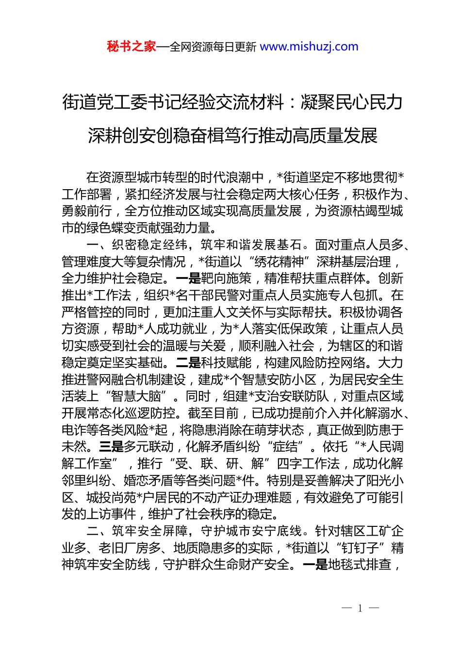 秘书之家—全网资源每日更新 www.mishuzj.com街道党工委书记经验交流材料:凝聚民心民力深耕创安创稳奋楫笃行推动高质量发展在资源型城市转型的时代浪潮中,*街道坚定不移地贯彻*工作部署,紧扣经济发展与社会稳定两大核心任务,积极作为、勇毅前行,全方位推动区域实现高质量发展,为资源枯竭型城市的绿色蝶变贡献强劲力量。一、织密稳定经纬,筑牢和谐发展基石。面对重点人员多、管理难度大等复杂情况,*街道以“绣花精神”深耕基层治理,全力维护社会稳定。一是靶向施策,精准帮扶重点群体。创新推出*工作法,组织*名干部民警对重点人员实施专人包抓。在严格管控的同时,更加注重人文关怀与实际帮扶。积极协调各方资源,帮助*人成功就业,为*人落实低保政策,让重点人员切实感受到社会的温暖与关爱,顺利融入社会,为辖区的和谐稳定奠定坚实基础。二是科技赋能,构建风险防控网络。大力推进警网融合机制建设,建成*个智慧安防小区,为居民安全生活装上“智慧大脑”。同时,组建*支治安联防队,对重点区域开展常态化巡逻防控。截至目前,已成功提前介入并化解溺水、电诈等各类风险*起,将隐患消除在萌芽状态,真正做到防患于未然。三是多元联动,化解矛盾纠纷“症结”。依托“*人民调解工作室”,推行“受、联、研、解”四字工作法,成功化解邻里纠纷、婚恋矛盾等各类问题*件。特别是妥善解决了阳光小区、城投尚苑*户居民的不动产证办理难题,有效避免了可能引发的上访事件,维护了社会秩序的稳定。二、筑牢安全屏障,守护城市安宁底线。针对辖区工矿企业多、老旧厂房多、地质隐患多的实际,*街道以“钉钉子”精神筑牢安全防线,守护群众生命财产安全。一是地毯式排查,— 1 —秘书之家—全网资源每日更新 www.mishuzj.com消除安全隐患“死角”。深入开展安全生产治本攻坚三年行动,建立常态化巡查机制,对*家煤矿、*家重点企业、*家*场所进行全面造册管理。*名干部点对点包抓,确保隐患排查无死角,真正做到事事有人管、时时有人盯、人人有责任、处处有保障。二是闭环式整改,确保隐患彻底“清零”。推行分类理、建清单、定措施、分级管、闭环改“五步工作法”,综合运用人防、技防、工程防、管理防“四防”措施,对*个隐患点进行分类整改。通过严格的整改流程和监督机制,确保隐患得到彻底消除,为城市安全保驾护航。三是实战化演练,提升应急处突“硬实力”。地企联动组建*支救援队伍,修订*个应急预案,并开展*次实战演练。在去年*月*日的强降雨灾害中,街道迅速启动应急预案,仅用*小时就成功疏转安置群众*人,实现“零伤亡”抢通泥石淤积隧道,充分彰显了高效的应急处置能力。三、厚植民生底色,提升群众幸福成色。*街道始终秉持“民生为大、民生为要”的理念,用心用情用力办好民生实事,不断提升群众的幸福指数。一是绿色蝶变,绘就生态宜居新画卷。按照分块美化、整体恢复的思路,实施架空线缆整治等十大专项行动。整合资金*亿元,完成*个生态项目,建成*个主题游园,打造*公里生态廊道,成为宜居宜业的新城区。二是精准服务,托起老年群体“夕阳红”。针对老年人占比*%且多集中在老旧小区的现状,实施拆危治乱、旧房换新居工程,改造提升*个老旧小区,拆迁安置*户居民,惠及*位老人。打造*助老服务品牌,建成街道养老服务中心和社会福利院,开展*场次关心关爱活动,让老年人安享幸福晚年。三是访民问暖,解决群众“急难愁盼”。扎实做好“冬病夏治”,新铺设供暖管网*公里,改造提升老旧管网*公里,分户改造*户。深入开展“访民问暖”活动,通过干部走访、群众反馈,及时解决暖气不热、跑冒滴漏等*个问题,使供暖问题投诉同比下降*%,让群众温暖过冬。— 2 —秘书之家—全网资源每日更新 www.mishuzj.com前路有光,未来可期。*街道将持续深化*工作部署,不断优化工作举措,强化服务功能,在经济发展与社会稳定的道路上稳步迈进,为资源枯竭型城市的绿色转型和高质量发展续写新的辉煌篇章。— 3 —