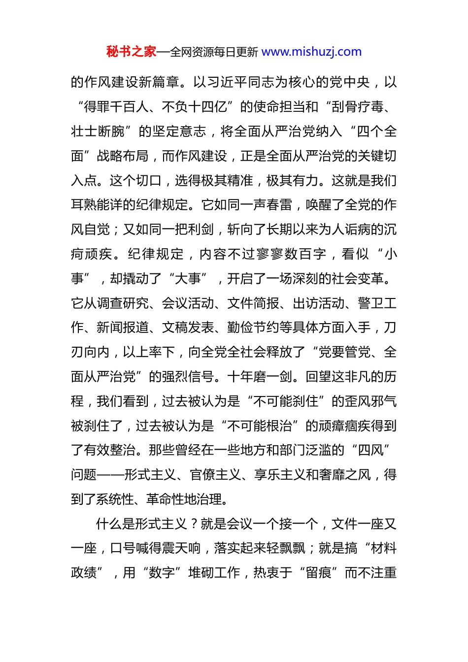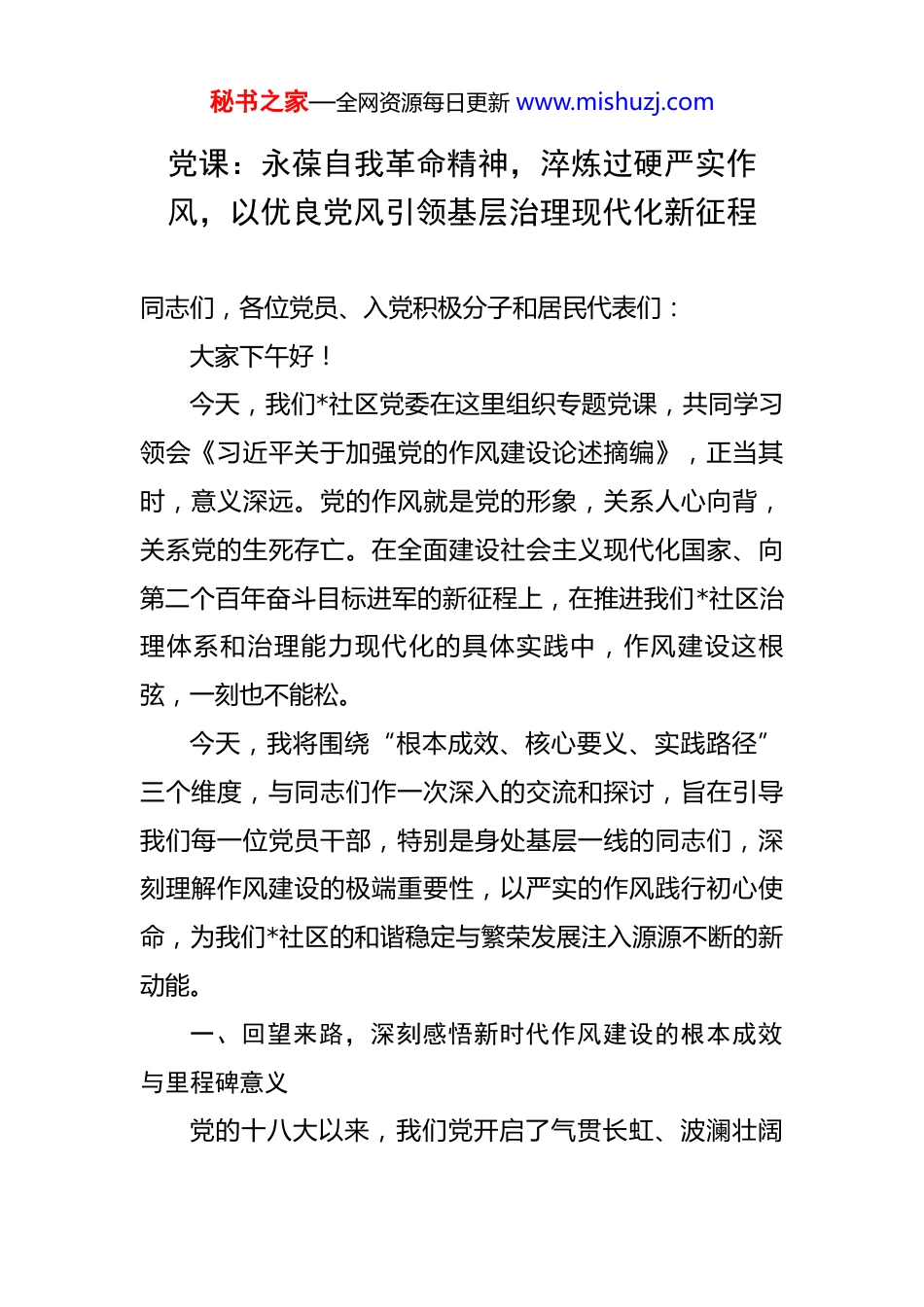 秘书之家—全网资源每日更新 www.mishuzj.com党课:永葆自我革命精神,淬炼过硬严实作风,以优良党风引领基层治理现代化新征程 同志们,各位党员、入党积极分子和居民代表们:大家下午好!今天,我们*社区党委在这里组织专题党课,共同学习领会《习近平关于加强党的作风建设论述摘编》,正当其时,意义深远。党的作风就是党的形象,关系人心向背,关系党的生死存亡。在全面建设社会主义现代化国家、向第二个百年奋斗目标进军的新征程上,在推进我们*社区治理体系和治理能力现代化的具体实践中,作风建设这根弦,一刻也不能松。今天,我将围绕“根本成效、核心要义、实践路径”三个维度,与同志们作一次深入的交流和探讨,旨在引导我们每一位党员干部,特别是身处基层一线的同志们,深刻理解作风建设的极端重要性,以严实的作风践行初心使命,为我们*社区的和谐稳定与繁荣发展注入源源不断的新动能。一、回望来路,深刻感悟新时代作风建设的根本成效与里程碑意义党的十八大以来,我们党开启了气贯长虹、波澜壮阔秘书之家—全网资源每日更新 www.mishuzj.com的作风建设新篇章。以习近平同志为核心的党中央,以“得罪千百人、不负十四亿”的使命担当和“刮骨疗毒、壮士断腕”的坚定意志,将全面从严治党纳入“四个全面”战略布局,而作风建设,正是全面从严治党的关键切入点。这个切口,选得极其精准,极其有力。这就是我们耳熟能详的纪律规定。它如同一声春雷,唤醒了全党的作风自觉;又如同一把利剑,斩向了长期以来为人诟病的沉疴顽疾。纪律规定,内容不过寥寥数百字,看似“小事”,却撬动了“大事”,开启了一场深刻的社会变革。它从调查研究、会议活动、文件简报、出访活动、警卫工作、新闻报道、文稿发表、勤俭节约等具体方面入手,刀刃向内,以上率下,向全党全社会释放了“党要管党、全面从严治党”的强烈信号。十年磨一剑。回望这非凡的历程,我们看到,过去被认为是“不可能刹住”的歪风邪气被刹住了,过去被认为是“不可能根治”的顽瘴痼疾得到了有效整治。那些曾经在一些地方和部门泛滥的“四风”问题——形式主义、官僚主义、享乐主义和奢靡之风,得到了系统性、革命性地治理。什么是形式主义?就是会议一个接一个,文件一座又一座,口号喊得震天响,落实起来轻飘飘;就是搞“材料政绩”,用“数字”堆砌工作,热衷于“留痕”而不注重秘书之家—全网资源每日更新 www.mishuzj.com“留心”“留绩”。什么是官僚主义?就是高高在上,脱离群众,对百姓的呼声听而不闻、对群众的困难视而不见;就是部门之间推诿扯皮,“门好进、脸好看、事难办”;就是不担当、不作为、不负责,信奉“多一事不如少一事”。什么是享乐主义和奢靡之风?就是追求感官刺激,贪图个人享受,精神懈怠,不思进取;就是讲排场、比阔气,超标配备办公用房和公务用车,用公款大吃大喝,修建楼堂馆所,严重损害了党的形象和干群关系。面对这些问题,党中央以雷霆万钧之势,坚持“老虎”“苍蝇”一起打,紧盯关键节点,一个问题一个问题解决,一个节点一个节点坚守。从月饼、粽子、贺卡等“小事”抓起,正风肃纪,驰而不息。据中央纪委国家监委公布的数据,截至 2025 年上半年,全国累计查处违反纪律规定精神问题超过 90 万起,处理党员干部超过 120 万人。这组沉甸甸的数据背后,彰显的是党中央猛药去疴、重典治乱的决心,是党风、政风乃至整个社会风气的焕然一新。在我们*区,仅今年前三季度,就查处相关问题*起,处理*人,充分证明了作风建设没有休止符,越往后执纪越严。根本成效是显而易见的。党心民心为之一振,人民群众看到了我们党自我净化、自我完善的勇气和能力,发自内心地为党点赞。党在人民群众中的威信和形象空前提高,党的执秘书之家—全网资源每日更新 www.mishuzj.com政基础更加坚实巩固。可以说,新时代的作风建设,不仅是一场激浊扬清的风气变革,更是一场固本培元、凝心聚力的政治建设,其成效是历史性的,其意义是里程碑式的。二、寻根溯源,精准把握新时代作风建设的核心要义与政治内涵作风问题绝不是小事,其背后是立场问题、是党性问题,是世界观、人生观、价值观这...