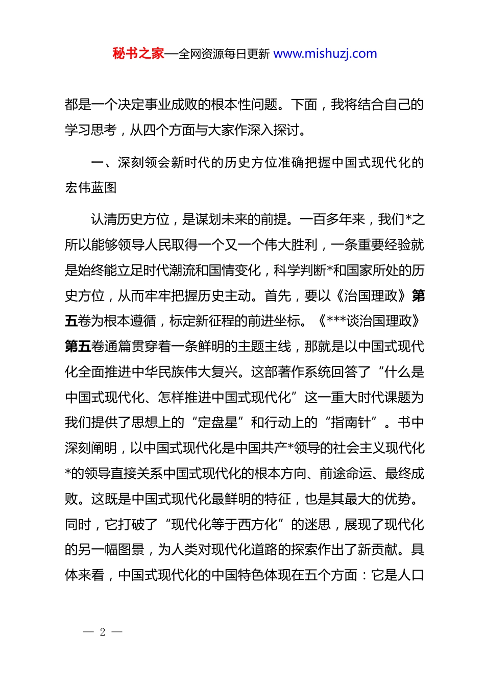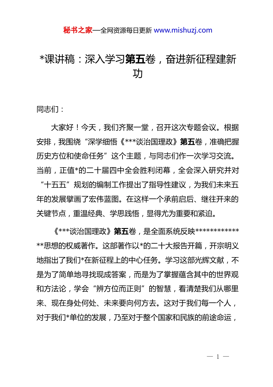 秘书之家—全网资源每日更新 www.mishuzj.com*课讲稿:深入学习第五卷,奋进新征程建新功同志们:大家好!今天,我们齐聚一堂,召开这次专题会议。根据安排,我围绕“深学细悟《***谈治国理政》第五卷,准确把握历史方位和使命任务”这个主题,与同志们作一次学习交流。当前,正值*的二十届四中全会胜利闭幕,全会深入研究并对“十五五”规划的编制工作提出了指导性建议,为我们未来五年的发展擘画了宏伟蓝图。在这样一个承前启后、继往开来的关键节点,重温经典、学思践悟,显得尤为重要和紧迫。《***谈治国理政》第五卷,是全面系统反映**************思想的权威著作。这部著作以*的二十大报告开篇,开宗明义地指出了我们*在新征程上的中心任务。学习这部光辉文献,不是为了简单地寻找现成答案,而是为了掌握蕴含其中的世界观和方法论,学会“辨方位而正则”的智慧,看清楚我们从哪里来、现在身处何处、未来要向何方去。这对于我们每一个人,对于我们*单位的发展,乃至对于整个国家和民族的前途命运,— 1 —秘书之家—全网资源每日更新 www.mishuzj.com都是一个决定事业成败的根本性问题。下面,我将结合自己的学习思考,从四个方面与大家作深入探讨。一、深刻领会新时代的历史方位准确把握中国式现代化的宏伟蓝图认清历史方位,是谋划未来的前提。一百多年来,我们*之所以能够领导人民取得一个又一个伟大胜利,一条重要经验就是始终能立足时代潮流和国情变化,科学判断*和国家所处的历史方位,从而牢牢把握历史主动。首先,要以《治国理政》第五卷为根本遵循,标定新征程的前进坐标。《***谈治国理政》第五卷通篇贯穿着一条鲜明的主题主线,那就是以中国式现代化全面推进中华民族伟大复兴。这部著作系统回答了“什么是中国式现代化、怎样推进中国式现代化”这一重大时代课题为我们提供了思想上的“定盘星”和行动上的“指南针”。书中深刻阐明,以中国式现代化是中国共产*领导的社会主义现代化*的领导直接关系中国式现代化的根本方向、前途命运、最终成败。这既是中国式现代化最鲜明的特征,也是其最大的优势。同时,它打破了“现代化等于西方化”的迷思,展现了现代化的另一幅图景,为人类对现代化道路的探索作出了新贡献。具体来看,中国式现代化的中国特色体现在五个方面:它是人口— 2 —秘书之家—全网资源每日更新 www.mishuzj.com规模巨大的现代化,是全体人民共同富裕的现代化,是物质文明和精神文明相协调的现代化,是人与自然和谐共生的现代化,是走和平发展道路的现代化。这五个方面,不是凭空想象出来的,而是植根于中国的具体国情和深厚的文化底蕴,是我们推进现代化建设必须牢牢把握的现实基点。在实践中,更要遵循其本质要求。这包括坚持中国共产*领导,坚持中国特色社会主义,实现高质量发展,发展全过程人民民主,丰富人民精神世界,实现全体人民共同富裕,促进人与自然和谐共生,推动构建人类命运共同体,创造人类文明新形态。这九个方面的要求,构成了一个内涵丰富、逻辑严密的有机整体,共同指明了中国式现代化的前进方向。中华民族伟大复兴已经进入了不可逆转的历史进程,这正是我们当前所处的宏大历史方位。二、聚焦高质量发展首要任务在深化改革与科技创新中勇毅前行明确了历史方位和宏伟蓝图,接下来的关键就是如何干、怎么走。******在《治国理政》第五卷中明确指出,高质量发展是全面建设社会主义现代化国家的首要任务。而推动高质量发展的两大核心引擎,就是全面深化改革和科技创新。第一,以全面深化改革破除体制障碍,为现代化建设注入— 3 —秘书之家—全网资源每日更新 www.mishuzj.com不竭动力。中国式现代化是在改革开放中不断推进的。面对新征程上的新挑战,特别是各种体制机制障碍,唯有拿出更大的勇气和智慧,坚定不移地推进改革。去年 7 月召开的*的二十届三中全会,吹响了新时代新征程上进一步全面深化改革的号角,审议通过的《中共中央关于进一步全面深化改革、推进中国式现代化的决定》就是一份纲领性的改革宣言。这份《决定》锚定 2035 年基本实现社会主义现代化的总目标,强调要更加注重系统集成、更加注重突出重点、...