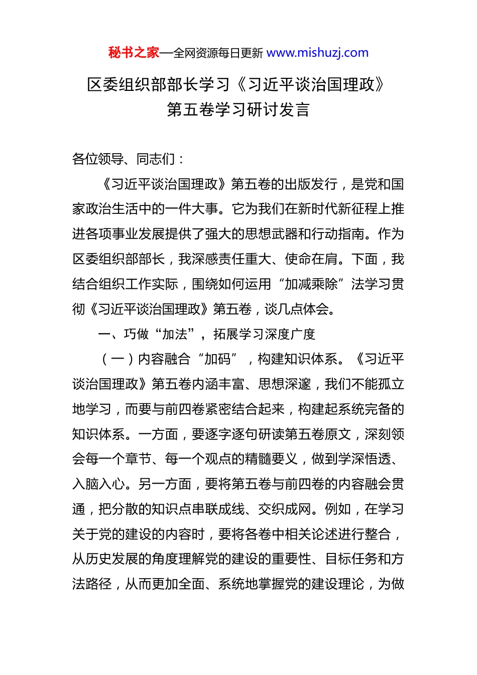秘书之家—全网资源每日更新 www.mishuzj.com区委组织部部长学习《习近平谈治国理政》第五卷学习研讨发言 各位领导、同志们:《习近平谈治国理政》第五卷的出版发行,是党和国家政治生活中的一件大事。它为我们在新时代新征程上推进各项事业发展提供了强大的思想武器和行动指南。作为区委组织部部长,我深感责任重大、使命在肩。下面,我结合组织工作实际,围绕如何运用“加减乘除”法学习贯彻《习近平谈治国理政》第五卷,谈几点体会。一、巧做“加法”,拓展学习深度广度(一)内容融合“加码”,构建知识体系。《习近平谈治国理政》第五卷内涵丰富、思想深邃,我们不能孤立地学习,而要与前四卷紧密结合起来,构建起系统完备的知识体系。一方面,要逐字逐句研读第五卷原文,深刻领会每一个章节、每一个观点的精髓要义,做到学深悟透、入脑入心。另一方面,要将第五卷与前四卷的内容融会贯通,把分散的知识点串联成线、交织成网。例如,在学习关于党的建设的内容时,要将各卷中相关论述进行整合,从历史发展的角度理解党的建设的重要性、目标任务和方法路径,从而更加全面、系统地掌握党的建设理论,为做秘书之家—全网资源每日更新 www.mishuzj.com好组织工作提供坚实的理论支撑。(二)形式多元“加力”,提升学习实效。学习形式的多样性是提高学习效果的关键。我们要打破传统学习模式的局限,实现线上线下学习的有机融合。在线下,要精心组织集中学习研讨活动,邀请专家学者进行专题辅导,开展交流发言,引导党员干部深入思考、相互启发。同时,要注重实地调研学习,组织党员干部到先进地区、基层一线进行考察学习,将理论知识与实际工作相结合,增强学习的针对性和实效性。在线上,要充分利用网络平台的优势,开展线上课程学习、线上交流讨论等活动。通过制作微党课、学习短视频等形式,让学习更加便捷、生动。例如,利用微信公众号、学习强国等平台,定期推送学习内容,方便党员干部随时随地学习。通过线上线下双轮驱动,形成全方位、多层次的学习格局,推动学习活动不断走深走实。二、精做“减法”,优化服务质效水平(一)基层减负“减压”,激发干事活力。基层是各项工作的落脚点,也是矛盾和问题的集中地。我们要坚持为基层松绑减负,让基层干部能够轻装上阵、干事创业。一方面,要严格控制各类文件、会议的数量和规模,精简不必要的检查考核,避免形式主义、官僚主义的干扰。例秘书之家—全网资源每日更新 www.mishuzj.com如,减少重复的报表填写、台账资料整理等工作,让基层干部有更多的时间和精力深入群众、解决实际问题。另一方面,要加大对基层的资源投入和政策支持,为基层干部提供更好的工作条件和发展空间。加强资金、人才、技术等方面的保障,推动基层党组织建设全面进步、全面过硬。同时,要建立健全容错纠错机制,鼓励基层干部大胆创新、勇于担当,为他们营造良好的干事创业环境。(二)群众办事“减负”,增强服务体验。组织部门的工作与群众的利益息息相关。我们要始终坚持以人民为中心的发展思想,聚焦群众办事的难点、痛点问题,不断优化服务流程、提高服务质量。要深入推进“放管服”改革,简化办事程序,减少办事环节,让群众办事更加便捷高效。例如,推行“一站式”服务、“最多跑一次”改革,整合各类服务资源,实现“一窗受理、集成服务”。同时,要加强信息化建设,利用大数据、人工智能等技术手段,打造智慧服务平台,让群众可以通过手机、电脑等终端随时随地办理业务。此外,要加强对服务窗口工作人员的培训和管理,提高他们的服务意识和业务水平,做到热情服务、周到服务,让群众感受到组织部门的关怀和温暖。三、善做“乘法”,推动工作创新发展秘书之家—全网资源每日更新 www.mishuzj.com(一)理论实践“相乘”,激发工作动力。学习的目的在于应用,在于推动工作。我们要将学习《习近平谈治国理政》第五卷的成果转化为推动组织工作创新发展的强大动力。要深刻领会书中蕴含的新思想、新观点、新论断,将其运用到实际工作中去。例如,在干部选拔任用工作中,要坚持德才兼备、以德为先、五湖四海、任人唯贤的原则,选拔出忠诚干净担当的...