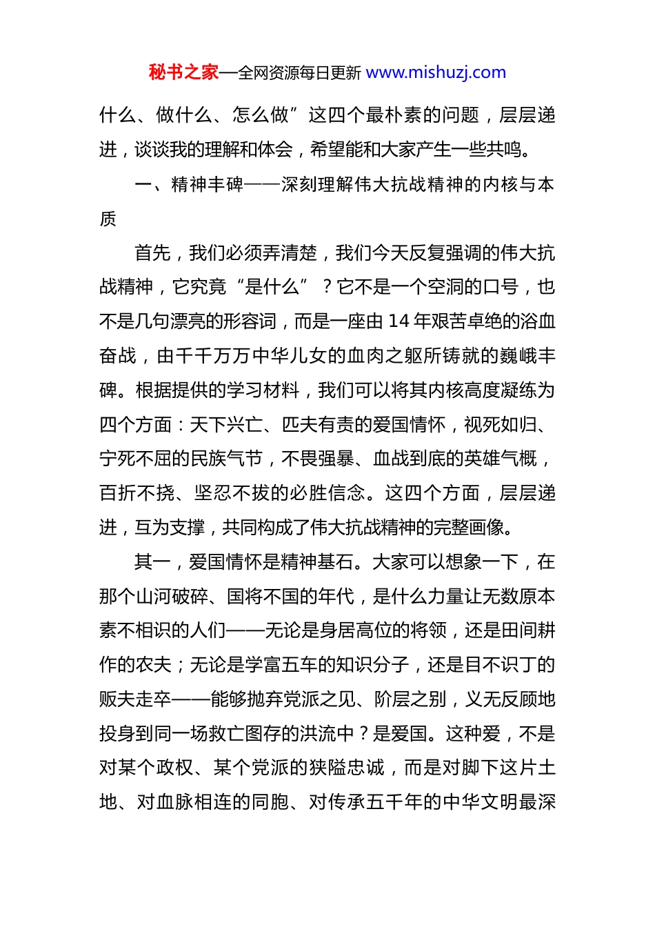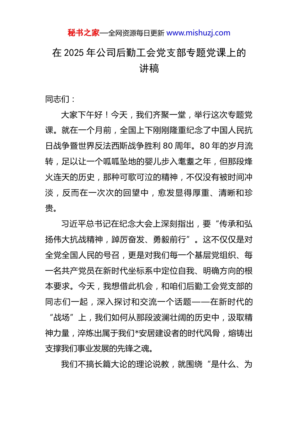 秘书之家—全网资源每日更新 www.mishuzj.com在 2025 年公司后勤工会党支部专题党课上的讲稿 同志们:大家下午好!今天,我们齐聚一堂,举行这次专题党课。就在一个月前,全国上下刚刚隆重纪念了中国人民抗日战争暨世界反法西斯战争胜利 80 周年。80 年的岁月流转,足以让一个呱呱坠地的婴儿步入耄耋之年,但那段烽火连天的历史,那种可歌可泣的精神,不仅没有被时间冲淡,反而在一次次的回望中,愈发显得厚重、清晰和珍贵。习近平总书记在纪念大会上深刻指出,要“传承和弘扬伟大抗战精神,踔厉奋发、勇毅前行”。这不仅仅是对全党全国人民的号召,更是对我们每一个基层党组织、每一名共产党员在新时代坐标系中定位自我、明确方向的根本要求。今天,我想借此机会,和咱们后勤工会党支部的同志们一起,深入探讨和交流一个话题——在新时代的“战场”上,我们如何从那段波澜壮阔的历史中,汲取精神力量,淬炼出属于我们*安居建设者的时代风骨,熔铸出支撑我们事业发展的先锋之魂。我们不搞长篇大论的理论说教,就围绕“是什么、为秘书之家—全网资源每日更新 www.mishuzj.com什么、做什么、怎么做”这四个最朴素的问题,层层递进,谈谈我的理解和体会,希望能和大家产生一些共鸣。一、精神丰碑——深刻理解伟大抗战精神的内核与本质首先,我们必须弄清楚,我们今天反复强调的伟大抗战精神,它究竟“是什么”?它不是一个空洞的口号,也不是几句漂亮的形容词,而是一座由 14 年艰苦卓绝的浴血奋战,由千千万万中华儿女的血肉之躯所铸就的巍峨丰碑。根据提供的学习材料,我们可以将其内核高度凝练为四个方面:天下兴亡、匹夫有责的爱国情怀,视死如归、宁死不屈的民族气节,不畏强暴、血战到底的英雄气概,百折不挠、坚忍不拔的必胜信念。这四个方面,层层递进,互为支撑,共同构成了伟大抗战精神的完整画像。其一,爱国情怀是精神基石。大家可以想象一下,在那个山河破碎、国将不国的年代,是什么力量让无数原本素不相识的人们——无论是身居高位的将领,还是田间耕作的农夫;无论是学富五车的知识分子,还是目不识丁的贩夫走卒——能够抛弃党派之见、阶层之别,义无反顾地投身到同一场救亡图存的洪流中?是爱国。这种爱,不是对某个政权、某个党派的狭隘忠诚,而是对脚下这片土地、对血脉相连的同胞、对传承五千年的中华文明最深秘书之家—全网资源每日更新 www.mishuzj.com沉、最炽热的眷恋。正是这种“天下兴亡,匹夫有责”的集体觉醒,才使得一盘散沙的近代中国以前所未有的姿态团结起来。《大公报》当年的评论一针见血:“今天南北战场上,是争着死,抢着死”,为什么?因为大家坚信,牺牲自己,是为了换取子孙万代的独立自由。这种把个人命运与国家命运紧密相连的家国情怀,是驱动一切行动的原始动力。其二,民族气节是精神脊梁。面对当时在装备、国力上远超我们的日本侵略者,投降、妥协的声音从未断绝,“亡国论”一度甚嚣尘上。但中华民族的优秀儿女们用行动给出了最响亮的回答。从杨靖宇将军腹中只有草根树皮的壮烈牺牲,到“狼牙山五壮士”宁死不降的纵身一跃;从东北抗联八位女战士“我们是中国人,死也不能玷污祖国”的最后呐喊,到“八百壮士”孤军守土的决绝。他们所展现的,正是中华民族“威武不能屈,富贵不能淫”的铮铮铁骨。这种视死如归、宁死不屈的民族气节,挺直了中华民族在危亡之际不曾弯曲的脊梁,宣告了任何外来强权都无法征服这片土地和这片土地上的人民。其三,英雄气概是精神锋芒。精神不是虚无缥缈的,它必须通过行动展现其力量。抗战精神的锋芒,就体现在那种“狭路相逢勇者胜”的英雄气概上。这种气概,体现秘书之家—全网资源每日更新 www.mishuzj.com在正面战场上的无数次惨烈会战,国民党爱国将士以血肉之躯阻挡日军的铁蹄洪流,淞沪会战、武汉会战,虽败犹荣,极大地消耗了敌人。更体现在共产党领导的敌后战场上,我们创造性地开展游击战、地道战、麻雀战,将人民战争的汪洋大海化作侵略者无法逾越的死亡陷阱。这种不畏强暴、血战到底的英雄气概,是一种敢于斗争、善于斗争的智慧和勇气,是以劣胜优、以弱胜强的关键所在。其四,必...