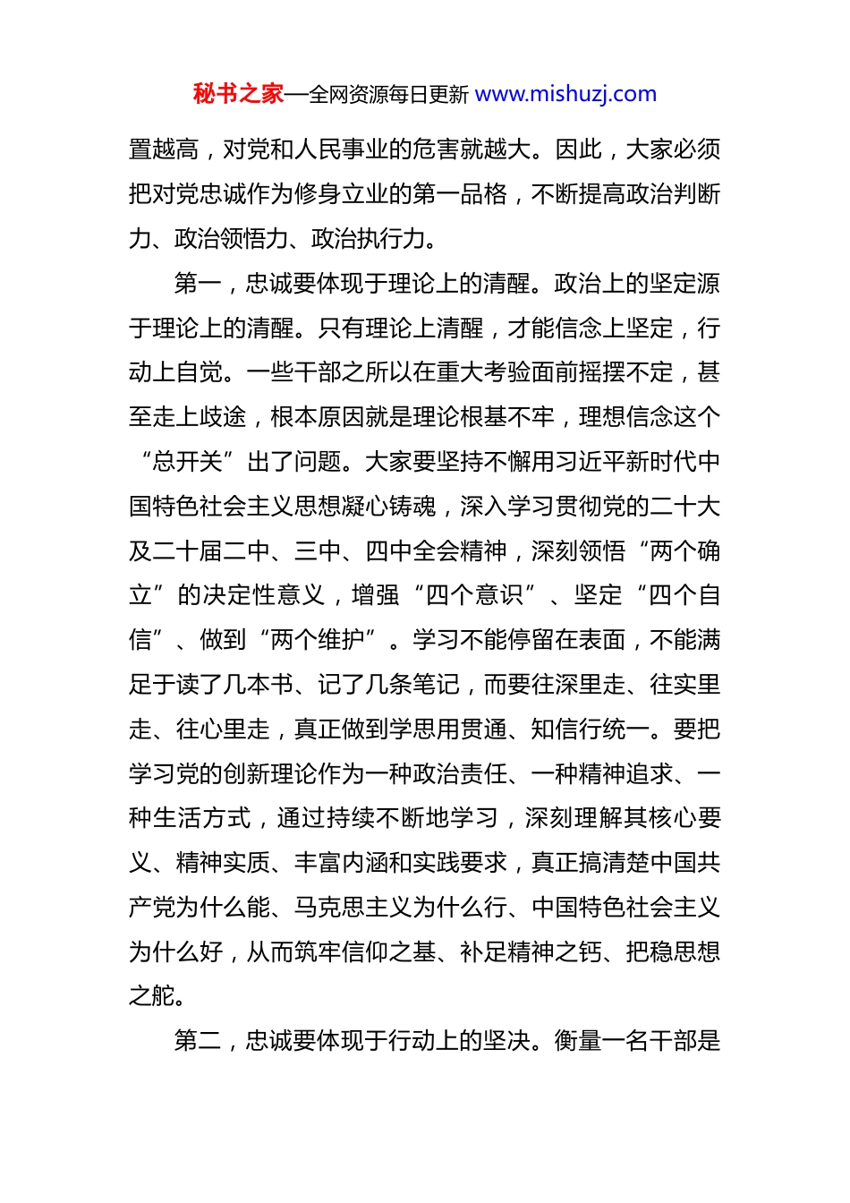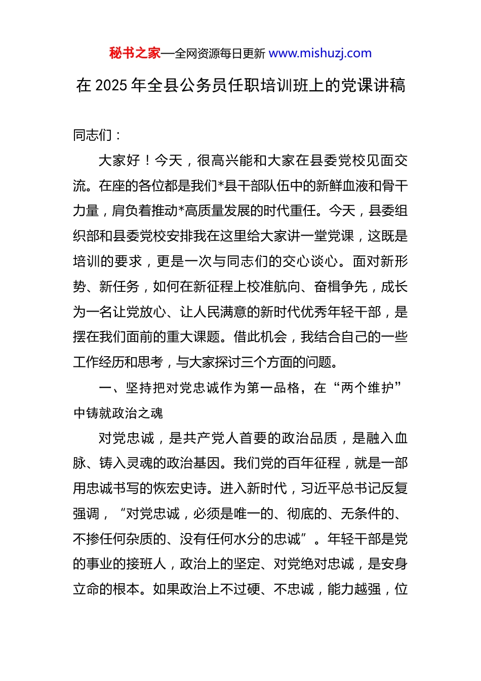 秘书之家—全网资源每日更新 www.mishuzj.com在 2025 年全县公务员任职培训班上的党课讲稿 同志们:大家好!今天,很高兴能和大家在县委党校见面交流。在座的各位都是我们*县干部队伍中的新鲜血液和骨干力量,肩负着推动*高质量发展的时代重任。今天,县委组织部和县委党校安排我在这里给大家讲一堂党课,这既是培训的要求,更是一次与同志们的交心谈心。面对新形势、新任务,如何在新征程上校准航向、奋楫争先,成长为一名让党放心、让人民满意的新时代优秀年轻干部,是摆在我们面前的重大课题。借此机会,我结合自己的一些工作经历和思考,与大家探讨三个方面的问题。一、坚持把对党忠诚作为第一品格,在“两个维护”中铸就政治之魂对党忠诚,是共产党人首要的政治品质,是融入血脉、铸入灵魂的政治基因。我们党的百年征程,就是一部用忠诚书写的恢宏史诗。进入新时代,习近平总书记反复强调,“对党忠诚,必须是唯一的、彻底的、无条件的、不掺任何杂质的、没有任何水分的忠诚”。年轻干部是党的事业的接班人,政治上的坚定、对党绝对忠诚,是安身立命的根本。如果政治上不过硬、不忠诚,能力越强,位秘书之家—全网资源每日更新 www.mishuzj.com置越高,对党和人民事业的危害就越大。因此,大家必须把对党忠诚作为修身立业的第一品格,不断提高政治判断力、政治领悟力、政治执行力。第一,忠诚要体现于理论上的清醒。政治上的坚定源于理论上的清醒。只有理论上清醒,才能信念上坚定,行动上自觉。一些干部之所以在重大考验面前摇摆不定,甚至走上歧途,根本原因就是理论根基不牢,理想信念这个“总开关”出了问题。大家要坚持不懈用习近平新时代中国特色社会主义思想凝心铸魂,深入学习贯彻党的二十大及二十届二中、三中、四中全会精神,深刻领悟“两个确立”的决定性意义,增强“四个意识”、坚定“四个自信”、做到“两个维护”。学习不能停留在表面,不能满足于读了几本书、记了几条笔记,而要往深里走、往实里走、往心里走,真正做到学思用贯通、知信行统一。要把学习党的创新理论作为一种政治责任、一种精神追求、一种生活方式,通过持续不断地学习,深刻理解其核心要义、精神实质、丰富内涵和实践要求,真正搞清楚中国共产党为什么能、马克思主义为什么行、中国特色社会主义为什么好,从而筑牢信仰之基、补足精神之钙、把稳思想之舵。第二,忠诚要体现于行动上的坚决。衡量一名干部是秘书之家—全网资源每日更新 www.mishuzj.com否对党忠诚,不仅要听他怎么说,更要看他怎么做,看他是否不折不扣地贯彻执行党中央和上级党委的决策部署。忠诚不是挂在嘴边的口号,而是体现在具体工作中的实际行动。县委十三届六次全会明确了未来五年我县“建设绿色工业强县、打造生态康养福地”的战略目标,并围绕这一目标部署了“三大行动、五大工程”。这是县委立足*发展阶段、资源禀赋和区位优势作出的重大决策。对党忠诚,就意味着要把自己摆进去、把职责摆进去、把工作摆进去,坚决贯彻落实好县委的各项决策部署。无论是推动*新能源新材料产业园的建设,还是加快*农文旅融合示范带的打造;无论是在乡村振兴的一线冲锋陷阵,还是在民生服务的窗口默默奉献,都是在用实际行动诠释对党的忠诚。决不能搞上有政策、下有对策,决不能搞选择性执行、象征性落实,更不能当“两面人”、做“两面派”,在贯彻执行中央和省委、市委、县委决策部署上打折扣、做选择、搞变通。第三,忠诚要体现于纪律上的敬畏。没有规矩,不成方圆。党的纪律和规矩是高压线,也是护身符,是对党员干部最大的爱护。对党忠诚,必须严守党的政治纪律和政治规矩。要始终心存敬畏、手握戒尺,增强纪律意识、规矩意识,知敬畏、存戒惧、守底线。要严格执行新形势下秘书之家—全网资源每日更新 www.mishuzj.com党内政治生活的若干准则,认真落实民主集中制,自觉坚持“四个服从”。在重大原则问题上,必须头脑特别清醒、眼睛特别明亮、立场特别坚定,旗帜鲜明地同各种错误思潮和言行作斗争。要习惯在受监督和约束的环境中工作生活,主动接受组织监督、群众监督和舆论监督,让权力在阳光下运行。我们有些年轻干部,...