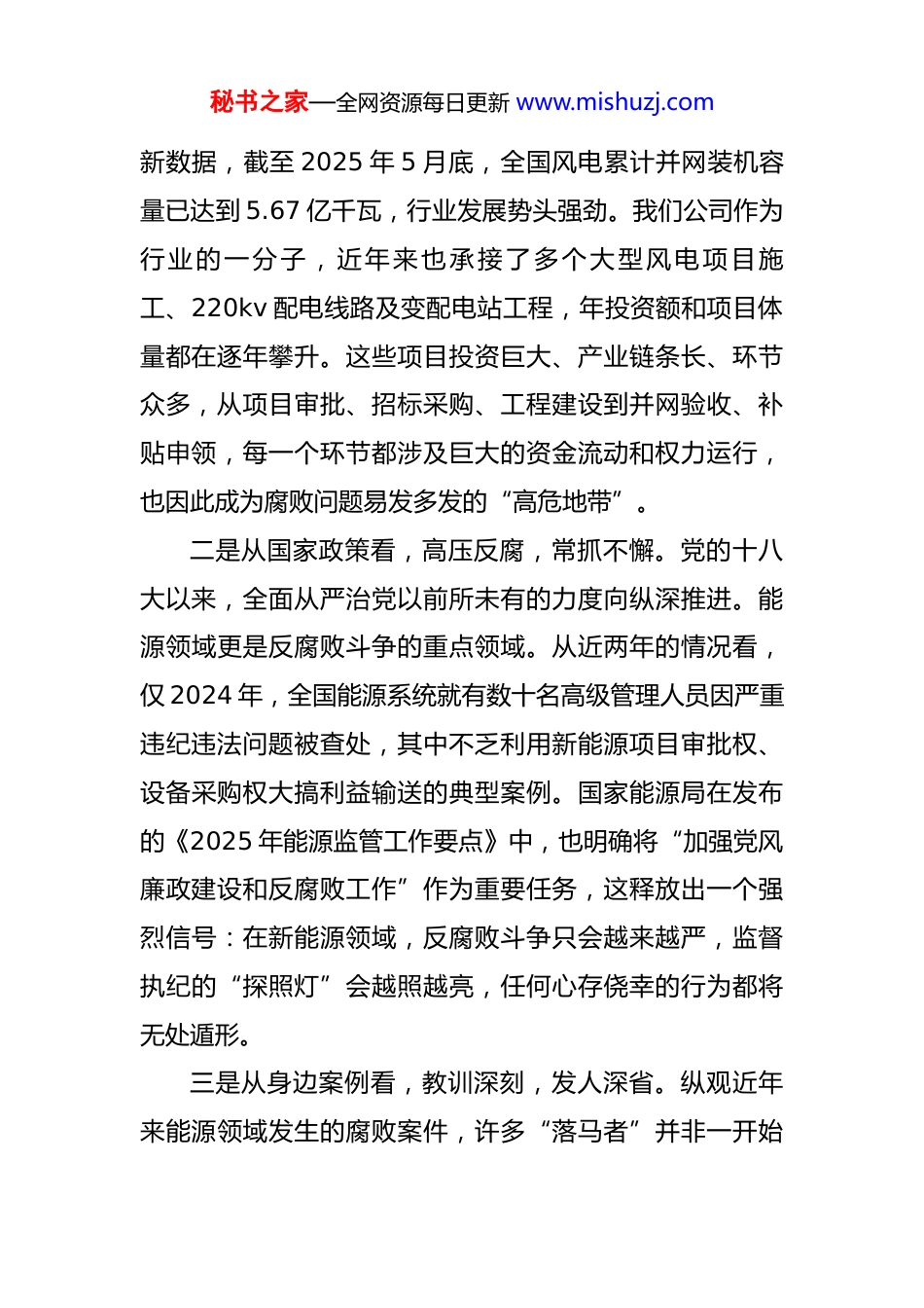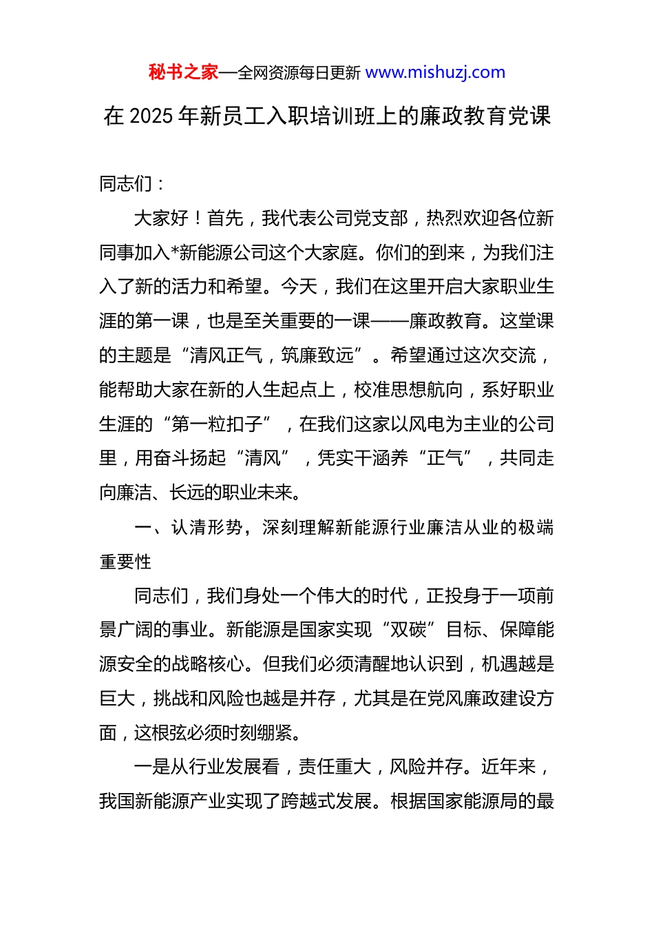 秘书之家—全网资源每日更新 www.mishuzj.com在 2025 年新员工入职培训班上的廉政教育党课 同志们:大家好!首先,我代表公司党支部,热烈欢迎各位新同事加入*新能源公司这个大家庭。你们的到来,为我们注入了新的活力和希望。今天,我们在这里开启大家职业生涯的第一课,也是至关重要的一课——廉政教育。这堂课的主题是“清风正气,筑廉致远”。希望通过这次交流,能帮助大家在新的人生起点上,校准思想航向,系好职业生涯的“第一粒扣子”,在我们这家以风电为主业的公司里,用奋斗扬起“清风”,凭实干涵养“正气”,共同走向廉洁、长远的职业未来。一、认清形势,深刻理解新能源行业廉洁从业的极端重要性同志们,我们身处一个伟大的时代,正投身于一项前景广阔的事业。新能源是国家实现“双碳”目标、保障能源安全的战略核心。但我们必须清醒地认识到,机遇越是巨大,挑战和风险也越是并存,尤其是在党风廉政建设方面,这根弦必须时刻绷紧。一是从行业发展看,责任重大,风险并存。近年来,我国新能源产业实现了跨越式发展。根据国家能源局的最秘书之家—全网资源每日更新 www.mishuzj.com新数据,截至 2025 年 5 月底,全国风电累计并网装机容量已达到 5.67 亿千瓦,行业发展势头强劲。我们公司作为行业的一分子,近年来也承接了多个大型风电项目施工、220kv 配电线路及变配电站工程,年投资额和项目体量都在逐年攀升。这些项目投资巨大、产业链条长、环节众多,从项目审批、招标采购、工程建设到并网验收、补贴申领,每一个环节都涉及巨大的资金流动和权力运行,也因此成为腐败问题易发多发的“高危地带”。二是从国家政策看,高压反腐,常抓不懈。党的十八大以来,全面从严治党以前所未有的力度向纵深推进。能源领域更是反腐败斗争的重点领域。从近两年的情况看,仅 2024 年,全国能源系统就有数十名高级管理人员因严重违纪违法问题被查处,其中不乏利用新能源项目审批权、设备采购权大搞利益输送的典型案例。国家能源局在发布的《2025 年能源监管工作要点》中,也明确将“加强党风廉政建设和反腐败工作”作为重要任务,这释放出一个强烈信号:在新能源领域,反腐败斗争只会越来越严,监督执纪的“探照灯”会越照越亮,任何心存侥幸的行为都将无处遁形。三是从身边案例看,教训深刻,发人深省。纵观近年来能源领域发生的腐败案件,许多“落马者”并非一开始秘书之家—全网资源每日更新 www.mishuzj.com就想腐化堕落。某能源集团原高管*,曾是业内的业务骨干,但他正是在掌握了新能源项目审批和资源配置大权后,思想防线逐渐松动,从收受土特产、接受宴请开始,一步步滑向违纪违法的深渊,最终身败名裂,令人扼腕。还有一些案例发生在工程建设领域,有的人在设备采购上动歪脑筋,收受供应商回扣;有的人在工程分包中优亲厚友,搞利益交换;还有的人在工程验收中弄虚作假,为不合格的工程“开绿灯”,这些行为不仅断送了自己的前程,更给企业资产和国家利益造成巨大损失,甚至埋下严重的安全隐患。这些活生生的“反面教材”警示我们,廉洁的防线一旦被突破,后果不堪设想。二、正心修身,牢牢守住拒腐防变的思想道德防线“堤溃蚁穴,气泄针芒”。腐败的发生,根子在于思想的蜕变和防线的失守。作为新入职的员工,大家犹如一张白纸,必须从一开始就注重自我修炼,打牢思想根基,筑牢廉洁自律的“防火墙”。一是勤于学习,以学养廉固根本。古人云:“学以立德,学以增智”。高尚的人格操守不是与生俱来的,而是在持续学习中积累和养成的。大家要坚持把学习作为一种政治责任和精神追求,不仅要深入学习习近平新时代中国特色社会主义思想,不断提高政治判断力、政治领悟力、秘书之家—全网资源每日更新 www.mishuzj.com政治执行力,更要认真学习《中国共产党纪律处分条例》等党纪国法和公司的各项规章制度,明确行为边界,知晓红线底线。同时,还要刻苦钻研风电工程、电网建设等专业技术知识,用过硬的业务本领为自己立身、为公司发展。只有理论上清醒、政治上坚定、业务上精通,才能在各种诱惑面前保持清醒头脑,做出正确选择。二是慎初慎微,以戒防腐守底线。...