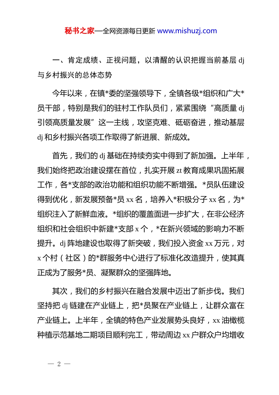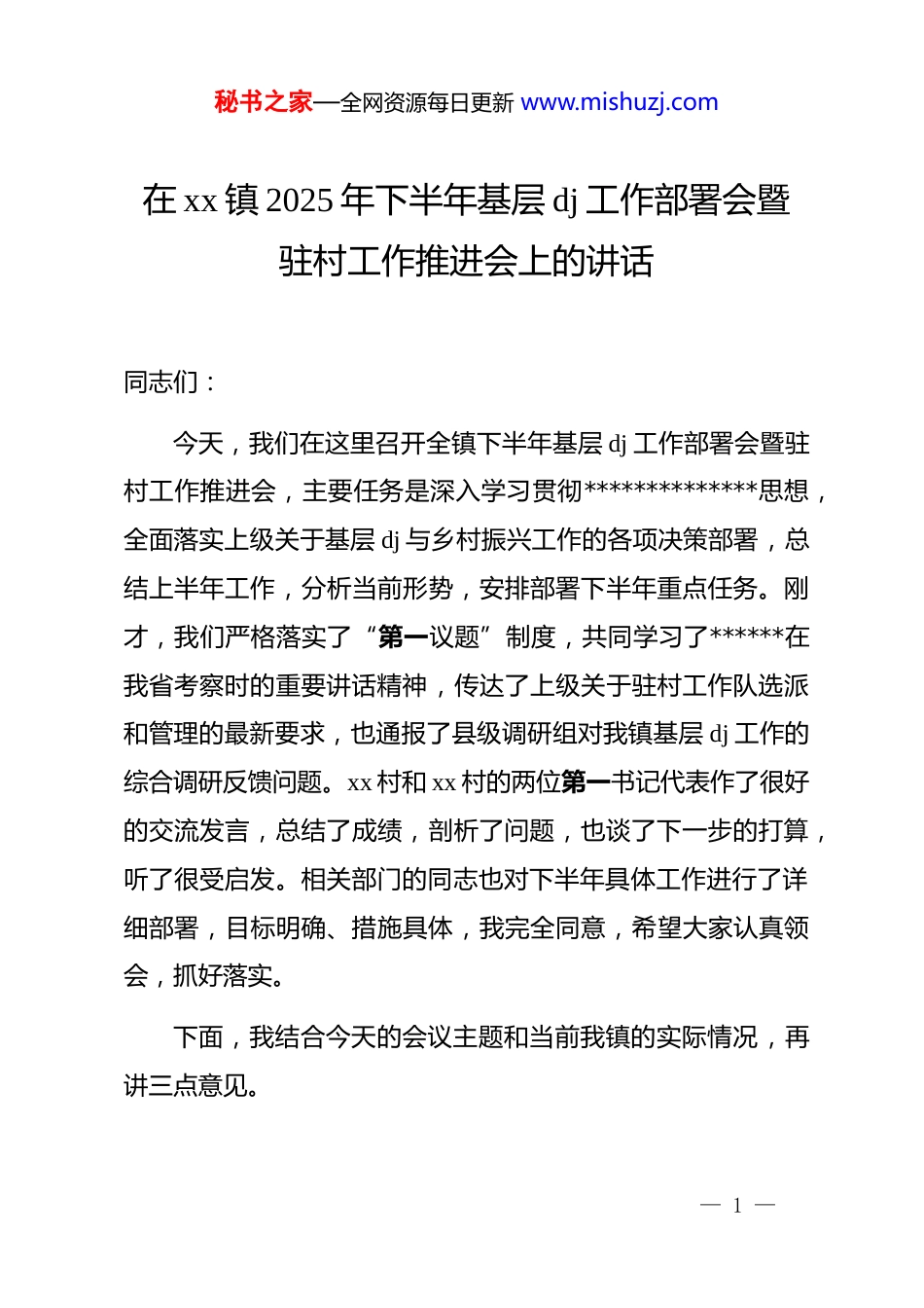 秘书之家—全网资源每日更新 www.mishuzj.com在 xx 镇 2025 年下半年基层 dj 工作部署会暨驻村工作推进会上的讲话同志们:今天,我们在这里召开全镇下半年基层 dj 工作部署会暨驻村工作推进会,主要任务是深入学习贯彻**************思想,全面落实上级关于基层 dj 与乡村振兴工作的各项决策部署,总结上半年工作,分析当前形势,安排部署下半年重点任务。刚才,我们严格落实了“第一议题”制度,共同学习了******在我省考察时的重要讲话精神,传达了上级关于驻村工作队选派和管理的最新要求,也通报了县级调研组对我镇基层 dj 工作的综合调研反馈问题。xx 村和 xx 村的两位第一书记代表作了很好的交流发言,总结了成绩,剖析了问题,也谈了下一步的打算,听了很受启发。相关部门的同志也对下半年具体工作进行了详细部署,目标明确、措施具体,我完全同意,希望大家认真领会,抓好落实。下面,我结合今天的会议主题和当前我镇的实际情况,再讲三点意见。— 1 —秘书之家—全网资源每日更新 www.mishuzj.com一、肯定成绩、正视问题,以清醒的认识把握当前基层 dj与乡村振兴的总体态势今年以来,在镇*委的坚强领导下,全镇各级*组织和广大*员干部,特别是我们的驻村工作队员们,紧紧围绕“高质量 dj引领高质量发展”这一主线,攻坚克难、砥砺奋进,推动基层dj 和乡村振兴各项工作取得了新进展、新成效。首先,我们的 dj 基础在持续夯实中得到了新加强。上半年,我们始终把政治建设摆在首位,扎实开展 zt 教育成果巩固拓展工作,各*支部的政治功能和组织功能不断增强。*员队伍建设得到优化,新发展预备*员 xx 名,培养入*积极分子 xx 名,为*组织注入了新鲜血液。*组织的覆盖面进一步扩大,在非公经济组织和社会组织中新建*支部 x 个,*在新兴领域的影响力不断提升。dj 阵地建设也取得了新突破,我们投入资金 xx 万元,对x 个村(社区)的*群服务中心进行了标准化改造提升,使其真正成为了服务*员、凝聚群众的坚强阵地。其次,我们的乡村振兴在融合发展中迈出了新步伐。我们坚持把 dj 链建在产业链上,把*员聚在产业链上,让群众富在产业链上。上半年,全镇的特色产业发展势头良好,xx 油橄榄种植示范基地二期项目顺利完工,带动周边 xx 户群众户均增收— 2 —秘书之家—全网资源每日更新 www.mishuzj.com约 5000 元;xx 生态文旅项目成功吸引游客超过 xx 万人次,旅游综合收入同比增长 18%。驻村工作队和村“两委”班子协同发力,成功争取并实施了包括农村人居环境整治、小型水利设施建设在内的民生项目 xx 个,总投资超过 xxxx 万元,群众的获得感、幸福感、安全感显著提升。这些成绩的取得,是全镇上下共同努力、辛勤付出的结果。在此,我代表镇*委、政府,向在座的各位,并通过你们向全镇奋战在基层一线的*员干部和驻村同志们,表示衷心的感谢!在肯定成绩的同时,我们更要清醒地看到工作中存在的短板和不足。8 月 25 日,县级调研组对我镇基层 dj 工作的综合调研,既是一次全面的“政治体检”,也是一次精准的“把脉会诊”。调研组一针见血地指出了我们工作中存在的一些深层次问题,主要体现在三个方面:一是 dj 工作“虚化”的问题依然存在。个别*组织“三会一课”制度执行不够严格规范,学习研讨“照本宣科”,联系实际不紧密;dj 工作与中心工作“两张皮”现象仍然存在,围绕发展抓 dj、抓好 dj 促发展的思路和办法不多。二是*员管理“软化”的问题需要警惕。少数*员先锋模范作用发挥不充分,在产业发展、项目建设、社会治理等一线“站得出、豁得出”的标杆还不够多;流动*员管理存在薄弱— 3 —秘书之家—全网资源每日更新 www.mishuzj.com环节,教育管理服务未能完全跟上。三是驻村工作“弱化”的风险不容忽视。部分驻村工作队员对政策的理解和运用还不够精准,深入田间地头、农户家中解决实际问题的能力有待加强;与村“两委”班子的协同配合还不够默契,推动重大任务落实的合力尚未完全形成。这些问题,既有共性原因,也有个性因素,根源在于我们的政治站位还不够高,责任压得还不够实,工作抓得还不...