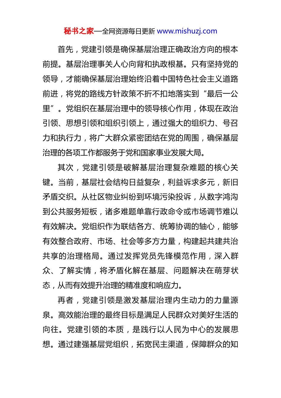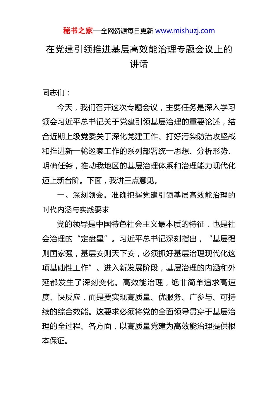 秘书之家—全网资源每日更新 www.mishuzj.com在党建引领推进基层高效能治理专题会议上的讲话 同志们:今天,我们召开这次专题会议,主要任务是深入学习领会习近平总书记关于党建引领基层治理的重要论述,结合近期上级党委关于深化党建工作、打好污染防治攻坚战和推进新一轮巡察工作的系列部署统一思想、分析形势、明确任务,推动我地区的基层治理体系和治理能力现代化迈上新台阶。下面,我讲三点意见。一、深刻领会,准确把握党建引领基层高效能治理的时代内涵与实践要求党的领导是中国特色社会主义最本质的特征,也是社会治理的“定盘星”。习近平总书记深刻指出,“基层强则国家强,基层安则天下安,必须抓好基层治理现代化这项基础性工作”。进入新发展阶段,基层治理的内涵和外延都发生了深刻变化。高效能治理,绝非简单追求高速度、快反应,而是要实现高质量、优服务、广参与、可持续的综合效能。这要求必须将党的全面领导贯穿于基层治理的全过程、各方面,以高质量党建为高效能治理提供根本保证。秘书之家—全网资源每日更新 www.mishuzj.com首先,党建引领是确保基层治理正确政治方向的根本前提。基层治理事关人心向背和执政根基。只有坚持党的领导,才能确保基层治理始终沿着中国特色社会主义道路前进,将党的路线方针政策不折不扣地落实到“最后一公里”。党组织在基层治理中的领导核心作用,体现在政治引领、思想引领和组织引领上,通过强大的组织力、号召力和执行力,将广大群众紧密团结在党的周围,确保基层治理的各项工作都服务于党和国家事业发展大局。其次,党建引领是破解基层治理复杂难题的核心关键。当前,基层社会结构日益复杂,利益诉求多元,新旧矛盾交织。从社区物业纠纷到环境污染投诉,从数字鸿沟到公共服务短板,诸多难题单靠行政命令或市场调节难以有效解决。党组织作为联结各方、统筹协调的轴心,能够有效整合政府、市场、社会等多方力量,构建起共建共治共享的治理格局。通过发挥党员先锋模范作用,深入群众、了解实情,将矛盾化解在基层、问题解决在萌芽状态,从而有效提升治理的精准度和响应力。再者,党建引领是激发基层治理内生动力的力量源泉。高效能治理的最终目标是满足人民群众对美好生活的向往。党建引领的本质,是践行以人民为中心的发展思想。通过建强基层党组织,拓宽民主渠道,保障群众的知秘书之家—全网资源每日更新 www.mishuzj.com情权、参与权、表达权和监督权,能够最大限度地调动群众参与治理的积极性、主动性和创造性。群众的智慧和力量被充分激发,治理工作就能获得最深厚、最持久的动力,形成“大家的事情大家办”的生动局面。正如近期中央一号文件再次强调的,要加强和改进乡村治理,健全党组织领导的自治、法治、德治相结合的城乡基层治理体系。这是对党建引领基层治理实践的再次肯定和深化。我们必须清醒地认识到,推进党建引领下的高效能治理,是一项系统工程,也是一场深刻变革。它要求我们必须打破传统思维定式,推动党建工作与业务工作深度融合,尤其是在污染防治、巡察整改等硬任务中,更要体现党组织的战斗堡垒作用和党员的先锋模范作用。二、正视成绩与挑战,以问题为导向全面审视治理现状近年来,我 XX 地区坚决贯彻落实上级决策部署,在党建引领基层治理方面进行了一系列积极探索,取得了阶段性成效。但同时,对照高效能治理的目标和人民群众的更高期待,我们必须保持清醒,敢于直面问题和挑战。一方面,治理效能稳步提升,部分领域取得突破。在提升治理响应能力方面,我们构建的“基层治理综合服务平台”作用日益凸显。初步实现了“民有所呼、我秘书之家—全网资源每日更新 www.mishuzj.com有所应”。这表明,通过技术赋能,我们打通服务群众渠道的努力初见成效。在推进生态环境治理方面,成绩尤为显著。我们坚持将污染防治攻坚战作为重大政治任务来抓,压实各级党组织主体责任。这些成果的取得,是各级党组织和广大党员干部攻坚克难、不懈奋斗的结果,充分证明了党建与业务融合的强大威力。在夯实基层组织基础方面,我们深入实施工程,基层党组织的政治功能和组织功能不断增强,党的组织和工作覆盖面进一...