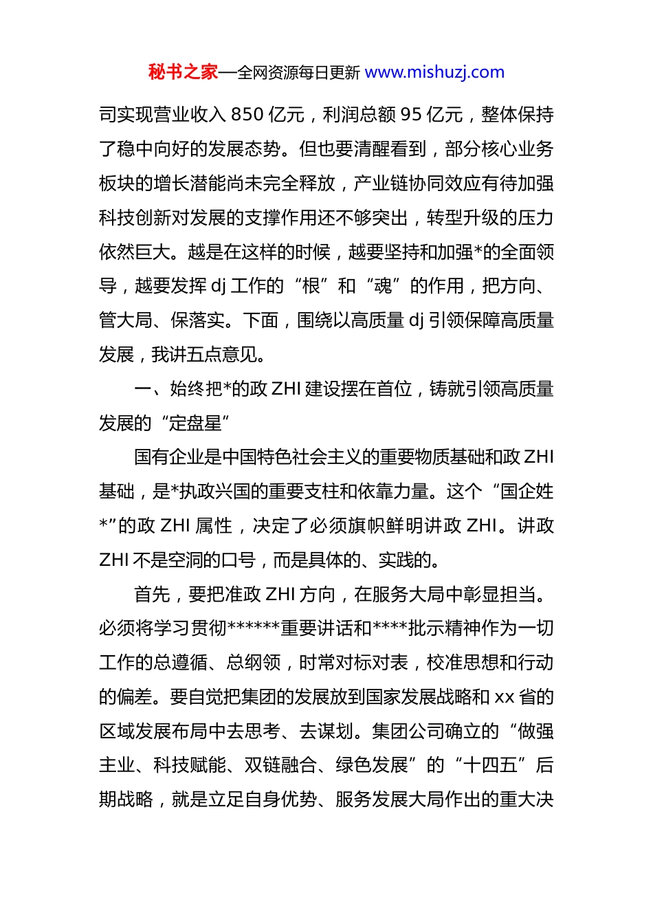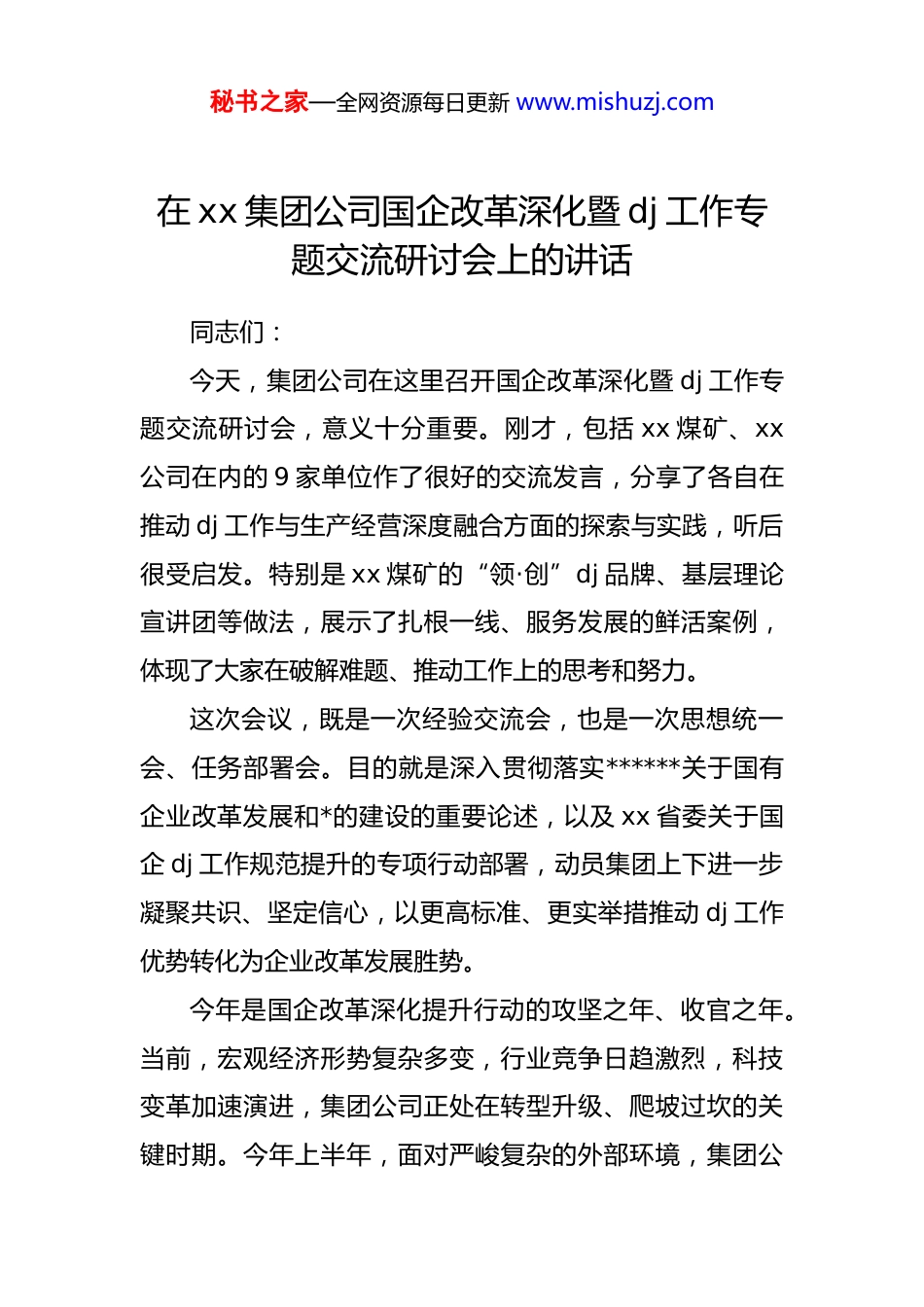 秘书之家—全网资源每日更新 www.mishuzj.com在 xx 集团公司国企改革深化暨 dj 工作专题交流研讨会上的讲话同志们:今天,集团公司在这里召开国企改革深化暨 dj 工作专题交流研讨会,意义十分重要。刚才,包括 xx 煤矿、xx公司在内的 9 家单位作了很好的交流发言,分享了各自在推动 dj 工作与生产经营深度融合方面的探索与实践,听后很受启发。特别是 xx 煤矿的“领·创”dj 品牌、基层理论宣讲团等做法,展示了扎根一线、服务发展的鲜活案例,体现了大家在破解难题、推动工作上的思考和努力。这次会议,既是一次经验交流会,也是一次思想统一会、任务部署会。目的就是深入贯彻落实******关于国有企业改革发展和*的建设的重要论述,以及 xx 省委关于国企 dj 工作规范提升的专项行动部署,动员集团上下进一步凝聚共识、坚定信心,以更高标准、更实举措推动 dj 工作优势转化为企业改革发展胜势。今年是国企改革深化提升行动的攻坚之年、收官之年。当前,宏观经济形势复杂多变,行业竞争日趋激烈,科技变革加速演进,集团公司正处在转型升级、爬坡过坎的关键时期。今年上半年,面对严峻复杂的外部环境,集团公秘书之家—全网资源每日更新 www.mishuzj.com司实现营业收入 850 亿元,利润总额 95 亿元,整体保持了稳中向好的发展态势。但也要清醒看到,部分核心业务板块的增长潜能尚未完全释放,产业链协同效应有待加强科技创新对发展的支撑作用还不够突出,转型升级的压力依然巨大。越是在这样的时候,越要坚持和加强*的全面领导,越要发挥 dj 工作的“根”和“魂”的作用,把方向、管大局、保落实。下面,围绕以高质量 dj 引领保障高质量发展,我讲五点意见。一、始终把*的政 ZHI 建设摆在首位,铸就引领高质量发展的“定盘星”国有企业是中国特色社会主义的重要物质基础和政 ZHI基础,是*执政兴国的重要支柱和依靠力量。这个“国企姓*”的政 ZHI 属性,决定了必须旗帜鲜明讲政 ZHI。讲政ZHI 不是空洞的口号,而是具体的、实践的。首先,要把准政 ZHI 方向,在服务大局中彰显担当。必须将学习贯彻******重要讲话和****批示精神作为一切工作的总遵循、总纲领,时常对标对表,校准思想和行动的偏差。要自觉把集团的发展放到国家发展战略和 xx 省的区域发展布局中去思考、去谋划。集团公司确立的“做强主业、科技赋能、双链融合、绿色发展”的“十四五”后期战略,就是立足自身优势、服务发展大局作出的重大决秘书之家—全网资源每日更新 www.mishuzj.com策。各单位、各级*组织要深刻领会其战略意图,不折不扣地执行到位,确保集团的发展始终沿着*指引的正确方向前进,在保障能源安全、推动产业升级、促进区域经济发展中,真正扛起主力军、排头兵的责任。其次,要强化政 ZHI 领导,在完善公司 ZHI 理中发挥核心作用。要把*的领导融入公司 ZHI 理各环节,做到无缝衔接、有机统一。关键在于厘清*组织和董事会、监事会、经理层等其他 ZHI 理主体的权责边界,形成各司其职、各负其责、协调运转、有效制衡的公司 ZHI 理机制。*组织要在“三重一大”等重大事项决策中,履行好前置研究程序把好政 ZHI 关、方向关、廉洁关。这绝不是要替代董事会或经理层的决策,而是要确保企业的战略规划、改革发展风险管控等关键环节,都能够充分体现*的主张和国家意志,防止出现决策失误、方向偏离等重大风险。二、坚持用*的创新理论凝心铸魂,筑牢引领高质量发展的“压舱石”思想是行动的先导,理论是实践的指南。面对新形势新任务,干部队伍中存在的“本领恐慌”“路径依赖”等问题,根源在于理论武装不够深入、思想观念未能与时俱进。一要推动理论学习往深里走、往实里走。要巩固拓展秘书之家—全网资源每日更新 www.mishuzj.comzt 教育成果,坚持把学习**************思想作为首要政ZHI 任务。理论学习中心组要发挥示范引领作用,“三会一课”、主题*日等要丰富形式、提升质量,不能搞形式主义。学习不能满足于读了多少文件、开了多少会议,关键要看是否真正领会了其中的世界观、方法论,是否能够运用贯穿其中的立场观点方法去分析和解决实际问...