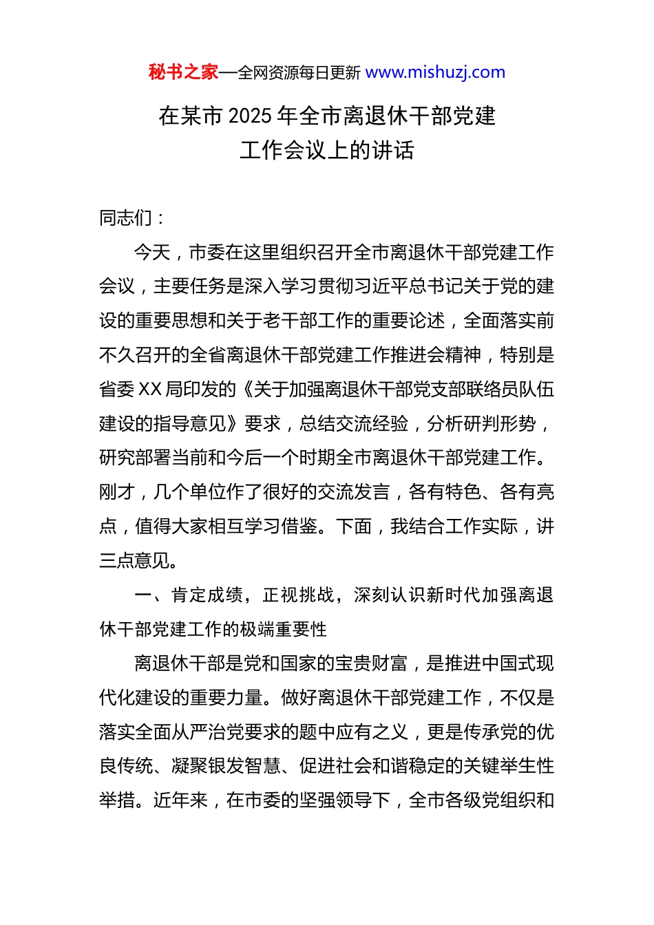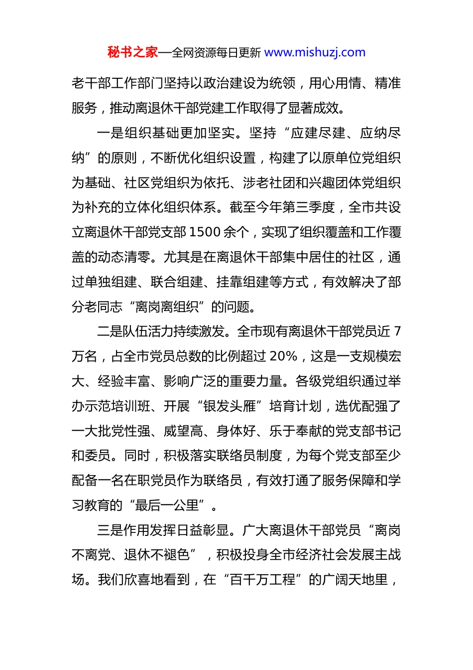 秘书之家—全网资源每日更新 www.mishuzj.com在某市 2025 年全市离退休干部党建工作会议上的讲话 同志们:今天,市委在这里组织召开全市离退休干部党建工作会议,主要任务是深入学习贯彻习近平总书记关于党的建设的重要思想和关于老干部工作的重要论述,全面落实前不久召开的全省离退休干部党建工作推进会精神,特别是省委 XX 局印发的《关于加强离退休干部党支部联络员队伍建设的指导意见》要求,总结交流经验,分析研判形势,研究部署当前和今后一个时期全市离退休干部党建工作。刚才,几个单位作了很好的交流发言,各有特色、各有亮点,值得大家相互学习借鉴。下面,我结合工作实际,讲三点意见。一、肯定成绩,正视挑战,深刻认识新时代加强离退休干部党建工作的极端重要性离退休干部是党和国家的宝贵财富,是推进中国式现代化建设的重要力量。做好离退休干部党建工作,不仅是落实全面从严治党要求的题中应有之义,更是传承党的优良传统、凝聚银发智慧、促进社会和谐稳定的关键举生性举措。近年来,在市委的坚强领导下,全市各级党组织和秘书之家—全网资源每日更新 www.mishuzj.com老干部工作部门坚持以政治建设为统领,用心用情、精准服务,推动离退休干部党建工作取得了显著成效。一是组织基础更加坚实。坚持“应建尽建、应纳尽纳”的原则,不断优化组织设置,构建了以原单位党组织为基础、社区党组织为依托、涉老社团和兴趣团体党组织为补充的立体化组织体系。截至今年第三季度,全市共设立离退休干部党支部 1500 余个,实现了组织覆盖和工作覆盖的动态清零。尤其是在离退休干部集中居住的社区,通过单独组建、联合组建、挂靠组建等方式,有效解决了部分老同志“离岗离组织”的问题。二是队伍活力持续激发。全市现有离退休干部党员近 7万名,占全市党员总数的比例超过 20%,这是一支规模宏大、经验丰富、影响广泛的重要力量。各级党组织通过举办示范培训班、开展“银发头雁”培育计划,选优配强了一大批党性强、威望高、身体好、乐于奉献的党支部书记和委员。同时,积极落实联络员制度,为每个党支部至少配备一名在职党员作为联络员,有效打通了服务保障和学习教育的“最后一公里”。三是作用发挥日益彰显。广大离退休干部党员“离岗不离党、退休不褪色”,积极投身全市经济社会发展主战场。我们欣喜地看到,在“百千万工程”的广阔天地里,秘书之家—全网资源每日更新 www.mishuzj.com在基层社会治理的第一线,在关心下一代成长的讲台上,处处闪耀着老同志们的身影。特别是在创建全国文明城市、优化营商环境、参与乡村振兴等中心工作中,他们通过组建“银发智库”“五老”宣讲团等形式,建言献策、贡献力量。过去一年,全市各级“银发智库”累计提交高质量调研报告和政策建议超过 80 份,协助基层化解矛盾纠纷近千起,开展科普、法律、文化等志愿服务活动 500 余场次。四是示范引领成效显著。全市范围内深入开展离退休干部“六好”示范党支部创建活动,以“组织设置好、班子建设好、党员队伍好、学习活动好、作用发挥好、制度坚持好”为标准成功培育和选树了一批市级、县级示范党支部。这些示范点犹如一座座灯塔,照亮了基层党建的航程。例如,市*局离退休干部第一党支部,数十年如一日坚持理论学习,支部成员人均学习笔记超过 2 万字,成为全市理论学习的标杆。又如,*区*街道*社区离退休干部党支部,主动融入社区治理,成立了“老书记工作室”,认领了社区治安巡逻、环境监督、邻里调解等多个公益岗位,极大地提升了社区的和谐善治水平。在充分肯定成绩的同时,也必须清醒地认识到,对标新时代党的建设总要求和广大老同志的新期待,我们的工秘书之家—全网资源每日更新 www.mishuzj.com作还存在一些短板和不足。比如,部分单位对离退休干部党建工作的重要性认识还不够到位,存在“说起来重要、做起来次要、忙起来不要”的现象;党组织活动的内容和形式有时创新不足,对年轻一些、活力较足的老同志吸引力不强;服务保障体系仍有待完善,对高龄、失能、独居等特殊困难老党员的精准关怀还需进一步加强;价值引领的平台和渠道还不够宽广,老同志的优势作...