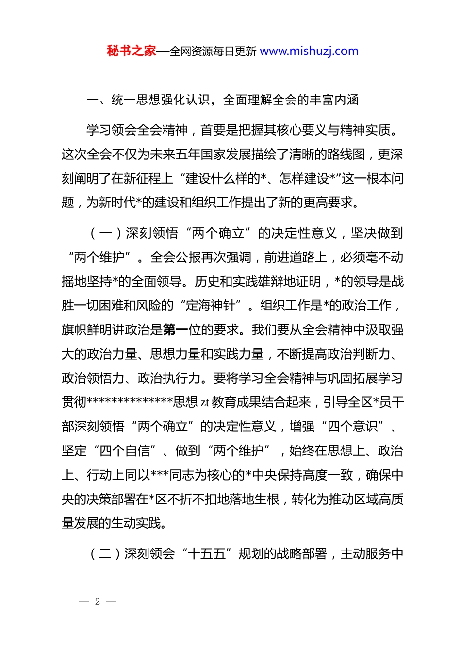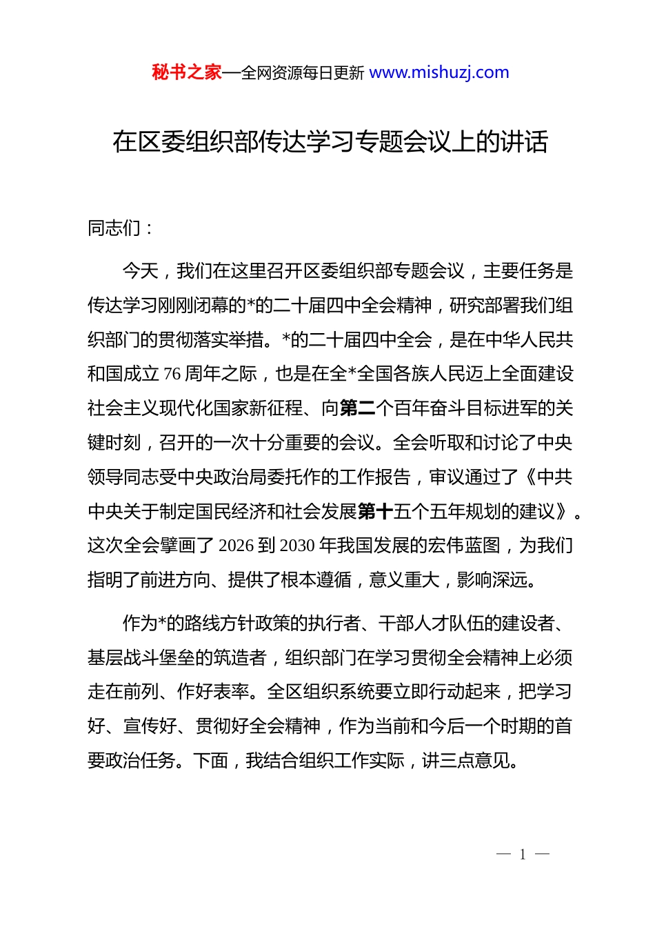秘书之家—全网资源每日更新 www.mishuzj.com在区委组织部传达学习专题会议上的讲话同志们:今天,我们在这里召开区委组织部专题会议,主要任务是传达学习刚刚闭幕的*的二十届四中全会精神,研究部署我们组织部门的贯彻落实举措。*的二十届四中全会,是在中华人民共和国成立 76 周年之际,也是在全*全国各族人民迈上全面建设社会主义现代化国家新征程、向第二个百年奋斗目标进军的关键时刻,召开的一次十分重要的会议。全会听取和讨论了中央领导同志受中央政治局委托作的工作报告,审议通过了《中共中央关于制定国民经济和社会发展第十五个五年规划的建议》。这次全会擘画了 2026 到 2030 年我国发展的宏伟蓝图,为我们指明了前进方向、提供了根本遵循,意义重大,影响深远。作为*的路线方针政策的执行者、干部人才队伍的建设者、基层战斗堡垒的筑造者,组织部门在学习贯彻全会精神上必须走在前列、作好表率。全区组织系统要立即行动起来,把学习好、宣传好、贯彻好全会精神,作为当前和今后一个时期的首要政治任务。下面,我结合组织工作实际,讲三点意见。— 1 —秘书之家—全网资源每日更新 www.mishuzj.com一、统一思想强化认识,全面理解全会的丰富内涵学习领会全会精神,首要是把握其核心要义与精神实质。这次全会不仅为未来五年国家发展描绘了清晰的路线图,更深刻阐明了在新征程上“建设什么样的*、怎样建设*”这一根本问题,为新时代*的建设和组织工作提出了新的更高要求。(一)深刻领悟“两个确立”的决定性意义,坚决做到“两个维护”。全会公报再次强调,前进道路上,必须毫不动摇地坚持*的全面领导。历史和实践雄辩地证明,*的领导是战胜一切困难和风险的“定海神针”。组织工作是*的政治工作,旗帜鲜明讲政治是第一位的要求。我们要从全会精神中汲取强大的政治力量、思想力量和实践力量,不断提高政治判断力、政治领悟力、政治执行力。要将学习全会精神与巩固拓展学习贯彻**************思想 zt 教育成果结合起来,引导全区*员干部深刻领悟“两个确立”的决定性意义,增强“四个意识”、坚定“四个自信”、做到“两个维护”,始终在思想上、政治上、行动上同以***同志为核心的*中央保持高度一致,确保中央的决策部署在*区不折不扣地落地生根,转化为推动区域高质量发展的生动实践。(二)深刻领会“十五五”规划的战略部署,主动服务中— 2 —秘书之家—全网资源每日更新 www.mishuzj.com心大局。全会审议通过的“十五五”规划建议,是未来五年推动高质量发展、加快构建新发展格局的纲领性文件。公报指出,要以发展新质生产力为重要着力点,统筹推进高质量发展和高水平安全。这对我们组织工作服务中心大局的能力提出了前所未有的考验。我们必须清醒地认识到,*区正处于转型升级、爬坡过坎的关键阶段,无论是推动大数据与实体经济深度融合,还是培育壮大战略性新兴产业,或是提升城市治理现代化水平,都离不开坚强组织保证和有力的人才支撑。组织部门必须胸怀“国之大者”,自觉把组织工作放到全区乃至全市、全省的发展大局中去思考、去谋划、去推进。要紧紧围绕“十五五”规划建议中明确的重点任务和重大项目,研究制定组织工作服务保障的具体方案,确保*的组织优势、干部优势、人才优势源源不断地转化为发展优势、竞争优势。(三)深刻领会新时代*的建设总要求,精准把握组织工作方向。全会公报强调,实现“十五五”时期发展目标,关键在*,关键在人。必须以彻底的自我革命精神,持续推进新时代*的建设新的伟大工程。全会就“加强干部队伍建设”和“增强基层*组织政治功能和组织功能”作出了新的系统论述。这为我们当前和今后一个时期的组织工作划定了重点、指明了方向。公报— 3 —秘书之家—全网资源每日更新 www.mishuzj.com中关于“建设适应中国式现代化要求的高素质专业化干部队伍”“推动基层*组织全面进步、全面过硬”等重要论述,既是宏观指引,也是具体要求。我们必须深入研究这些新论述、新要求背后的深刻内涵,结合*区的实际情况,找准贯彻落实的切入点和着力点,确保组织工作始终沿着*中央指引的正确方向前进,不断提高科学化、制度...
