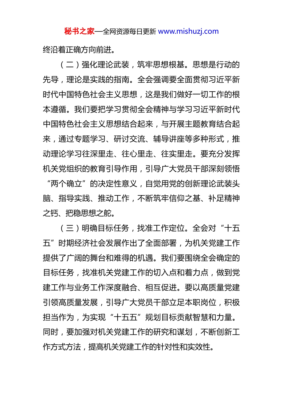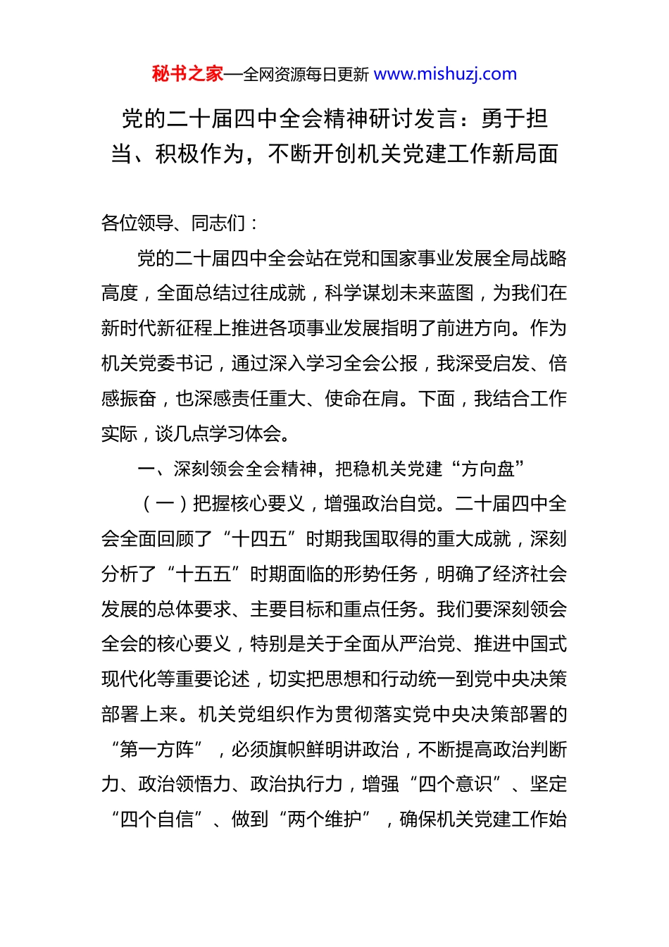 秘书之家—全网资源每日更新 www.mishuzj.com党的二十届四中全会精神研讨发言:勇于担当、积极作为,不断开创机关党建工作新局面 各位领导、同志们:党的二十届四中全会站在党和国家事业发展全局战略高度,全面总结过往成就,科学谋划未来蓝图,为我们在新时代新征程上推进各项事业发展指明了前进方向。作为机关党委书记,通过深入学习全会公报,我深受启发、倍感振奋,也深感责任重大、使命在肩。下面,我结合工作实际,谈几点学习体会。一、深刻领会全会精神,把稳机关党建“方向盘”(一)把握核心要义,增强政治自觉。二十届四中全会全面回顾了“十四五”时期我国取得的重大成就,深刻分析了“十五五”时期面临的形势任务,明确了经济社会发展的总体要求、主要目标和重点任务。我们要深刻领会全会的核心要义,特别是关于全面从严治党、推进中国式现代化等重要论述,切实把思想和行动统一到党中央决策部署上来。机关党组织作为贯彻落实党中央决策部署的“第一方阵”,必须旗帜鲜明讲政治,不断提高政治判断力、政治领悟力、政治执行力,增强“四个意识”、坚定“四个自信”、做到“两个维护”,确保机关党建工作始秘书之家—全网资源每日更新 www.mishuzj.com终沿着正确方向前进。(二)强化理论武装,筑牢思想根基。思想是行动的先导,理论是实践的指南。全会强调要全面贯彻习近平新时代中国特色社会主义思想,这是我们做好一切工作的根本遵循。我们要把学习贯彻全会精神与学习习近平新时代中国特色社会主义思想结合起来,与开展主题教育结合起来,通过专题学习、研讨交流、辅导讲座等多种形式,推动理论学习往深里走、往心里走、往实里走。要充分发挥机关党组织的教育引导作用,引导广大党员干部深刻领悟“两个确立”的决定性意义,自觉用党的创新理论武装头脑、指导实践、推动工作,不断筑牢信仰之基、补足精神之钙、把稳思想之舵。(三)明确目标任务,找准工作定位。全会对“十五五”时期经济社会发展作出了全面部署,为机关党建工作提供了广阔的舞台和难得的机遇。我们要围绕全会确定的目标任务,找准机关党建工作的切入点和着力点,做到党建工作与业务工作深度融合、相互促进。要以高质量党建引领高质量发展,引导广大党员干部立足本职岗位,积极担当作为,为实现“十五五”规划目标贡献智慧和力量。同时,要加强对机关党建工作的研究和谋划,不断创新工作方式方法,提高机关党建工作的针对性和实效性。秘书之家—全网资源每日更新 www.mishuzj.com二、聚焦主责主业,锻造机关党建“新引擎”(一)加强组织建设,提升基层党组织战斗力。基层党组织是党的全部工作和战斗力的基础。我们要以提升组织力为重点,突出政治功能,加强机关基层党组织建设。要严格落实“三会一课”、主题党日、组织生活会等制度,严肃党内政治生活,增强党内政治生活的政治性、时代性、原则性、战斗性。要加强党员教育管理监督,提高党员素质,发挥党员先锋模范作用。要加强党支部标准化规范化建设,选优配强党支部书记,打造坚强有力的战斗堡垒。同时,要加强对群团组织的领导,支持群团组织依法依章程开展工作,充分发挥群团组织的桥梁和纽带作用。(二)推进作风建设,营造风清气正政治生态。作风建设关系党的形象,关系人心向背,关系党和国家事业兴衰成败。全会强调要持之以恒推进全面从严治党,深入推进新时代党的建设新的伟大工程。我们要以全会精神为指引,持续加强机关作风建设,坚决反对形式主义、官僚主义,树立正确的政绩观和价值观。要加强廉政教育,强化纪律意识和规矩意识,引导广大党员干部自觉遵守党的纪律和廉洁自律各项规定。要加强对权力运行的制约和监督,建立健全廉政风险防控机制,确保权力在阳光下运秘书之家—全网资源每日更新 www.mishuzj.com行。要加大对违纪违法行为的查处力度,保持惩治腐败的高压态势,营造风清气正的政治生态。(三)激发创新活力,推动机关党建工作高质量发展。创新是引领发展的第一动力。我们要适应新时代新要求,不断创新机关党建工作理念、方式方法和载体平台,激发机关党建工作的生机与活力。要积极探索“互联网+党建”模式,利用现代...