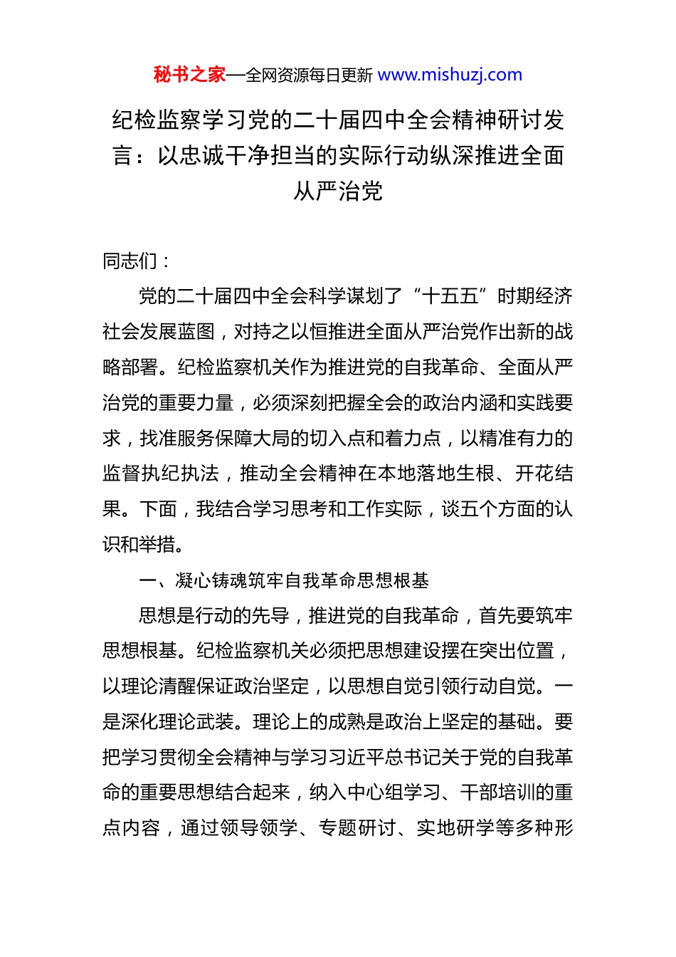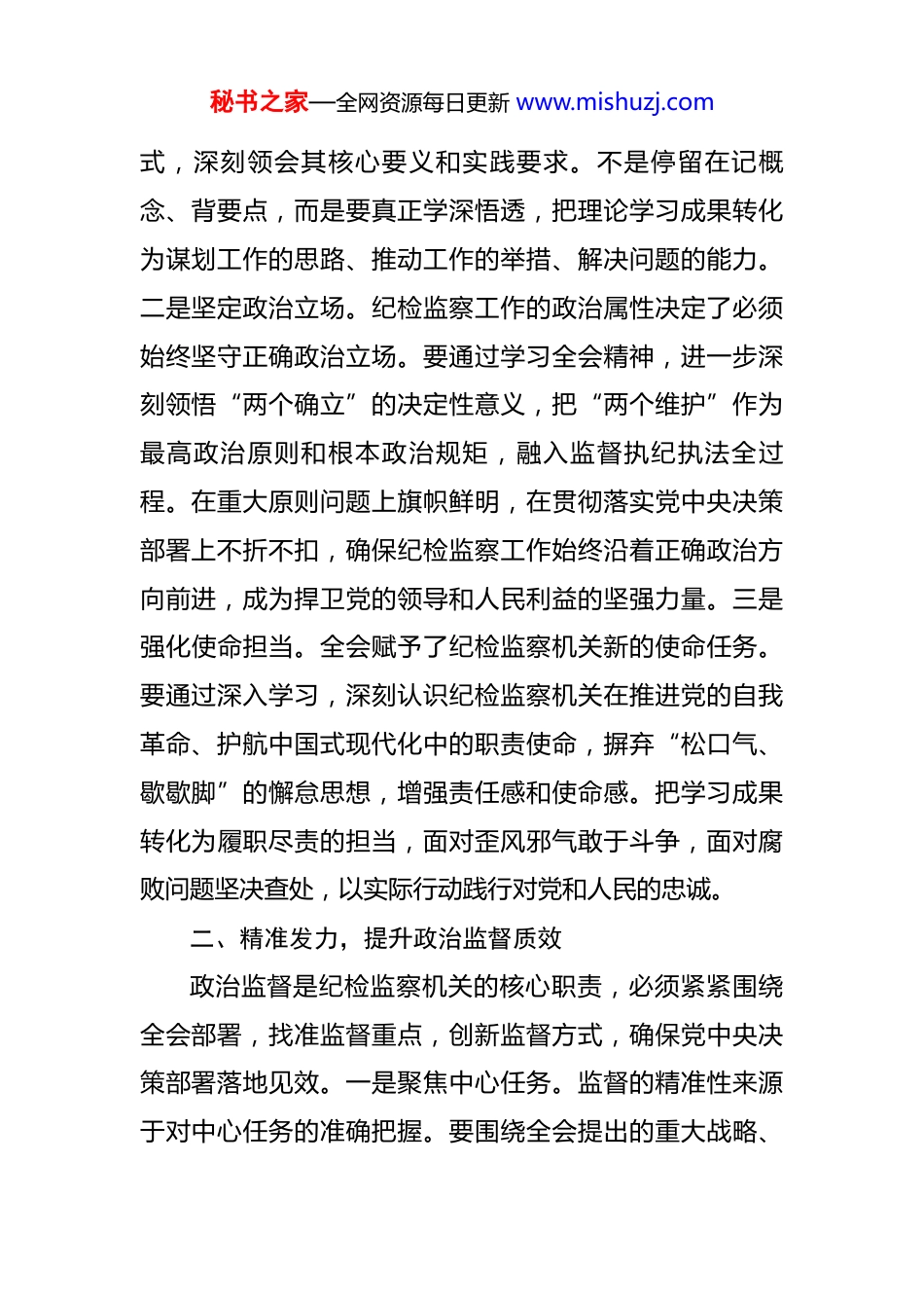 秘书之家—全网资源每日更新 www.mishuzj.com纪检监察学习党的二十届四中全会精神研讨发言:以忠诚干净担当的实际行动纵深推进全面从严治党 同志们:党的二十届四中全会科学谋划了“十五五”时期经济社会发展蓝图,对持之以恒推进全面从严治党作出新的战略部署。纪检监察机关作为推进党的自我革命、全面从严治党的重要力量,必须深刻把握全会的政治内涵和实践要求,找准服务保障大局的切入点和着力点,以精准有力的监督执纪执法,推动全会精神在本地落地生根、开花结果。下面,我结合学习思考和工作实际,谈五个方面的认识和举措。一、凝心铸魂筑牢自我革命思想根基思想是行动的先导,推进党的自我革命,首先要筑牢思想根基。纪检监察机关必须把思想建设摆在突出位置,以理论清醒保证政治坚定,以思想自觉引领行动自觉。一是深化理论武装。理论上的成熟是政治上坚定的基础。要把学习贯彻全会精神与学习习近平总书记关于党的自我革命的重要思想结合起来,纳入中心组学习、干部培训的重点内容,通过领导领学、专题研讨、实地研学等多种形秘书之家—全网资源每日更新 www.mishuzj.com式,深刻领会其核心要义和实践要求。不是停留在记概念、背要点,而是要真正学深悟透,把理论学习成果转化为谋划工作的思路、推动工作的举措、解决问题的能力。二是坚定政治立场。纪检监察工作的政治属性决定了必须始终坚守正确政治立场。要通过学习全会精神,进一步深刻领悟“两个确立”的决定性意义,把“两个维护”作为最高政治原则和根本政治规矩,融入监督执纪执法全过程。在重大原则问题上旗帜鲜明,在贯彻落实党中央决策部署上不折不扣,确保纪检监察工作始终沿着正确政治方向前进,成为捍卫党的领导和人民利益的坚强力量。三是强化使命担当。全会赋予了纪检监察机关新的使命任务。要通过深入学习,深刻认识纪检监察机关在推进党的自我革命、护航中国式现代化中的职责使命,摒弃“松口气、歇歇脚”的懈怠思想,增强责任感和使命感。把学习成果转化为履职尽责的担当,面对歪风邪气敢于斗争,面对腐败问题坚决查处,以实际行动践行对党和人民的忠诚。二、精准发力,提升政治监督质效政治监督是纪检监察机关的核心职责,必须紧紧围绕全会部署,找准监督重点,创新监督方式,确保党中央决策部署落地见效。一是聚焦中心任务。监督的精准性来源于对中心任务的准确把握。要围绕全会提出的重大战略、秘书之家—全网资源每日更新 www.mishuzj.com重点任务,结合本地实际,梳理形成政治监督重点清单,聚焦高质量发展、民生保障、改革攻坚等关键领域,开展专项监督。对贯彻落实中存在的敷衍塞责、消极应付等问题,及时约谈提醒、督促整改,推动各级党组织把全会部署转化为具体工作成效。二是创新监督方式。新时代的监督工作必须与时俱进、守正创新。要打破传统监督模式,运用大数据、人工智能等技术手段,搭建监督平台,实现对重点领域、关键环节的精准画像和动态监控。通过“嵌入式”监督、“蹲点式”调研等方式,深入一线发现问题,避免监督“浮在表面”。建立健全监督台账,实行销号管理,确保监督事项件件有着落、事事有回音。三是强化结果运用。监督的成效最终体现在结果运用上。要建立政治监督反馈机制,对监督发现的问题及时向被监督单位反馈,提出整改建议。把政治监督结果与干部考核、评优评先、选拔任用挂钩,对贯彻落实有力、成效显著的予以肯定,对落实不力、问题突出的严肃追责问责,形成“监督—整改—提升”的闭环,推动政治监督从“纸上”落到“实处”。三、风腐同治深化正风肃纪反腐全会明确要求健全不正之风和腐败问题同查同治机制,这为我们深化正风肃纪反腐提供了重要遵循。必须坚秘书之家—全网资源每日更新 www.mishuzj.com持风腐一体查、一体治,不断提升治理效能。一是从严纠治“四风”。作风问题关系人心向背,必须持之以恒抓下去。要锲而不舍贯彻中央八项规定精神,以钉钉子精神纠治形式主义、官僚主义,严查加重基层负担、漠视群众利益等问题。紧盯节假日等重要节点,严查隐形变异的“四风”问题,对顶风违纪行为从严查处、通报曝光,持续释放越往后执纪越严的强烈信号,推...