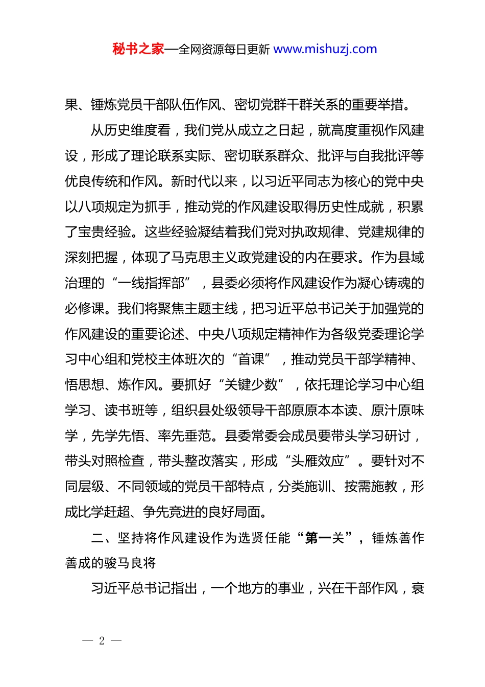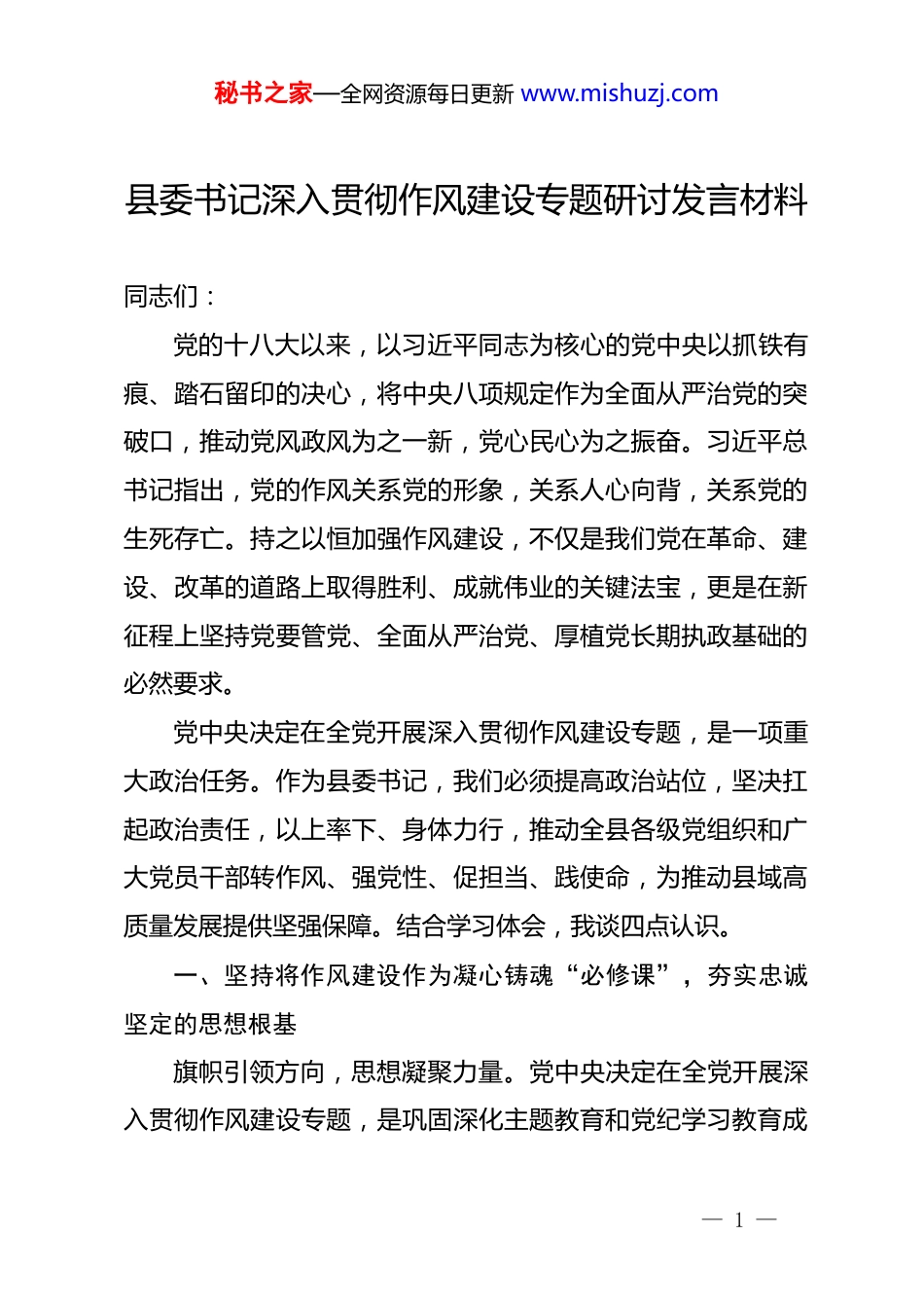 秘书之家—全网资源每日更新 www.mishuzj.com县委书记深入贯彻作风建设专题研讨发言材料同志们:党的十八大以来,以习近平同志为核心的党中央以抓铁有痕、踏石留印的决心,将中央八项规定作为全面从严治党的突破口,推动党风政风为之一新,党心民心为之振奋。习近平总书记指出,党的作风关系党的形象,关系人心向背,关系党的生死存亡。持之以恒加强作风建设,不仅是我们党在革命、建设、改革的道路上取得胜利、成就伟业的关键法宝,更是在新征程上坚持党要管党、全面从严治党、厚植党长期执政基础的必然要求。党中央决定在全党开展深入贯彻作风建设专题,是一项重大政治任务。作为县委书记,我们必须提高政治站位,坚决扛起政治责任,以上率下、身体力行,推动全县各级党组织和广大党员干部转作风、强党性、促担当、践使命,为推动县域高质量发展提供坚强保障。结合学习体会,我谈四点认识。一、坚持将作风建设作为凝心铸魂“必修课”,夯实忠诚坚定的思想根基旗帜引领方向,思想凝聚力量。党中央决定在全党开展深入贯彻作风建设专题,是巩固深化主题教育和党纪学习教育成— 1 —秘书之家—全网资源每日更新 www.mishuzj.com果、锤炼党员干部队伍作风、密切党群干群关系的重要举措。从历史维度看,我们党从成立之日起,就高度重视作风建设,形成了理论联系实际、密切联系群众、批评与自我批评等优良传统和作风。新时代以来,以习近平同志为核心的党中央以八项规定为抓手,推动党的作风建设取得历史性成就,积累了宝贵经验。这些经验凝结着我们党对执政规律、党建规律的深刻把握,体现了马克思主义政党建设的内在要求。作为县域治理的“一线指挥部”,县委必须将作风建设作为凝心铸魂的必修课。我们将聚焦主题主线,把习近平总书记关于加强党的作风建设的重要论述、中央八项规定精神作为各级党委理论学习中心组和党校主体班次的“首课”,推动党员干部学精神、悟思想、炼作风。要抓好“关键少数”,依托理论学习中心组学习、读书班等,组织县处级领导干部原原本本读、原汁原味学,先学先悟、率先垂范。县委常委会成员要带头学习研讨,带头对照检查,带头整改落实,形成“头雁效应”。要针对不同层级、不同领域的党员干部特点,分类施训、按需施教,形成比学赶超、争先竞进的良好局面。二、坚持将作风建设作为选贤任能“第一关”,锤炼善作善成的骏马良将习近平总书记指出,一个地方的事业,兴在干部作风,衰— 2 —秘书之家—全网资源每日更新 www.mishuzj.com也在干部作风。从唯物辩证法看,干部作风与经济社会发展互为因果、相互影响。作风过硬,就能凝心聚力、干事创业;作风不实,就会损害发展、影响大局。随着时代发展、社会变迁,新问题新情况不断涌现,对干部的党性修养、作风锤炼提出了更高要求。坚持正确选人用人导向是推动作风建设的重要保障。县委将把落实中央八项规定精神情况作为干部考察考核的重要内容,大力选拔党性强、作风硬、实绩优的干部。坚持以事择人、人岗相适,注重从急难险重任务、基层一线和艰苦岗位中考察识别干部,让作风过硬、能打硬仗的干部有舞台、有位置。坚决克服形式主义、官僚主义,大力整治“三多三长”(会议多、文件多、检查多,加班长、时间长、项目执行周期长)问题,切实为基层减负松绑。建立健全重点工作、重大项目、重要民生实事专班推进机制,引导干部沉到一线、扑下身子抓落实,解决“痛点”“难点”“堵点”问题,真正做到一竿子插到底、一锤子钉到头。同时,将扎牢监督藩篱,健全完善干部“八小时外”监督机制,深化运用监督执纪“四种形态”,及时发现和纠正干部作风的苗头性、倾向性问题,让纪律规矩成为带电的“高压线”,使优良作风成为干部队伍的鲜明标识。三、坚持将作风建设作为服务群众“主战场”,筑牢坚实— 3 —秘书之家—全网资源每日更新 www.mishuzj.com有力的发展支撑我们常说,民心是最大的政治。习近平总书记反复强调,党员、干部初心的“滑坡”往往始于作风的“松懈”。作风建设的根本目的,就是要密切党同人民群众的血肉联系,为民族复兴汇聚磅礴力量。在县域层面,作风建设必须体现在服务群众的实际...