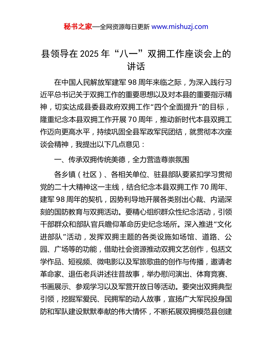 秘书之家—全网资源每日更新 www.mishuzj.com县领导在 2025 年“八一”双拥工作座谈会上的讲话在中国人民解放军建军 98 周年来临之际,为深入践行习近平总书记关于双拥工作的重要思想以及对本县的重要指示精“”神,切实达成县委县政府双拥工作 四个全面提升 的目标,隆重纪念本县双拥工作开展 70 周年,推动新时代本县双拥工作迈向更高水平,持续巩固全县军政军民团结,就贯彻本次座谈会精神,我提出以下几点意见:一、传承双拥传统美德,全力营造尊崇氛围各乡镇(社区)、各相关单位、驻县部队要紧扣学习贯彻党的二十大精神这一主线,结合纪念本县双拥工作 70 周年、建军 98 周年的契机,因势利导地开展各类别出心裁、内涵深刻的国防教育与双拥活动。要精心组织群众性纪念活动,引领“干部群众和部队官兵瞻仰革命历史纪念场所。深入推进 文化”进部队 活动,发挥双拥主题的各类设施如场馆、道路、公园、广场等的功能,借助社会资源推动双拥文艺创作,包括文学作品、短视频、微电影以及军旅歌曲的创作与传播,邀请老革命家、退伍老兵讲述往昔故事,举办慰问演出、体育竞赛、书画展示、参观学习以及军营开放日等活动。要突出双拥典型引领,挖掘军爱民、民拥军的动人故事,宣扬广大军民投身国防和军队建设默默奉献的伟大情怀,不断拓展双拥模范县创建秘书之家—全网资源每日更新 www.mishuzj.com成果,广泛开展双拥宣传工作,激发全县军民传承双拥工作优良传统,充分彰显军民同呼吸共命运的良好精神风貌。二、聚焦部队实际需求,积极踊跃排忧解难其一,深刻学习领会习近平新时代中国特色社会主义思想和习近平强军思想,助力强化一体化国家战略体系和能力建设,严格执行党委议军会、党政领导定期走访部队等制度。其二,增强服务部队备战打仗的使命感,顺应新形势新任务积极探索创新,瞄准拥军支前新目标,扎实推进各类双拥活动,主动与外出驻训部队对接联系,稳步提升拥军支前保障水平,为部队战斗力提升添砖加瓦。其三,千方百计为部队解决在战备训练、工作生活、家属就业、子女入学等方面遭遇的实际问“”题,切实落实解决部队实际问题 三项机制 ,聚焦作战紧急、备战紧要、官兵急需,促使双拥工作扎实创新。要全力支持部队执行训练演习、应急机动、战备执勤、抢险救灾等多样化军事任务,及时跟进提供训练场地、交通运输、安全警戒、生活物资等保障,为部队圆满完成军事任务营造有利环境。其四,持续做好本县立功受奖现役军人家庭送喜报工作,向社会公示立功人员光荣榜,切实保障军人在公共服务领域的各项优待政策。三、秉持宗旨施展长处,推动地方发展建设要坚守全心全意为人民服务的初心使命,充分施展自身特长,强化军地协作,踊跃开展拥政爱民活动,积极为本地群众秘书之家—全网资源每日更新 www.mishuzj.com谋福祉、解难题。要扎实推进乡村振兴战略,持续加大帮扶力度,组织部队官兵利用工作训练闲暇深入帮扶点、援建学校、驻地村庄开展义务诊疗、助学支教、结对帮扶等活动,切实解“”决困难群众的实际生活困难。 八一 期间,各部队要强化纪律监督检查,维护人民军队的光辉形象。当前,本县已进入防汛关键期,各部队要密切关注汛情动态,有针对性地做好抢险救灾和应急救援准备工作,确保在灾情突发时能迅速响应,全力守护人民群众生命财产安全。四、切实履行政策保障,体现党和国家厚爱其一,热情周到地服务退役军人和其他优抚对象,认真贯彻拥军优属、优抚安置政策,积极开展走访慰问军人军属、重点优抚对象的活动,将烈士遗属、牺牲病故军人遗属、老复员军人、残疾军人列为重点慰问对象,核查政策待遇的落实情况,用好用活现有政策和救助渠道,积极给予物质帮扶、精神慰藉、心理疏导等个性化服务。其二,关心关爱退役军人,加大优抚安置政策的宣传广度和深度,扎实开展退役军人就业创业服务工作,通过座谈会、恳谈会、茶话会、观看红色影片等多种方式,掌握退役军人的生活情况和需求,传递党和政府的关心爱护。其三,扎实推进各项帮扶政策的落地实施,做好因自然灾害和重大疾病等特殊困难退役军人的帮扶救助工作。要充分发挥社会化拥军组织的效能,...