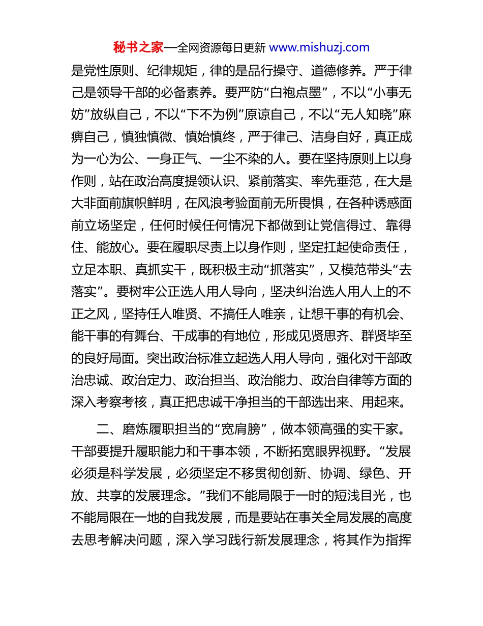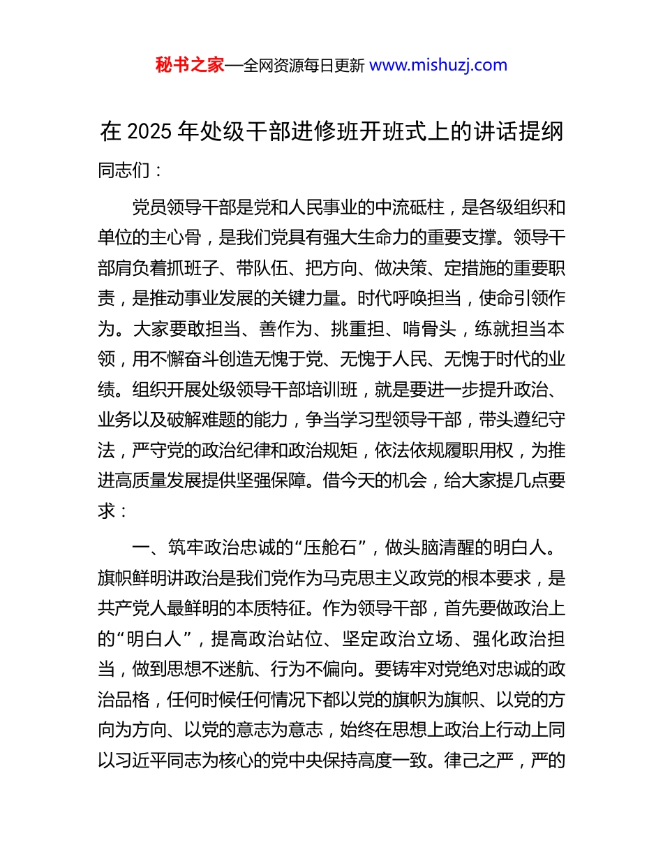 秘书之家—全网资源每日更新 www.mishuzj.com在 2025 年处级干部进修班开班式上的讲话提纲同志们:党员领导干部是党和人民事业的中流砥柱,是各级组织和单位的主心骨,是我们党具有强大生命力的重要支撑。领导干部肩负着抓班子、带队伍、把方向、做决策、定措施的重要职责,是推动事业发展的关键力量。时代呼唤担当,使命引领作为。大家要敢担当、善作为、挑重担、啃骨头,练就担当本领,用不懈奋斗创造无愧于党、无愧于人民、无愧于时代的业绩。组织开展处级领导干部培训班,就是要进一步提升政治、业务以及破解难题的能力,争当学习型领导干部,带头遵纪守法,严守党的政治纪律和政治规矩,依法依规履职用权,为推进高质量发展提供坚强保障。借今天的机会,给大家提几点要求:“”一、筑牢政治忠诚的 压舱石 ,做头脑清醒的明白人。旗帜鲜明讲政治是我们党作为马克思主义政党的根本要求,是共产党人最鲜明的本质特征。作为领导干部,首先要做政治上“”的 明白人 ,提高政治站位、坚定政治立场、强化政治担当,做到思想不迷航、行为不偏向。要铸牢对党绝对忠诚的政治品格,任何时候任何情况下都以党的旗帜为旗帜、以党的方向为方向、以党的意志为意志,始终在思想上政治上行动上同以习近平同志为核心的党中央保持高度一致。律己之严,严的秘书之家—全网资源每日更新 www.mishuzj.com是党性原则、纪律规矩,律的是品行操守、道德修养。严于律“”“己是领导干部的必备素养。要严防 白袍点墨 ,不以 小事无”“”“”妨 放纵自己,不以 下不为例 原谅自己,不以 无人知晓 麻痹自己,慎独慎微、慎始慎终,严于律己、洁身自好,真正成为一心为公、一身正气、一尘不染的人。要在坚持原则上以身作则,站在政治高度提领认识、紧前落实、率先垂范,在大是大非面前旗帜鲜明,在风浪考验面前无所畏惧,在各种诱惑面前立场坚定,任何时候任何情况下都做到让党信得过、靠得住、能放心。要在履职尽责上以身作则,坚定扛起使命责任,“”“立足本职、真抓实干,既积极主动 抓落实 ,又模范带头 去”落实 。要树牢公正选人用人导向,坚决纠治选人用人上的不正之风,坚持任人唯贤、不搞任人唯亲,让想干事的有机会、能干事的有舞台、干成事的有地位,形成见贤思齐、群贤毕至的良好局面。突出政治标准立起选人用人导向,强化对干部政治忠诚、政治定力、政治担当、政治能力、政治自律等方面的深入考察考核,真正把忠诚干净担当的干部选出来、用起来。“”二、磨炼履职担当的 宽肩膀 ,做本领高强的实干家。“干部要提升履职能力和干事本领,不断拓宽眼界视野。 发展必须是科学发展,必须坚定不移贯彻创新、协调、绿色、开”放、共享的发展理念。 我们不能局限于一时的短浅目光,也不能局限在一地的自我发展,而是要站在事关全局发展的高度去思考解决问题,深入学习践行新发展理念,将其作为指挥秘书之家—全网资源每日更新 www.mishuzj.com棒、红绿灯,坚决修正和摒弃不合时宜的老旧观念、片面认识。要统筹好各项发展的重要关系,牢牢掌握发展的主动权,才能做到有的放矢,有效促进经济高质量发展。要进一步增强学好、用好政策的紧迫感,主动加强政策学习,提高政策研究能力,把政策放在全局、长远、大势中理解和把握,吃透上情、摸透下情,找准国家政策落地的结合点,积极争取国家政“策支持,努力把政策机遇转化为推动高质量发展的 真金白”银 。当前,不少领导干部存在专业知识学习不足的问题,特别是对最新前沿科技知识存在一些盲点。要保持如饥似渴的学习状态,做到干什么就学什么、缺什么就补什么,加快知识更新、优化知识结构,既向书本学,又向实践学,努力使自己成为推动高质量发展的行家里手、内行领导。牢固树立改革创新意识,坚持解放思想、实事求是、与时俱进,进一步全面深化改革、扩大开放,不断提高创新思维能力,破除制约高质量发展的思维禁锢和观念壁垒,跟着问题走、奔着问题去,在把握规律的基础上准确识变、科学应变、主动求变,积极推动创新、支持创新、引导创新,让创新成为一种习惯和本能。深入贯彻落实全面深化改革的部署要求,着眼发展所需...