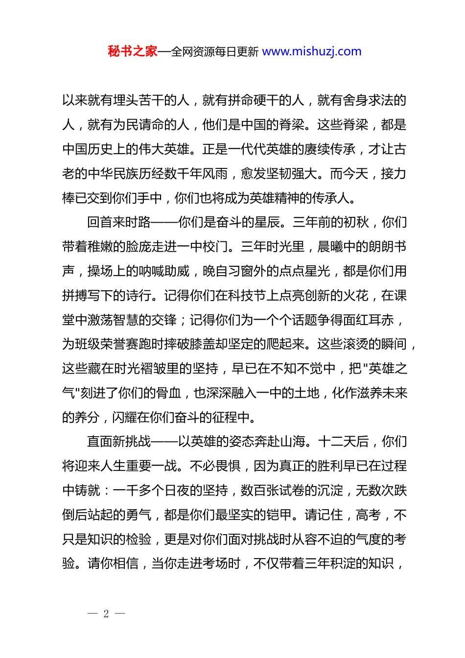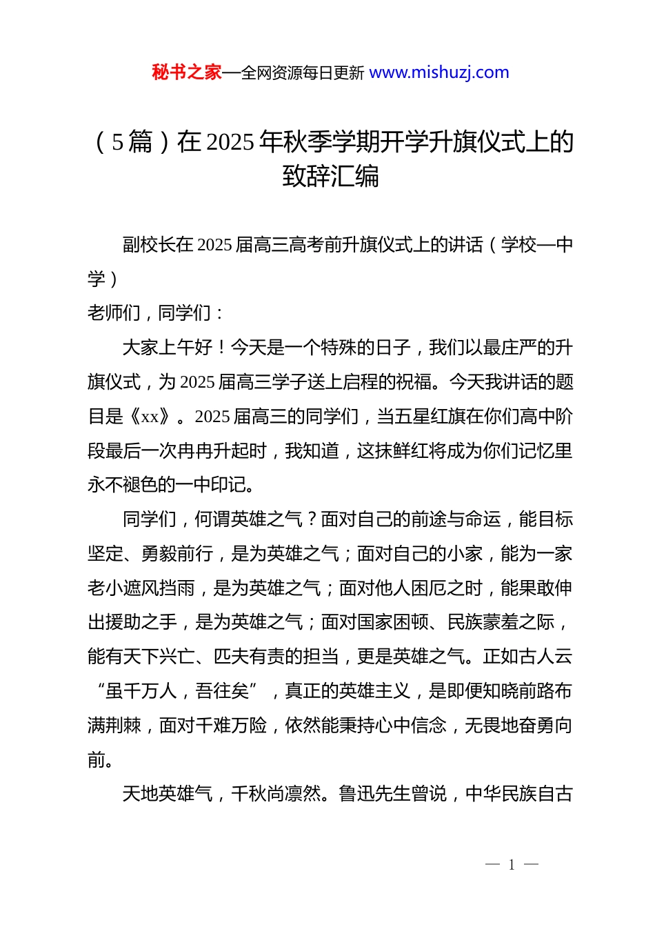 秘书之家—全网资源每日更新 www.mishuzj.com(5 篇)在 2025 年秋季学期开学升旗仪式上的致辞汇编副校长在 2025 届高三高考前升旗仪式上的讲话(学校—中学)老师们,同学们:大家上午好!今天是一个特殊的日子,我们以最庄严的升旗仪式,为 2025 届高三学子送上启程的祝福。今天我讲话的题目是《xx》。2025 届高三的同学们,当五星红旗在你们高中阶段最后一次冉冉升起时,我知道,这抹鲜红将成为你们记忆里永不褪色的一中印记。同学们,何谓英雄之气?面对自己的前途与命运,能目标坚定、勇毅前行,是为英雄之气;面对自己的小家,能为一家老小遮风挡雨,是为英雄之气;面对他人困厄之时,能果敢伸出援助之手,是为英雄之气;面对国家困顿、民族蒙羞之际,能有天下兴亡、匹夫有责的担当,更是英雄之气。正如古人云“虽千万人,吾往矣”,真正的英雄主义,是即便知晓前路布满荆棘,面对千难万险,依然能秉持心中信念,无畏地奋勇向前。天地英雄气,千秋尚凛然。鲁迅先生曾说,中华民族自古— 1 —秘书之家—全网资源每日更新 www.mishuzj.com以来就有埋头苦干的人,就有拼命硬干的人,就有舍身求法的人,就有为民请命的人,他们是中国的脊梁。这些脊梁,都是中国历史上的伟大英雄。正是一代代英雄的赓续传承,才让古老的中华民族历经数千年风雨,愈发坚韧强大。而今天,接力棒已交到你们手中,你们也将成为英雄精神的传承人。回首来时路——你们是奋斗的星辰。三年前的初秋,你们带着稚嫩的脸庞走进一中校门。三年时光里,晨曦中的朗朗书声,操场上的呐喊助威,晚自习窗外的点点星光,都是你们用拼搏写下的诗行。记得你们在科技节上点亮创新的火花,在课堂中激荡智慧的交锋;记得你们为一个个话题争得面红耳赤,为班级荣誉赛跑时摔破膝盖却坚定的爬起来。这些滚烫的瞬间,这些藏在时光褶皱里的坚持,早已在不知不觉中,把"英雄之气"刻进了你们的骨血,也深深融入一中的土地,化作滋养未来的养分,闪耀在你们奋斗的征程中。直面新挑战——以英雄的姿态奔赴山海。十二天后,你们将迎来人生重要一战。不必畏惧,因为真正的胜利早已在过程中铸就:一千多个日夜的坚持,数百张试卷的沉淀,无数次跌倒后站起的勇气,都是你们最坚实的铠甲。请记住,高考,不只是知识的检验,更是对你们面对挑战时从容不迫的气度的考验。请你相信,当你走进考场时,不仅带着三年积淀的知识,— 2 —秘书之家—全网资源每日更新 www.mishuzj.com更带着一中人"公勇诚朴"的精神品格,更会展现出一中人“敢教日月换新天”的豪情与魄力。这份精气神,才是高考送给你们最珍贵的礼物。展望未来时——让生命绽放万千可能。无论何时,请守护三个“永不失传的品质”:保持如饥似渴的学习力——因为这个世界永远嘉奖那些不断进取的追光者;坚守求真向善的初心——别让功利淹没眼里的星光,别让世俗的纷扰掩盖内心的光芒;最重要的是永不熄灭的自信力,永远相信自己的未来——你们这一代,注定要站在 ai 时代重新定义人类的无限可能。请相信,此刻能在题海中劈波斩浪的你们,未来也一定能在更广阔的天地里,写下属于自己的传奇。高三的同学们:临别千言万语,前程万水千山。这是你们在一中校园的最后一次升旗仪式,却也是人生新征程最动人的开场。请记住:无论走到哪里,你们的身后,永远有一中温暖的目光;你们的前方,永远有属于英雄的远方。愿你们带着这份底气,成为无惧风雨,勇往直前的时代英雄,在更广阔的天地里,书写属于自己、属于一中、属于这个时代的传奇!出发吧,2025 届高三的同学们!整个世界都在等待你们汹涌而至!祝你们前程似锦!未来可期!谢谢大家!此次升旗仪式作为“大思政”教育的重要一环,以英雄精— 3 —秘书之家—全网资源每日更新 www.mishuzj.com神为核心,将爱国主义教育与理想信念培育融入校园生活,通过庄严仪式激发师生爱国情怀与奋斗动力,切实发挥“在红旗下成长”系列活动育人实效,助力构建全员全过程全方位育人新格局。校长在 2025 年秋季学期开学升旗仪式上的致辞亲爱的老师们、同学们:大家上午好!在这个晨风微凉、阳光正好的清晨,在全国人民共同纪...