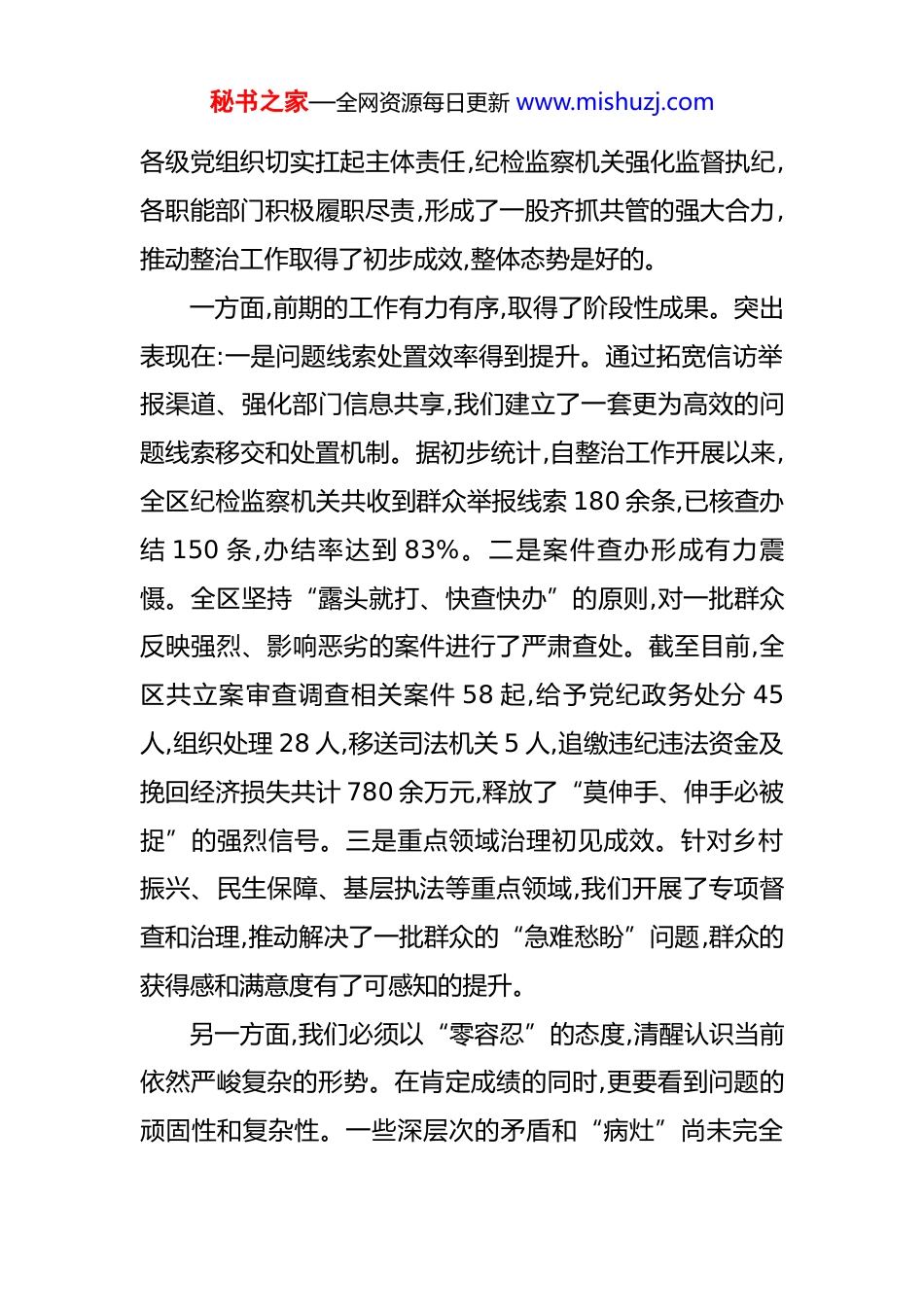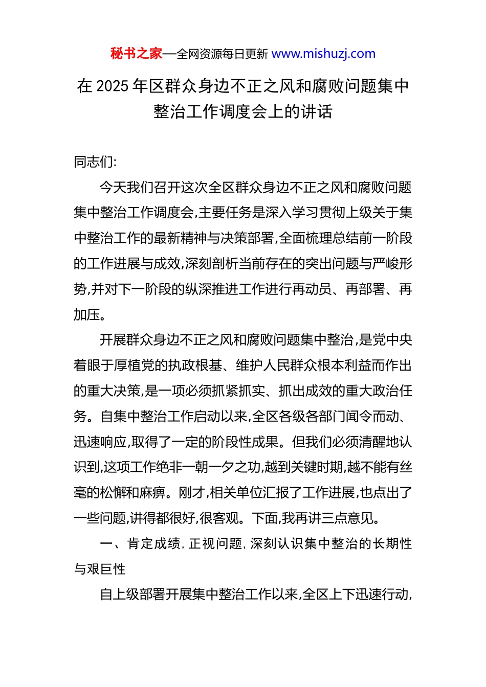 秘书之家—全网资源每日更新 www.mishuzj.com在 2025 年区群众身边不正之风和腐败问题集中整治工作调度会上的讲话 同志们:今天我们召开这次全区群众身边不正之风和腐败问题集中整治工作调度会,主要任务是深入学习贯彻上级关于集中整治工作的最新精神与决策部署,全面梳理总结前一阶段的工作进展与成效,深刻剖析当前存在的突出问题与严峻形势,并对下一阶段的纵深推进工作进行再动员、再部署、再加压。开展群众身边不正之风和腐败问题集中整治,是党中央着眼于厚植党的执政根基、维护人民群众根本利益而作出的重大决策,是一项必须抓紧抓实、抓出成效的重大政治任务。自集中整治工作启动以来,全区各级各部门闻令而动、迅速响应,取得了一定的阶段性成果。但我们必须清醒地认识到,这项工作绝非一朝一夕之功,越到关键时期,越不能有丝毫的松懈和麻痹。刚才,相关单位汇报了工作进展,也点出了一些问题,讲得都很好,很客观。下面,我再讲三点意见。一、肯定成绩,正视问题,深刻认识集中整治的长期性与艰巨性自上级部署开展集中整治工作以来,全区上下迅速行动,秘书之家—全网资源每日更新 www.mishuzj.com各级党组织切实扛起主体责任,纪检监察机关强化监督执纪,各职能部门积极履职尽责,形成了一股齐抓共管的强大合力,推动整治工作取得了初步成效,整体态势是好的。一方面,前期的工作有力有序,取得了阶段性成果。突出表现在:一是问题线索处置效率得到提升。通过拓宽信访举报渠道、强化部门信息共享,我们建立了一套更为高效的问题线索移交和处置机制。据初步统计,自整治工作开展以来,全区纪检监察机关共收到群众举报线索 180 余条,已核查办结 150 条,办结率达到 83%。二是案件查办形成有力震慑。全区坚持“露头就打、快查快办”的原则,对一批群众反映强烈、影响恶劣的案件进行了严肃查处。截至目前,全区共立案审查调查相关案件 58 起,给予党纪政务处分 45人,组织处理 28 人,移送司法机关 5 人,追缴违纪违法资金及挽回经济损失共计 780 余万元,释放了“莫伸手、伸手必被捉”的强烈信号。三是重点领域治理初见成效。针对乡村振兴、民生保障、基层执法等重点领域,我们开展了专项督查和治理,推动解决了一批群众的“急难愁盼”问题,群众的获得感和满意度有了可感知的提升。另一方面,我们必须以“零容忍”的态度,清醒认识当前依然严峻复杂的形势。在肯定成绩的同时,更要看到问题的顽固性和复杂性。一些深层次的矛盾和“病灶”尚未完全秘书之家—全网资源每日更新 www.mishuzj.com根除,稍有松懈就可能反弹回潮。从近期的督导检查和案件查办情况来看,当前我区群众身边的“微腐败”和不正之风依然呈现出一些新的特点和表现形式,主要集中在以下几个方面:第一,乡村振兴领域的“蛀虫”现象依然存在。这是我们整治的重中之重。有的基层干部在惠农补贴、补助资金的发放上动歪脑筋,采取虚报冒领、克扣挪用等手段,将“救命钱”“致富款”装入个人腰包;有的在农村集体“三资”管理上存在严重漏洞,资源发包、资产处置、资金使用不公开、不透明,导致集体资产流失,甚至出现个别村干部监守自盗、肆意侵占的恶劣行为;还有的在耕地保护和项目建设中,内外勾结、利益输送,违规审批、以权谋私,严重损害了集体利益和国家粮食安全根基。比如,近期查处的一个案件中,某村党支部书记利用职务之便,在村级道路硬化项目中,与施工方串通,虚增工程量套取项目资金 20 余万元,性质极为恶劣。这种行为直接侵害了群众的切身利益,动摇的是党的执政根基,必须坚决铲除。第二,民生保障领域的“冷硬横推”问题时有发生。民生无小事,枝叶总关情。但在我们的工作中,仍有一些干部宗旨意识淡薄,对群众缺乏感情。在社会救助、养老社保、医疗保障等领域,存在着优亲厚友、人情保、关系保的现象;有的窗口单位工作人员服务态度生硬、办事效率低下,对群众的合理诉求推诿扯皮、敷衍塞责,让群秘书之家—全网资源每日更新 www.mishuzj.com众“跑断腿、磨破嘴”;甚至在一些关键环节,如资格审核、资金发放等,还存在着“吃拿卡要”的潜规则,不给好处不办事、给了好处乱办事。这些行为虽然看似“微小”,但它像一根根刺,深深扎在群众心里,直接影...