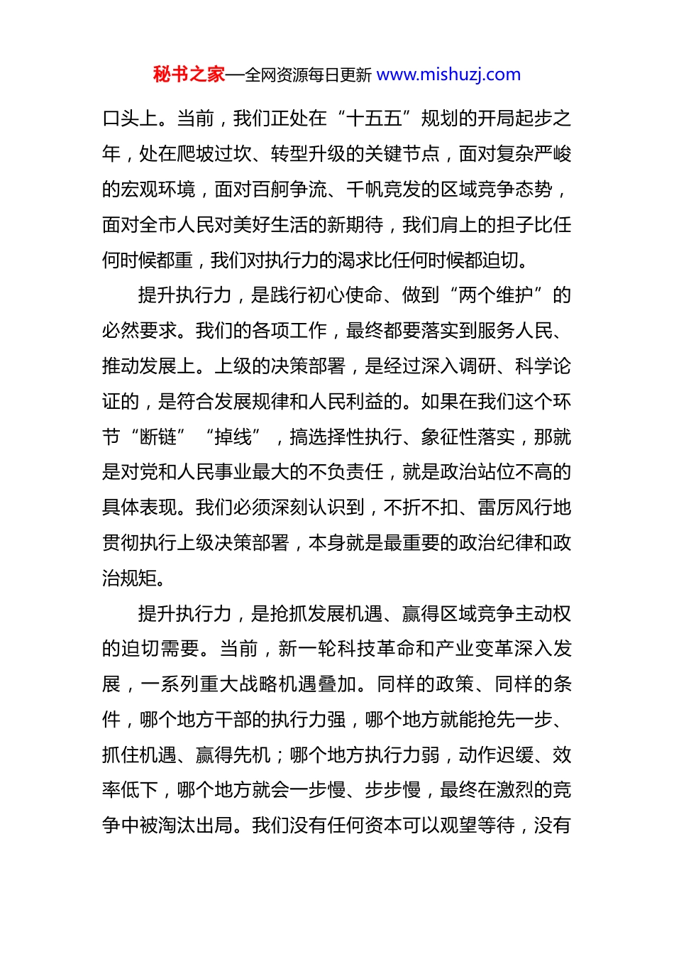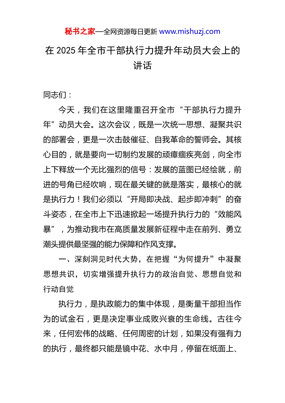 秘书之家—全网资源每日更新 www.mishuzj.com在 2025 年全市干部执行力提升年动员大会上的讲话 同志们:今天,我们在这里隆重召开全市“干部执行力提升年”动员大会。这次会议,既是一次统一思想、凝聚共识的部署会,更是一次击鼓催征、自我革命的誓师会。其核心目的,就是要向一切制约发展的顽瘴痼疾亮剑,向全市上下释放一个无比强烈的信号:发展的蓝图已经绘就,前进的号角已经吹响,现在最关键的就是落实,最核心的就是执行力!我们必须以“开局即决战、起步即冲刺”的奋斗姿态,在全市上下迅速掀起一场提升执行力的“效能风暴”,为推动我市在高质量发展新征程中走在前列、勇立潮头提供最坚强的能力保障和作风支撑。一、深刻洞见时代大势,在把握“为何提升”中凝聚思想共识,切实增强提升执行力的政治自觉、思想自觉和行动自觉执行力,是执政能力的集中体现,是衡量干部担当作为的试金石,更是决定事业成败兴衰的生命线。古往今来,任何宏伟的战略、任何周密的计划,如果没有强有力的执行,最终都只能是镜中花、水中月,停留在纸面上、秘书之家—全网资源每日更新 www.mishuzj.com口头上。当前,我们正处在“十五五”规划的开局起步之年,处在爬坡过坎、转型升级的关键节点,面对复杂严峻的宏观环境,面对百舸争流、千帆竞发的区域竞争态势,面对全市人民对美好生活的新期待,我们肩上的担子比任何时候都重,我们对执行力的渴求比任何时候都迫切。提升执行力,是践行初心使命、做到“两个维护”的必然要求。我们的各项工作,最终都要落实到服务人民、推动发展上。上级的决策部署,是经过深入调研、科学论证的,是符合发展规律和人民利益的。如果在我们这个环节“断链”“掉线”,搞选择性执行、象征性落实,那就是对党和人民事业最大的不负责任,就是政治站位不高的具体表现。我们必须深刻认识到,不折不扣、雷厉风行地贯彻执行上级决策部署,本身就是最重要的政治纪律和政治规矩。提升执行力,是抢抓发展机遇、赢得区域竞争主动权的迫切需要。当前,新一轮科技革命和产业变革深入发展,一系列重大战略机遇叠加。同样的政策、同样的条件,哪个地方干部的执行力强,哪个地方就能抢先一步、抓住机遇、赢得先机;哪个地方执行力弱,动作迟缓、效率低下,哪个地方就会一步慢、步步慢,最终在激烈的竞争中被淘汰出局。我们没有任何资本可以观望等待,没有秘书之家—全网资源每日更新 www.mishuzj.com任何理由可以懈怠拖延。提升执行力,是破除顽瘴痼疾、优化政治生态的内在驱动。我们必须清醒地看到,在我们一些干部身上,执行不力、落实不到位的问题依然突出,有的甚至成为阻碍发展的“中梗阻”。比如,有的存在“守摊子”思想,缺乏闯劲拼劲,工作推一推动一动,不推不动;有的存在“本领恐慌”,面对新形势新任务,老办法不管用,新办法不会用,思路不清、措施不力;有的存在“官僚习气”,服务意识淡薄,门好进、脸好看,但事依然难办;有的存在“形式主义”,习惯于以会议落实会议、以文件落实文件,工作停留在“说了等于做了”“发了等于成了”;还有的存在“好人主义”,不敢动真碰硬,遇到矛盾绕道走,碰到问题往上交、往外推。这些问题虽然只存在于少数人身上,但影响极坏,严重损害了党和政府的形象,严重侵蚀了发展的根基。开展“执行力提升年”活动,就是要对这些作风之弊、行为之垢来一次大排查、大扫除、大检修。二、精准聚焦突出问题,在厘清“提升什么”中明确主攻方向,深刻把握提升执行力的时代内涵和实践要求提升执行力,不是一句空洞的口号,它有着极其丰富和具体的内涵。在新的历史起点上,我们所倡导的执行秘书之家—全网资源每日更新 www.mishuzj.com力,至少应当体现在以下几个方面:一是体现在“闻令而动、马上就办”的雷厉风行上。这是一种态度,更是一种效率。对于定下的事情、看准的工作,要立即行动、抓紧实施,决不允许拖拖拉拉、议而不决、决而不行。要大力倡导“事不过夜”的工作作风,对上级的部署要求,第一时间传达学习、第一时间研究方案、第一时间抓好落实,确保各项决策部署在最短时间内落地生根。二是体现在“不折不扣、精准到位”...