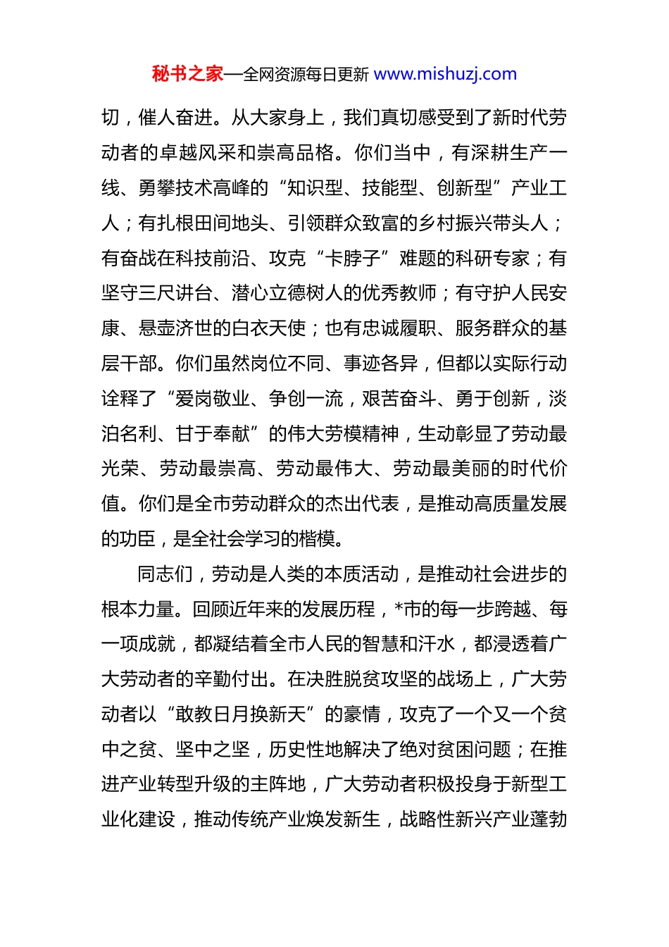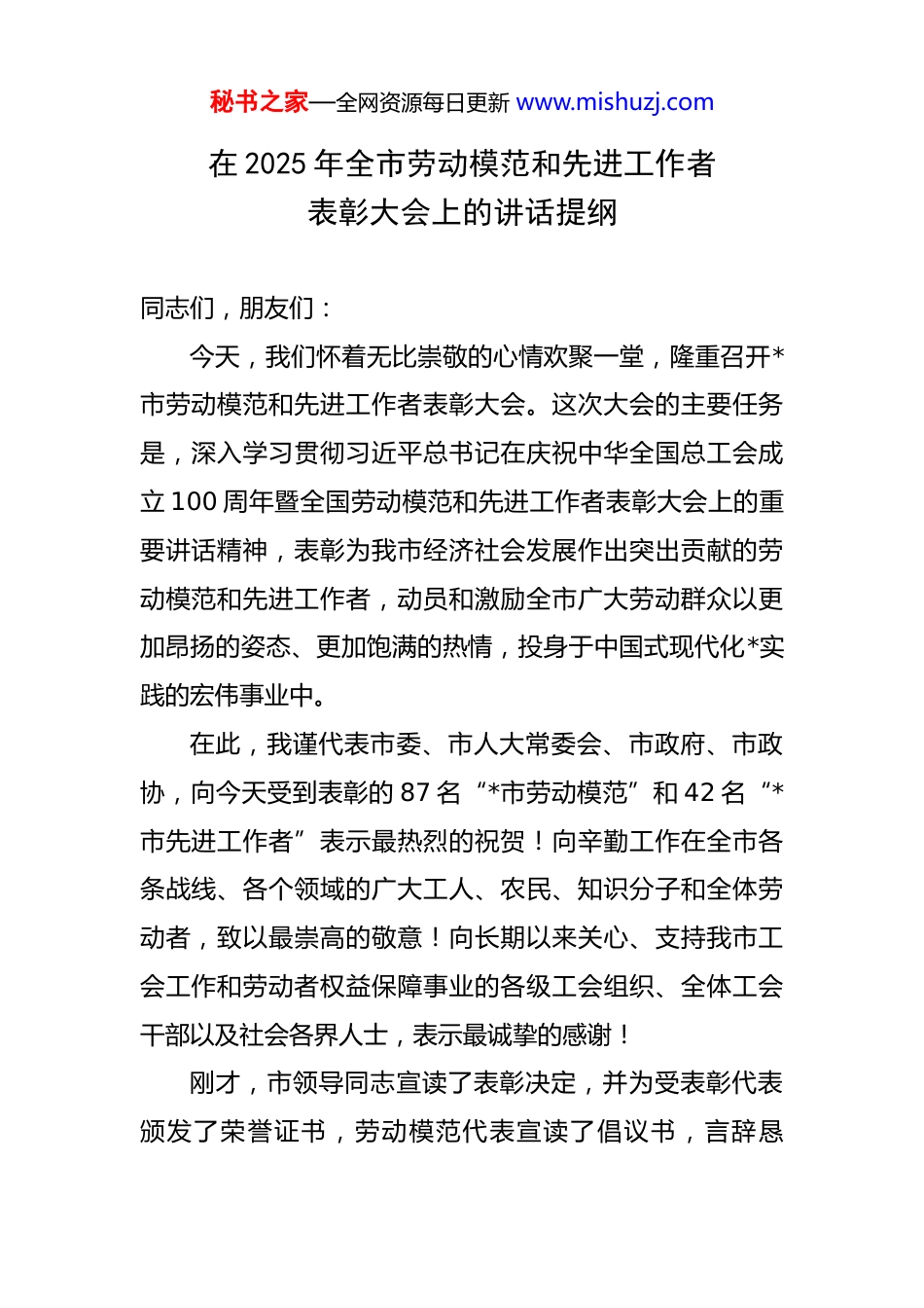 秘书之家—全网资源每日更新 www.mishuzj.com在 2025 年全市劳动模范和先进工作者表彰大会上的讲话提纲 同志们,朋友们:今天,我们怀着无比崇敬的心情欢聚一堂,隆重召开*市劳动模范和先进工作者表彰大会。这次大会的主要任务是,深入学习贯彻习近平总书记在庆祝中华全国总工会成立 100 周年暨全国劳动模范和先进工作者表彰大会上的重要讲话精神,表彰为我市经济社会发展作出突出贡献的劳动模范和先进工作者,动员和激励全市广大劳动群众以更加昂扬的姿态、更加饱满的热情,投身于中国式现代化*实践的宏伟事业中。在此,我谨代表市委、市人大常委会、市政府、市政协,向今天受到表彰的 87 名“*市劳动模范”和 42 名“*市先进工作者”表示最热烈的祝贺!向辛勤工作在全市各条战线、各个领域的广大工人、农民、知识分子和全体劳动者,致以最崇高的敬意!向长期以来关心、支持我市工会工作和劳动者权益保障事业的各级工会组织、全体工会干部以及社会各界人士,表示最诚挚的感谢!刚才,市领导同志宣读了表彰决定,并为受表彰代表颁发了荣誉证书,劳动模范代表宣读了倡议书,言辞恳秘书之家—全网资源每日更新 www.mishuzj.com切,催人奋进。从大家身上,我们真切感受到了新时代劳动者的卓越风采和崇高品格。你们当中,有深耕生产一线、勇攀技术高峰的“知识型、技能型、创新型”产业工人;有扎根田间地头、引领群众致富的乡村振兴带头人;有奋战在科技前沿、攻克“卡脖子”难题的科研专家;有坚守三尺讲台、潜心立德树人的优秀教师;有守护人民安康、悬壶济世的白衣天使;也有忠诚履职、服务群众的基层干部。你们虽然岗位不同、事迹各异,但都以实际行动诠释了“爱岗敬业、争创一流,艰苦奋斗、勇于创新,淡泊名利、甘于奉献”的伟大劳模精神,生动彰显了劳动最光荣、劳动最崇高、劳动最伟大、劳动最美丽的时代价值。你们是全市劳动群众的杰出代表,是推动高质量发展的功臣,是全社会学习的楷模。同志们,劳动是人类的本质活动,是推动社会进步的根本力量。回顾近年来的发展历程,*市的每一步跨越、每一项成就,都凝结着全市人民的智慧和汗水,都浸透着广大劳动者的辛勤付出。在决胜脱贫攻坚的战场上,广大劳动者以“敢教日月换新天”的豪情,攻克了一个又一个贫中之贫、坚中之坚,历史性地解决了绝对贫困问题;在推进产业转型升级的主阵地,广大劳动者积极投身于新型工业化建设,推动传统产业焕发新生,战略性新兴产业蓬勃秘书之家—全网资源每日更新 www.mishuzj.com发展,为我市构建现代化产业体系打下了坚实基础;在统筹城乡发展的广阔天地里,广大劳动者大力推进乡村全面振兴,建设宜居宜业和美乡村,城市功能品质不断提升,城乡面貌日新月异;在科技创新的最前沿,广大劳动者勇于探索、敢为人先,一项项技术革新、一个个发明创造,为发展注入了不竭动力;在疫情防控、抢险救灾等急难险重任务面前,广大劳动者更是闻令而动、逆行出征,用血肉之躯筑起了守护人民生命安全和身体健康的钢铁长城。实践充分证明,人民群众是历史的创造者,劳动群众是推动*市发展的中流砥柱和绝对主力。全市的辉煌成就,属于英雄的*人民,属于光荣的劳动群众!当前,我们正处在一个充满机遇与挑战的伟大时代。党的二十大擘画了以中国式现代化全面推进中华民族伟大复兴的宏伟蓝图。对*市而言,就是要坚定不移地走高质量发展之路,奋力谱写中国式现代化的*新篇章。这既是一项光荣而艰巨的历史使命,也为全市广大劳动者施展才华、建功立业提供了更加广阔的舞台。希望全市广大劳动群众,特别是今天受到表彰的劳动模范和先进工作者,能够珍惜荣誉、再接再厉,自觉担负起时代赋予的光荣使命,用劳动和创造奏响新时代的奋斗壮歌。借此机会,我提几点希望,与大家共勉。秘书之家—全网资源每日更新 www.mishuzj.com一、筑牢信仰之基始终保持劳动者政治本色劳动者是先进生产力和生产关系的代表,是党最坚实、最可靠的阶级基础。广大劳动群众要始终坚持用习近平新时代中国特色社会主义思想武装头脑,深刻领悟“两个确立”的决定性意义,增强“四个意识”、坚定“四个自信”、做到“两个维护”。要...