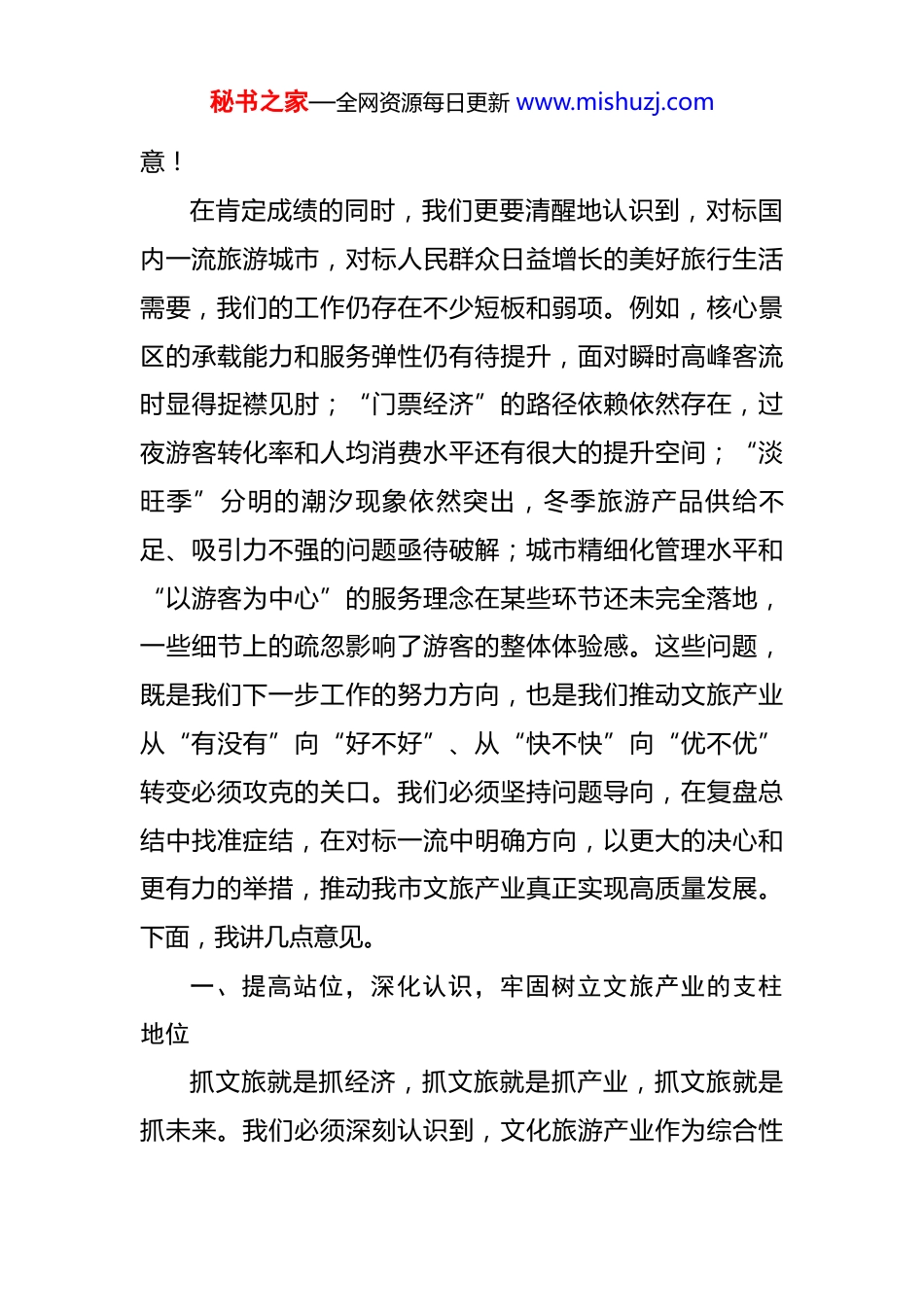 秘书之家—全网资源每日更新 www.mishuzj.com在 2025 年全市文旅产业高质量发展领导小组会议暨国庆中秋假期文旅工作总结会上的讲话 同志们:今天我们召开市文旅产业高质量发展领导小组会议,同时也是一次国庆中秋假期的文旅工作总结会。主要目的就是全面复盘“双节”假期我市的文旅市场情况,总结经验、分析不足,并在此基础上,研究部署下一阶段推动全市文旅产业高质量发展的重点任务。刚才,市文旅局和相关部门的同志分别作了汇报,讲得都很好,我都同意。刚刚过去的国庆中秋“超级黄金周”,是对我市文旅产业发展水平、服务保障能力和应急处置能力的一次集中检验。从各项数据和市场反馈来看,我们交出了一份可圈可点的优异答卷。假期期间,全市 8 家重点监测景区累计接待游客达到 152.04 万人次、实现门票收入 6125.01 万元,同比分别增长 13.12%和 11.69%,文旅市场呈现出供需两旺、安全有序、繁荣兴盛的良好态势。这些成绩的取得,是全市上下认真贯彻落实市委、市政府决策部署,协同作战、共同努力的结果。在此,我代表市委、市政府,向奋战在文旅一线的全体干部职工、公安干警、志愿者和各行各业的劳动者们,表示衷心的感谢和崇高的敬秘书之家—全网资源每日更新 www.mishuzj.com意!在肯定成绩的同时,我们更要清醒地认识到,对标国内一流旅游城市,对标人民群众日益增长的美好旅行生活需要,我们的工作仍存在不少短板和弱项。例如,核心景区的承载能力和服务弹性仍有待提升,面对瞬时高峰客流时显得捉襟见肘;“门票经济”的路径依赖依然存在,过夜游客转化率和人均消费水平还有很大的提升空间;“淡旺季”分明的潮汐现象依然突出,冬季旅游产品供给不足、吸引力不强的问题亟待破解;城市精细化管理水平和“以游客为中心”的服务理念在某些环节还未完全落地,一些细节上的疏忽影响了游客的整体体验感。这些问题,既是我们下一步工作的努力方向,也是我们推动文旅产业从“有没有”向“好不好”、从“快不快”向“优不优”转变必须攻克的关口。我们必须坚持问题导向,在复盘总结中找准症结,在对标一流中明确方向,以更大的决心和更有力的举措,推动我市文旅产业真正实现高质量发展。下面,我讲几点意见。一、提高站位,深化认识,牢固树立文旅产业的支柱地位抓文旅就是抓经济,抓文旅就是抓产业,抓文旅就是抓未来。我们必须深刻认识到,文化旅游产业作为综合性秘书之家—全网资源每日更新 www.mishuzj.com强、关联度大、附加值高的绿色产业、朝阳产业、富民产业,已经成为推动经济转型升级、满足人民美好生活需要的重要引擎。*市文化底蕴深厚,旅游资源得天独厚,这是我们最大的优势和潜力所在。把文化旅游业培育成为全市的战略性支柱产业,是市委、市政府立足当前、着眼长远作出的重大决策部署,绝不是权宜之计,更不是口号工程。全市各级各部门要切实把思想和行动统一到市委、市政府的决策部署上来,将文旅产业发展摆在更加突出、更加核心的位置。要彻底摒弃“旅游只是节假日一阵子”的短期思维和“文旅部门一家之事”的狭隘观念,树立“一盘棋”思想,强化全域统筹、全季布局、全链打造的系统观念。发改、财政、自然资源、住建、交通等部门要主动靠前服务,在项目审批、资金保障、规划衔接、基础设施建设等方面给予文旅产业发展最大的支持。宣传、公安、市场监管、应急管理等部门要各司其职、密切配合,共同营造安全、诚信、文明、有序的旅游环境。我们必须举全市之力,集全民之智,形成推动文旅产业高质量发展的强大合力,真正把资源优势转化为发展优势、经济优势,为我市的现代化建设注入源源不断的强劲动能。二、聚焦核心,强化牵引,着力提升龙头景区的能级秘书之家—全网资源每日更新 www.mishuzj.com和品质核心景区是旅游目的地的“金字招牌”,是吸引客流、塑造品牌、带动全局的战略支点。我们必须集中力量,持续发力,加快推进核心景区建设,不断提升其承载能力、服务功能和品牌影响力。第一,要加快推进*石窟大景区建设。*石窟是世界文化遗产,是我市乃至国家的瑰宝,更是我们文旅产业发展的“根”与“魂”。自 2008 年启动大景区建设工程以...