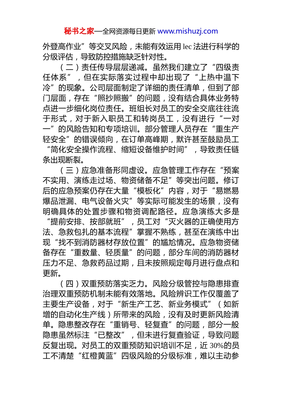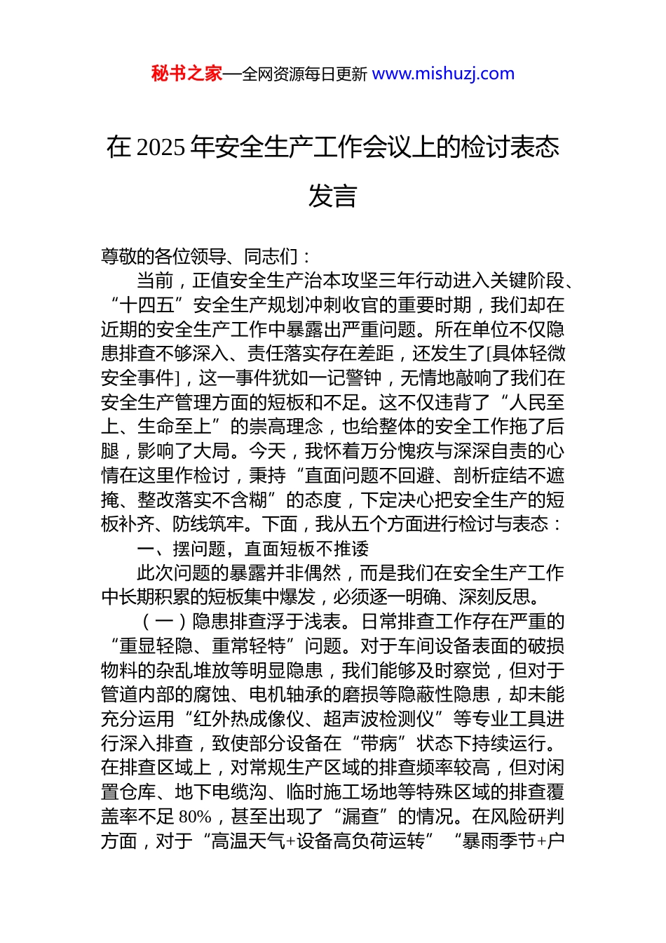 秘书之家—全网资源每日更新 www.mishuzj.com在 2025 年安全生产工作会议上的检讨表态发言尊敬的各位领导、同志们:当前,正值安全生产治本攻坚三年行动进入关键阶段、“十四五”安全生产规划冲刺收官的重要时期,我们却在近期的安全生产工作中暴露出严重问题。所在单位不仅隐患排查不够深入、责任落实存在差距,还发生了[具体轻微安全事件],这一事件犹如一记警钟,无情地敲响了我们在安全生产管理方面的短板和不足。这不仅违背了“人民至上、生命至上”的崇高理念,也给整体的安全工作拖了后腿,影响了大局。今天,我怀着万分愧疚与深深自责的心情在这里作检讨,秉持“直面问题不回避、剖析症结不遮掩、整改落实不含糊”的态度,下定决心把安全生产的短板补齐、防线筑牢。下面,我从五个方面进行检讨与表态:一、摆问题,直面短板不推诿此次问题的暴露并非偶然,而是我们在安全生产工作中长期积累的短板集中爆发,必须逐一明确、深刻反思。(一)隐患排查浮于浅表。日常排查工作存在严重的“重显轻隐、重常轻特”问题。对于车间设备表面的破损物料的杂乱堆放等明显隐患,我们能够及时察觉,但对于管道内部的腐蚀、电机轴承的磨损等隐蔽性隐患,却未能充分运用“红外热成像仪、超声波检测仪”等专业工具进行深入排查,致使部分设备在“带病”状态下持续运行。在排查区域上,对常规生产区域的排查频率较高,但对闲置仓库、地下电缆沟、临时施工场地等特殊区域的排查覆盖率不足 80%,甚至出现了“漏查”的情况。在风险研判方面,对于“高温天气+设备高负荷运转”“暴雨季节+户秘书之家—全网资源每日更新 www.mishuzj.com外登高作业”等交叉风险,未能有效运用 lec 法进行科学的分级评估,导致防控措施缺乏针对性。(二)责任传导层层递减。虽然我们建立了“四级责任体系”,但在实际落实过程中却出现了“上热中温下冷”的现象。公司层面制定了详细的责任清单,但到了部门层面,存在“照抄照搬”的问题,没有结合具体业务特点进一步细化岗位责任。班组长对员工的安全交底往往流于形式,对于新入职员工和转岗员工,没有进行“一对一”的风险告知和专项培训。部分管理人员存在“重生产轻安全”的错误倾向,在订单高峰期,默许甚至鼓励员工“简化安全操作流程、缩短设备维护时间”,导致责任链条出现断裂。(三)应急准备形同虚设。应急管理工作存在“预案不实用、演练走过场、物资储备不足”等突出问题。修订后的应急预案仍存在大量“模板化”内容,对于“易燃易爆品泄漏、电气设备火灾”等实际可能发生的场景,没有明确具体的处置步骤和物资调配路径。应急演练大多是“提前安排、按部就班”,员工对“灭火器的正确使用方法、急救包扎的基本流程”掌握不熟练,甚至在演练中出现“找不到消防器材存放位置”的尴尬情况。应急物资储备存在“重数量、轻质量”的问题,部分车间的消防器材压力不足、急救药品过期,且未按照规定每月进行盘点和更新。(四)双重预防落实乏力。风险分级管控与隐患排查治理双重预防机制未能有效落地。风险辨识工作仅覆盖了主要生产设备,对于“新生产工艺、新业务模式”(如新增的自动化生产线)所带来的风险,没有及时更新风险清单。隐患整改存在“重销号、轻复查”的问题,部分一般隐患虽然标注“已整改”,但未进行复查验证,导致问题反复出现。对员工的双重预防知识培训不足,近 30%的员工不清楚“红橙黄蓝”四级风险的分级标准,难以主动参秘书之家—全网资源每日更新 www.mishuzj.com与到风险防控工作中来。二、挖根源,剖析症结不护短透过问题的表象,深入挖掘根源,我们发现主要是在思想认识、管理机制、人员能力三个方面存在偏差,必须深刻反思、引以为戒。(一)思想认识存在偏差。根本原因在于“忧患意识淡薄、底线思维缺失”。存在“经验主义”的错误观念,认为“过去没出过事,现在也不会出事”,对安全生产形势的严峻性和复杂性认识不足。在生产任务繁重时,潜意识里将“保进度、赶产量”放在首位,忽视了安全生产的重要性,导致安全管理工作被边缘化。存在“侥幸心理”觉得“小隐患不会引发大事故”,对排查出的“设备轻微震动、线路轻...