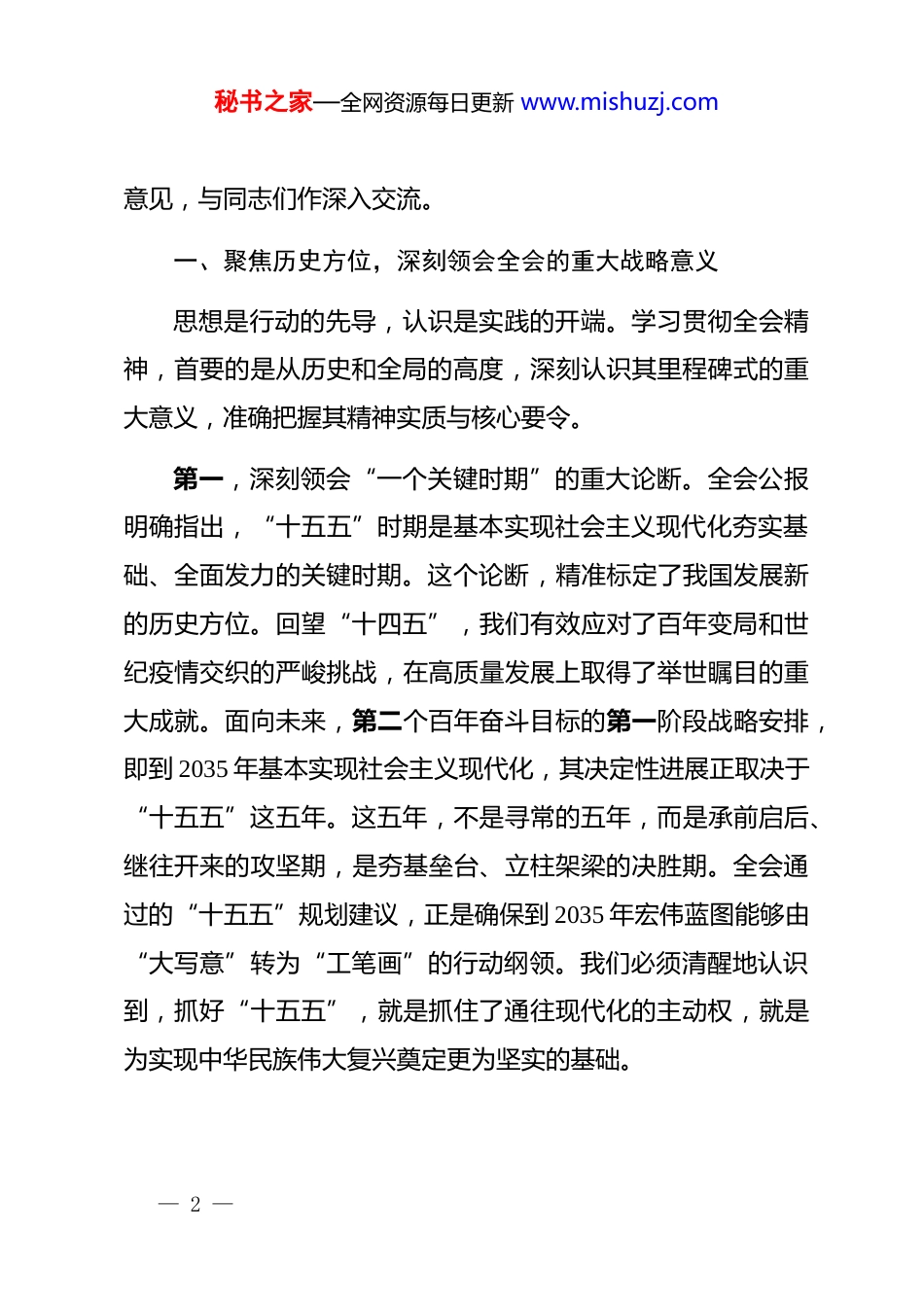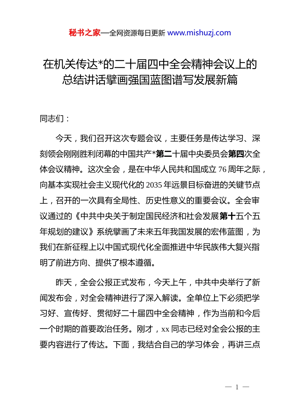 秘书之家—全网资源每日更新 www.mishuzj.com在机关传达*的二十届四中全会精神会议上的总结讲话擘画强国蓝图谱写发展新篇同志们:今天,我们召开这次专题会议,主要任务是传达学习、深刻领会刚刚胜利闭幕的中国共产*第二十届中央委员会第四次全体会议精神。这次全会,是在中华人民共和国成立 76 周年之际,向基本实现社会主义现代化的 2035 年远景目标奋进的关键节点上,召开的一次具有全局性、历史性意义的重要会议。全会审议通过的《中共中央关于制定国民经济和社会发展第十五个五年规划的建议》系统擘画了未来五年我国发展的宏伟蓝图,为我们在新征程上以中国式现代化全面推进中华民族伟大复兴指明了前进方向、提供了根本遵循。昨天,全会公报正式发布,今天上午,中共中央举行了新闻发布会,对全会精神进行了深入解读。全单位上下必须把学习好、宣传好、贯彻好二十届四中全会精神,作为当前和今后一个时期的首要政治任务。刚才,xx 同志已经对全会公报的主要内容进行了传达。下面,我结合自己的学习体会,再讲三点— 1 —秘书之家—全网资源每日更新 www.mishuzj.com意见,与同志们作深入交流。一、聚焦历史方位,深刻领会全会的重大战略意义思想是行动的先导,认识是实践的开端。学习贯彻全会精神,首要的是从历史和全局的高度,深刻认识其里程碑式的重大意义,准确把握其精神实质与核心要令。第一,深刻领会“一个关键时期”的重大论断。全会公报明确指出,“十五五”时期是基本实现社会主义现代化夯实基础、全面发力的关键时期。这个论断,精准标定了我国发展新的历史方位。回望“十四五”,我们有效应对了百年变局和世纪疫情交织的严峻挑战,在高质量发展上取得了举世瞩目的重大成就。面向未来,第二个百年奋斗目标的第一阶段战略安排,即到 2035 年基本实现社会主义现代化,其决定性进展正取决于“十五五”这五年。这五年,不是寻常的五年,而是承前启后、继往开来的攻坚期,是夯基垒台、立柱架梁的决胜期。全会通过的“十五五”规划建议,正是确保到 2035 年宏伟蓝图能够由“大写意”转为“工笔画”的行动纲领。我们必须清醒地认识到,抓好“十五五”,就是抓住了通往现代化的主动权,就是为实现中华民族伟大复兴奠定更为坚实的基础。— 2 —秘书之家—全网资源每日更新 www.mishuzj.com第二,深刻领会“一条光明大道”的坚定宣示。全会重申,要坚持以**************思想为指导,全面贯彻*的二十大精神,坚定不移沿着中国式现代化这条强国建设、民族复兴的康庄大道奋勇前进。这不仅是对过往成功经验的高度总结,更是对未来发展道路的郑重宣示。中国式现代化,是中国共产*领导的社会主义现代化,它打破了“现代化=西方化”的迷思,创造了人类文明新形态。全会围绕统筹推进“五位一体”总体布局、协调推进“四个全面”战略布局作出的系统部署,进一步丰富和发展了中国式现代化的理论和实践内涵。这充分彰显了*中央高超的治国理政智慧和坚定的战略定力,也要求我们必须把“两个确立”的决定性意义领悟得更深,把“两个维护”的政治自觉体悟得更透,始终在思想上政治上行动上同以***同志为核心的*中央保持高度一致。第三,深刻领会“一份系统方案”的宏大布局。“十五五”规划建议不是孤立的,而是与*的二十大报告提出的宏伟目标一脉相承、紧密衔接的战略深化和具体部署。公报内容涵盖约 4931 字,从坚持高质量发展是新时代的硬道理,到以科技自立自强引领现代化产业体系建设;从全面深化改革构建高水平社会主义市场经济体制,到推进城乡融合和区域协调发展;从— 3 —秘书之家—全网资源每日更新 www.mishuzj.com建设更高水平的文化强国,到切实增进民生福祉;从推动绿色发展促进人与自然和谐共生,到统筹发展和安全建设更高水平的平安中国乃至推进祖国统一大业和全面从严治*等,共计作出了 12 个方面的战略部署。这些部署,既有高瞻远瞩的战略擘画,又有精准务实的战术安排,构成了一个逻辑严密、内涵丰富、系统集成的“任务书”和“施工图”。特别是其中首次提出的“航天强国”、“交通强国”等新概念,进一步明确了重点突破方向,展现了*和国家面...