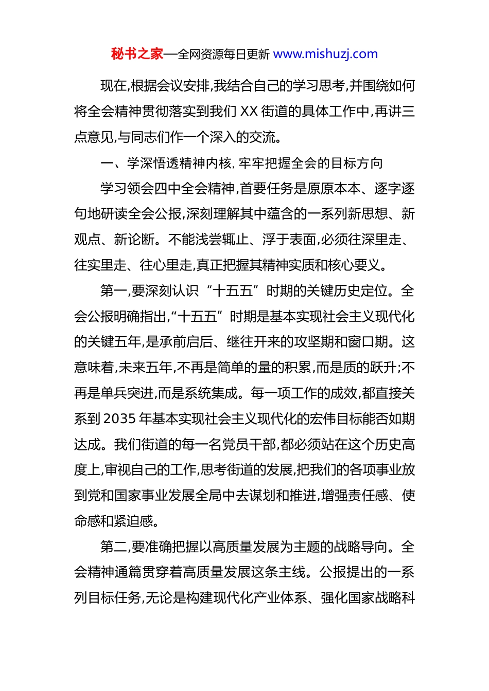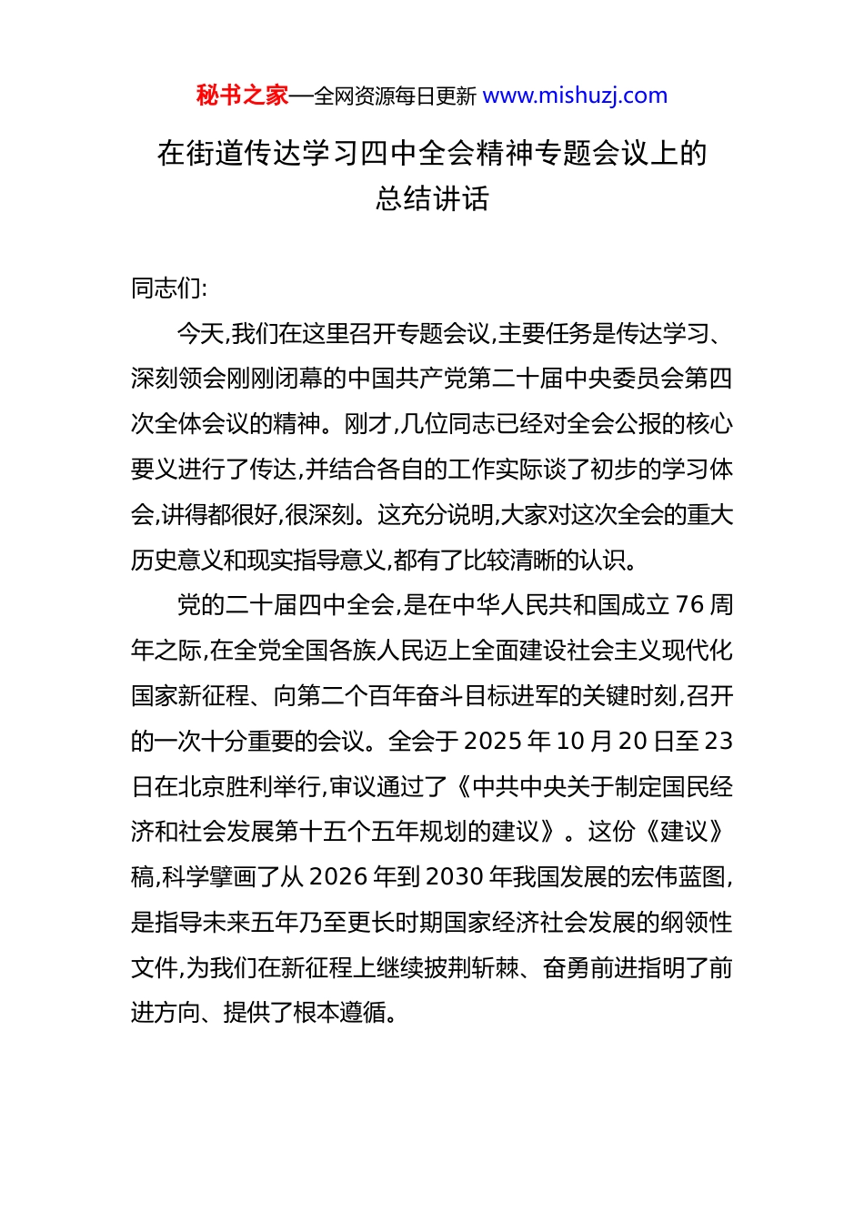 秘书之家—全网资源每日更新 www.mishuzj.com在街道传达学习四中全会精神专题会议上的总结讲话 同志们:今天,我们在这里召开专题会议,主要任务是传达学习、深刻领会刚刚闭幕的中国共产党第二十届中央委员会第四次全体会议的精神。刚才,几位同志已经对全会公报的核心要义进行了传达,并结合各自的工作实际谈了初步的学习体会,讲得都很好,很深刻。这充分说明,大家对这次全会的重大历史意义和现实指导意义,都有了比较清晰的认识。党的二十届四中全会,是在中华人民共和国成立 76 周年之际,在全党全国各族人民迈上全面建设社会主义现代化国家新征程、向第二个百年奋斗目标进军的关键时刻,召开的一次十分重要的会议。全会于 2025 年 10 月 20 日至 23日在北京胜利举行,审议通过了《中共中央关于制定国民经济和社会发展第十五个五年规划的建议》。这份《建议》稿,科学擘画了从 2026 年到 2030 年我国发展的宏伟蓝图,是指导未来五年乃至更长时期国家经济社会发展的纲领性文件,为我们在新征程上继续披荆斩棘、奋勇前进指明了前进方向、提供了根本遵循。秘书之家—全网资源每日更新 www.mishuzj.com现在,根据会议安排,我结合自己的学习思考,并围绕如何将全会精神贯彻落实到我们 XX 街道的具体工作中,再讲三点意见,与同志们作一个深入的交流。一、学深悟透精神内核,牢牢把握全会的目标方向学习领会四中全会精神,首要任务是原原本本、逐字逐句地研读全会公报,深刻理解其中蕴含的一系列新思想、新观点、新论断。不能浅尝辄止、浮于表面,必须往深里走、往实里走、往心里走,真正把握其精神实质和核心要义。第一,要深刻认识“十五五”时期的关键历史定位。全会公报明确指出,“十五五”时期是基本实现社会主义现代化的关键五年,是承前启后、继往开来的攻坚期和窗口期。这意味着,未来五年,不再是简单的量的积累,而是质的跃升;不再是单兵突进,而是系统集成。每一项工作的成效,都直接关系到 2035 年基本实现社会主义现代化的宏伟目标能否如期达成。我们街道的每一名党员干部,都必须站在这个历史高度上,审视自己的工作,思考街道的发展,把我们的各项事业放到党和国家事业发展全局中去谋划和推进,增强责任感、使命感和紧迫感。第二,要准确把握以高质量发展为主题的战略导向。全会精神通篇贯穿着高质量发展这条主线。公报提出的一系列目标任务,无论是构建现代化产业体系、强化国家战略科秘书之家—全网资源每日更新 www.mishuzj.com技力量,还是全面推进乡村振兴、促进区域协调发展,最终都指向发展的质量和效益。对于我们街道而言,高质量发展不是一个空洞的概念。它体现在我们经济发展的“含金量”上,要求我们不能只盯着传统的指标,更要关注科技创新企业的引进、楼宇经济的坪效、辖区商圈的活力;它体现在城市管理的“精细度”上,要求我们从群众身边的一条路、一盏灯、一个井盖做起,下足“绣花”功夫;它体现在公共服务的“满意度”上,要求我们的服务供给更加均衡、更加优质、更加精准地对接群众需求。第三,要坚定贯彻全面深化改革和推进治理能力现代化的核心要求。改革是发展的根本动力。全会强调,要坚定不移推进全面深化改革,着力破解深层次体制机制障碍,为高质量发展注入强大动能。同时,全会也对推进国家治理体系和治理能力现代化作出了新的重大部署。这与我们基层工作息息相关。街道作为国家治理体系的“神经末梢”,是党和政府联系群众、服务群众的“最后一公里”。全会释放出的强烈信号是,基层治理必须向更高效能、更高水平迈进。这意味着过去的“老办法”可能不灵了,过去的“旧路径”可能走不通了。我们必须以改革的精神、创新的勇气,去探索基层治理的新模式、新手段,切实提升我们应对复杂局面、服务人民群众的本领。秘书之家—全网资源每日更新 www.mishuzj.com二、立足街道职能定位,持续提升基层治理能力水平学习的目的全在于应用。将四中全会描绘的宏伟蓝图转化为 XX 街道的生动实践,关键在于找准结合点和发力点,把街道的职能定位与全会的要求部署精准对接。街道办事处作为区委、区政府的派出机关,承担着加强党的建设、统筹区域发展、组织公共服务、实施综合管理、动员社会参与...