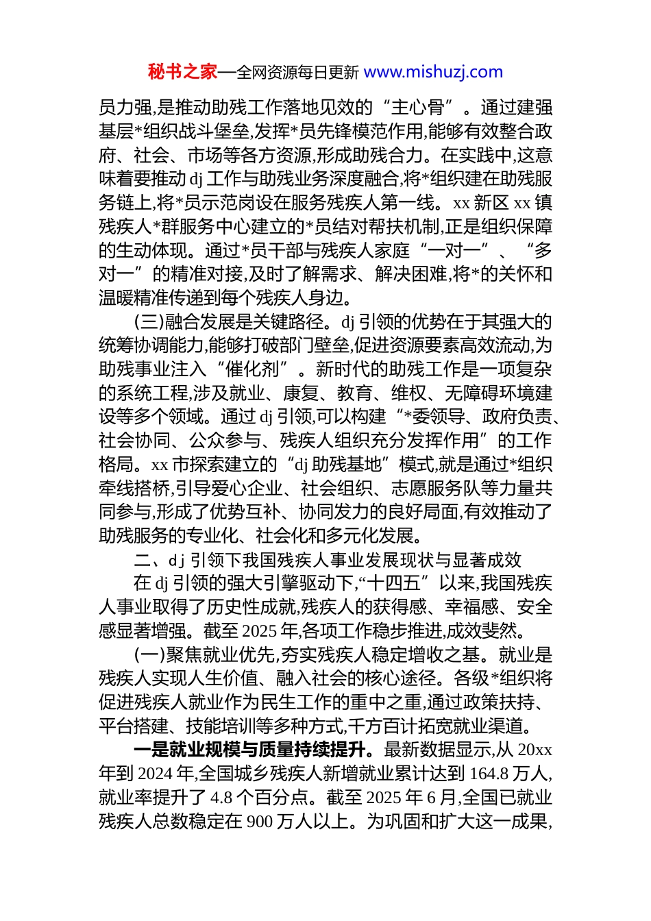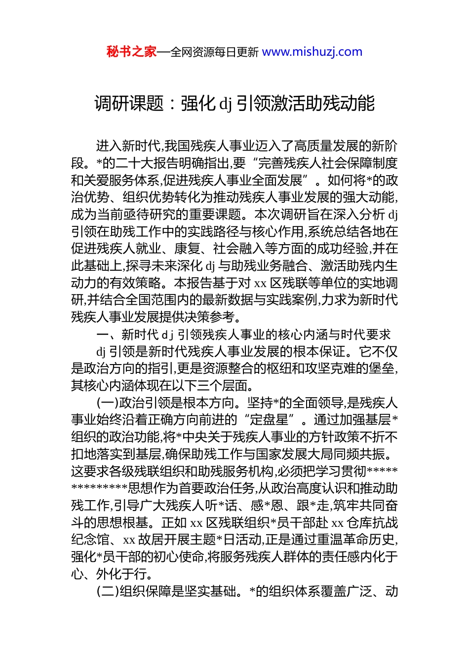 秘书之家—全网资源每日更新 www.mishuzj.com调研课题:强化 dj 引领激活助残动能进入新时代,我国残疾人事业迈入了高质量发展的新阶段。*的二十大报告明确指出,要“完善残疾人社会保障制度和关爱服务体系,促进残疾人事业全面发展”。如何将*的政治优势、组织优势转化为推动残疾人事业发展的强大动能,成为当前亟待研究的重要课题。本次调研旨在深入分析 dj引领在助残工作中的实践路径与核心作用,系统总结各地在促进残疾人就业、康复、社会融入等方面的成功经验,并在此基础上,探寻未来深化 dj 与助残业务融合、激活助残内生动力的有效策略。本报告基于对 xx 区残联等单位的实地调研,并结合全国范围内的最新数据与实践案例,力求为新时代残疾人事业发展提供决策参考。一、新时代 dj 引领残疾人事业的核心内涵与时代要求dj 引领是新时代残疾人事业发展的根本保证。它不仅是政治方向的指引,更是资源整合的枢纽和攻坚克难的堡垒,其核心内涵体现在以下三个层面。(一)政治引领是根本方向。坚持*的全面领导,是残疾人事业始终沿着正确方向前进的“定盘星”。通过加强基层*组织的政治功能,将*中央关于残疾人事业的方针政策不折不扣地落实到基层,确保助残工作与国家发展大局同频共振。这要求各级残联组织和助残服务机构,必须把学习贯彻**************思想作为首要政治任务,从政治高度认识和推动助残工作,引导广大残疾人听*话、感*恩、跟*走,筑牢共同奋斗的思想根基。正如 xx 区残联组织*员干部赴 xx 仓库抗战纪念馆、xx 故居开展主题*日活动,正是通过重温革命历史,强化*员干部的初心使命,将服务残疾人群体的责任感内化于心、外化于行。(二)组织保障是坚实基础。*的组织体系覆盖广泛、动秘书之家—全网资源每日更新 www.mishuzj.com员力强,是推动助残工作落地见效的“主心骨”。通过建强基层*组织战斗堡垒,发挥*员先锋模范作用,能够有效整合政府、社会、市场等各方资源,形成助残合力。在实践中,这意味着要推动 dj 工作与助残业务深度融合,将*组织建在助残服务链上,将*员示范岗设在服务残疾人第一线。xx 新区 xx 镇残疾人*群服务中心建立的*员结对帮扶机制,正是组织保障的生动体现。通过*员干部与残疾人家庭“一对一”、“多对一”的精准对接,及时了解需求、解决困难,将*的关怀和温暖精准传递到每个残疾人身边。(三)融合发展是关键路径。dj 引领的优势在于其强大的统筹协调能力,能够打破部门壁垒,促进资源要素高效流动,为助残事业注入“催化剂”。新时代的助残工作是一项复杂的系统工程,涉及就业、康复、教育、维权、无障碍环境建设等多个领域。通过 dj 引领,可以构建“*委领导、政府负责、社会协同、公众参与、残疾人组织充分发挥作用”的工作格局。xx 市探索建立的“dj 助残基地”模式,就是通过*组织牵线搭桥,引导爱心企业、社会组织、志愿服务队等力量共同参与,形成了优势互补、协同发力的良好局面,有效推动了助残服务的专业化、社会化和多元化发展。二、dj 引领下我国残疾人事业发展现状与显著成效在 dj 引领的强大引擎驱动下,“十四五”以来,我国残疾人事业取得了历史性成就,残疾人的获得感、幸福感、安全感显著增强。截至 2025 年,各项工作稳步推进,成效斐然。(一)聚焦就业优先,夯实残疾人稳定增收之基。就业是残疾人实现人生价值、融入社会的核心途径。各级*组织将促进残疾人就业作为民生工作的重中之重,通过政策扶持、平台搭建、技能培训等多种方式,千方百计拓宽就业渠道。一是就业规模与质量持续提升。最新数据显示,从 20xx年到 2024 年,全国城乡残疾人新增就业累计达到 164.8 万人,就业率提升了 4.8 个百分点。截至 2025 年 6 月,全国已就业残疾人总数稳定在 900 万人以上。为巩固和扩大这一成果,秘书之家—全网资源每日更新 www.mishuzj.com中国残联等部门联合印发了《促进残疾人就业三年行动方案》,为未来三年的就业工作提供了清晰的路线图。二是 dj 引领就业模式不断创新。各地积极探索“dj+”就业服务新模式。调研中了解到的 xx 镇“三阳机构”便是一个典型。该机构在*组织的指导下,设立“阳光工坊”、“爱心超市”等实体化运作...