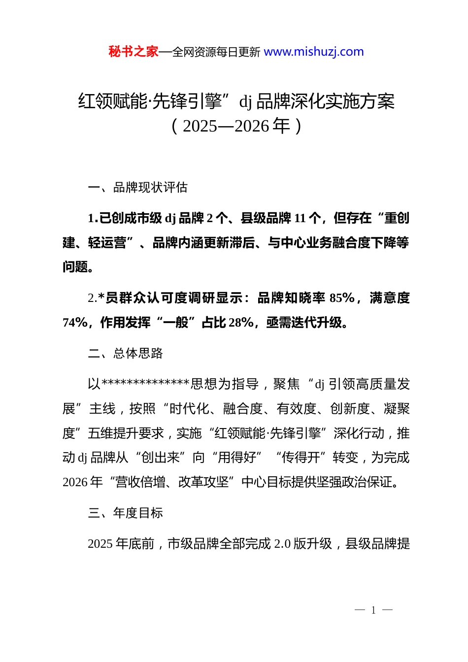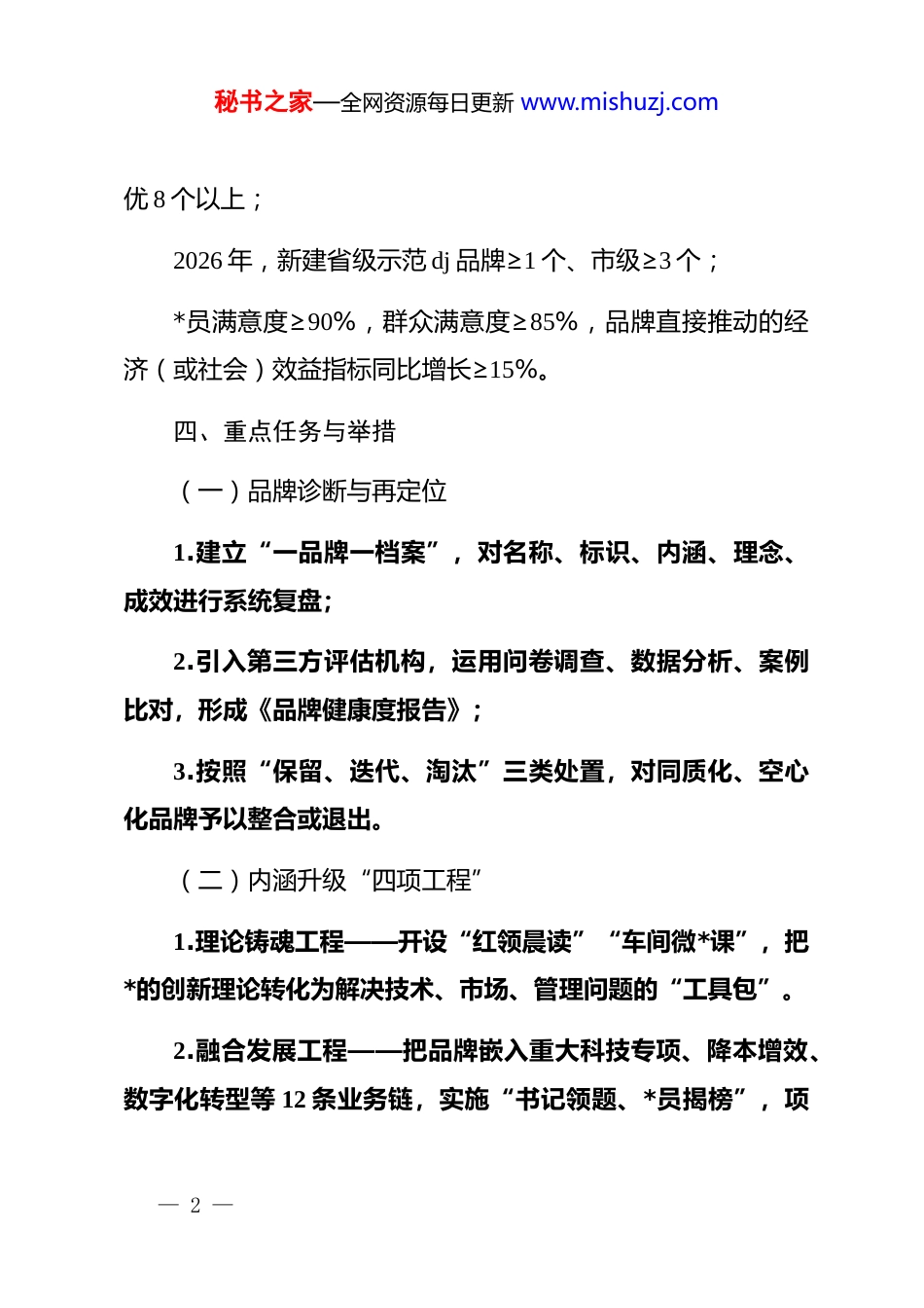 秘书之家—全网资源每日更新 www.mishuzj.com红领赋能·先锋引擎”dj 品牌深化实施方案(2025—2026 年)一、品牌现状评估1.已创成市级 dj 品牌 2 个、县级品牌 11 个,但存在“重创建、轻运营”、品牌内涵更新滞后、与中心业务融合度下降等问题。2.*员群众认可度调研显示:品牌知晓率 85%,满意度74%,作用发挥“一般”占比 28%,亟需迭代升级。二、总体思路以**************思想为指导,聚焦“dj 引领高质量发展”主线,按照“时代化、融合度、有效度、创新度、凝聚度”五维提升要求,实施“红领赋能·先锋引擎”深化行动,推动 dj 品牌从“创出来”向“用得好”“传得开”转变,为完成2026 年“营收倍增、改革攻坚”中心目标提供坚强政治保证。三、年度目标2025 年底前,市级品牌全部完成 2.0 版升级,县级品牌提— 1 —秘书之家—全网资源每日更新 www.mishuzj.com优 8 个以上;2026 年,新建省级示范 dj 品牌≥1 个、市级≥3 个;*员满意度≥90%,群众满意度≥85%,品牌直接推动的经济(或社会)效益指标同比增长≥15%。四、重点任务与举措(一)品牌诊断与再定位1.建立“一品牌一档案”,对名称、标识、内涵、理念、成效进行系统复盘;2.引入第三方评估机构,运用问卷调查、数据分析、案例比对,形成《品牌健康度报告》;3.按照“保留、迭代、淘汰”三类处置,对同质化、空心化品牌予以整合或退出。(二)内涵升级“四项工程”1.理论铸魂工程——开设“红领晨读”“车间微*课”,把*的创新理论转化为解决技术、市场、管理问题的“工具包”。2.融合发展工程——把品牌嵌入重大科技专项、降本增效、数字化转型等 12 条业务链,实施“书记领题、*员揭榜”,项— 2 —秘书之家—全网资源每日更新 www.mishuzj.com目完成率与绩效奖金挂钩。3.数智赋能工程——上线“红领云”平台,与 erp、mes 数据互通,实时展示支部攻坚指标、*员积分、品牌贡献度,实现可视化、可量化、可预警。4.典型示范工程——每年选树 10 个“金牌支部”、100 名“先锋*员”,制作短视频、动漫、直播课,全网传播量突破1000 万人次。(三)载体创新“3+3”矩阵1.三大固定载体:*员突击队、*员责任区、*员示范岗;2.三大动态载体:红色研学路线、红色创客空间、红色直播基地;形成“固定+动态”互补,满足科研、生产、营销等不同场景需求。(四)制度固化与标准建设1.制定《dj 品牌建设与运行规范》地方标准,涵盖“创建-评价-复评-退出”全周期;2.建立“一化四度”量化指标(时代化、融合度、有效度、创新度、凝聚度),评价结果纳入*组织书记述职评议考核权重— 3 —秘书之家—全网资源每日更新 www.mishuzj.com不低于 30%;3.实行“月点检、季督导、年总评”闭环管理,对连续两次排名末位的品牌予以黄牌警告并限期整改。(五)宣传推广与形象塑造1.构建“报、网、端、微、屏”全媒体矩阵,开设“红领赋能”专题专栏;2.与主流媒体合作拍摄纪录片、电教片,在中央、省级平台播出;3.设计品牌 ip 形象(logo、表情包、文创产品),在高铁、地铁、商圈户外屏滚动投放,提升社会辨识度。五、时间安排-025 年 q3:完成诊断评估、再定位;2025 年 q4:发布新版品牌内涵、视觉识别系统;2026 年 q1—q2:实施数智平台上线、典型示范选树;2026 年 q3:开展省级现场会、成果发布;2026 年 q4:总结表彰、建立长效运行机制。— 4 —秘书之家—全网资源每日更新 www.mishuzj.com六、保障措施1.组织保障:成立由*委书记任组长的品牌深化领导小组,办公室设在组织部,抽调纪检、宣传、人力、财务等骨干集中办公。2.经费保障:每年单列 dj 品牌专项资金,与经营预算同步下达;鼓励社会资本、企业基金以项目化方式参与。3.队伍保障:实施“品牌官”培养计划,两年培养 100 名懂业务、精策划、善传播的复合型人才;建立外部专家库,引入高校、咨询机构提供智力支持。4.考核激励:把品牌深化成效与干部选拔、评先评优、绩效薪酬硬挂钩,对获得省级以上荣誉的团队给予重奖,并在职级晋升中优先考虑。七、预期成果形成“1+n”dj 品牌集群(1 个省级龙头...