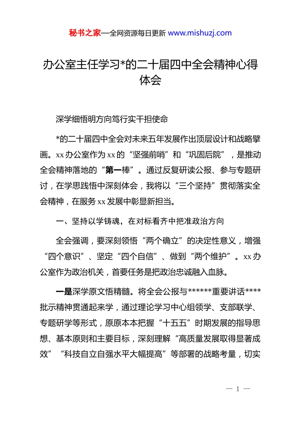 秘书之家—全网资源每日更新 www.mishuzj.com办公室主任学习*的二十届四中全会精神心得体会深学细悟明方向笃行实干担使命*的二十届四中全会对未来五年发展作出顶层设计和战略擘画。xx 办公室作为 xx 的“坚强前哨”和“巩固后院”,是推动全会精神落地的“第一棒”。通过反复研读公报、参与专题研讨,在学思践悟中深刻体会,我将以“三个坚持”贯彻落实全会精神,在服务 xx 发展中彰显新担当。一、坚持以学铸魂,在对标看齐中把准政治方向全会强调,要深刻领悟“两个确立”的决定性意义,增强“四个意识”、坚定“四个自信”、做到“两个维护”。xx 办公室作为政治机关,首要任务是把政治忠诚融入血脉。一是深学原文悟精髓。将全会公报与******重要讲话****批示精神贯通起来学,通过理论学习中心组领学、支部联学、专题研学等形式,原原本本把握“十五五”时期发展的指导思想、基本原则和主要目标,深刻理解“高质量发展取得显著成效”“科技自立自强水平大幅提高”等部署的战略考量,切实— 1 —秘书之家—全网资源每日更新 www.mishuzj.com把思想和行动统一到*中央决策上来。二是对标对表强定力。始终把政治标准贯穿办文、办会、办事全过程,建立“会前学精神、会中传精神、会后抓落实”工作闭环,在起草 xx 文件时精准体现全会要求,在组织重大会议时突出政治导向,在落实决策部署时强化政治担当,确保县域工作始终沿着正确方向前进。三是以学促思明定位。深刻认识到 xx 办公室是“承上启下、协调左右”的关键枢纽,必须站在“服务中国式现代化建设”的高度谋划工作,把全会提出的“统筹发展和安全”“推进农业农村现代化”等任务,转化为服务 xx 决策的具体思路,当好贯彻全会精神的“第一方阵”。二、坚持以干践行,在服务大局中彰显担当作为全会提出,“十五五”时期要以推动高质量发展为主题,以改革创新为根本动力。xx 办公室作为 xx 治理的“中枢神经”,必须主动对接大局、服务大局。一是当好决策“参谋助手”。聚焦全会部署的“建设现代化产业体系”“加快构建高水平社会主义市场经济体制”等任务,牵头开展“xx 实体经济发展”“城乡融合体制创新”等专— 2 —秘书之家—全网资源每日更新 www.mishuzj.com题调研,深入企业、乡村收集一手资料,梳理制约发展的体制机制障碍,形成针对性强的调研报告,为 xx 科学决策提供支撑。建立“政策解读+基层问需”机制,组织职能部门拆解全会政策要点,结合 xx 实际细化落实举措,确保上级部署精准落地。二是抓好落实“统筹协调”。针对全会提出的“进一步全面深化改革取得新突破”要求,建立 xx 重大决策落实台账,实行“清单化管理、项目化推进、常态化督办”。对“巩固拓展脱贫攻坚成果”“美丽中国建设”等重点工作,牵头协调农业农村、生态环境等部门建立联动机制,破解跨领域、跨部门协作难题。创新督查方式,变“事后检查”为“全程跟踪”,及时发现落实中的堵点,推动问题在一线解决。三是做好服务“保障支撑”。践行“以人民为中心”的发展思想,把全会“满足人民日益增长的美好生活需要”的要求融入日常服务。优化 xx 信访接待流程,建立“群众诉求—办公室转办—部门办理—跟踪反馈”闭环,推动解决教育、医疗等群众急难愁盼问题。深化基层减负,严格控制会议文件数量,统筹规范督查考核,让基层干部有更多时间抓落实,把全会精神转化为群众可感的民生实效。三、坚持以严立身,在固本强基中锤炼过硬作风— 3 —秘书之家—全网资源每日更新 www.mishuzj.com全会强调,必须以永远在路上的坚韧和执着,持之以恒推进全面从严治*,坚决把*的自我革命要求落实到位,推进*的作风建设常态化长效化。xx 办公室必须以更高标准抓好自身建设。一是锤炼务实作风。传承“马上就办、真抓实干”的优良传统,对 xx 部署的全会精神落实任务,做到“今日事今日毕”;对基层反映的困难问题,第一时间协调回应。力戒形式主义,在文稿起草中突出“短实新”,在督查工作中注重“深准实”,以务实作风提升服务质效。二是强化能力建设。针对全会提出的“科技自立自强”“数字中国建设”等新任务,组织干部...