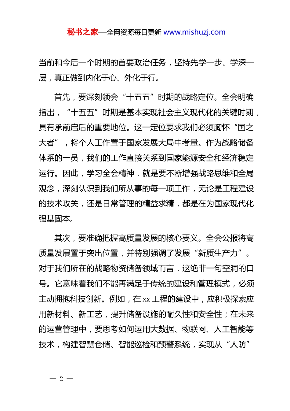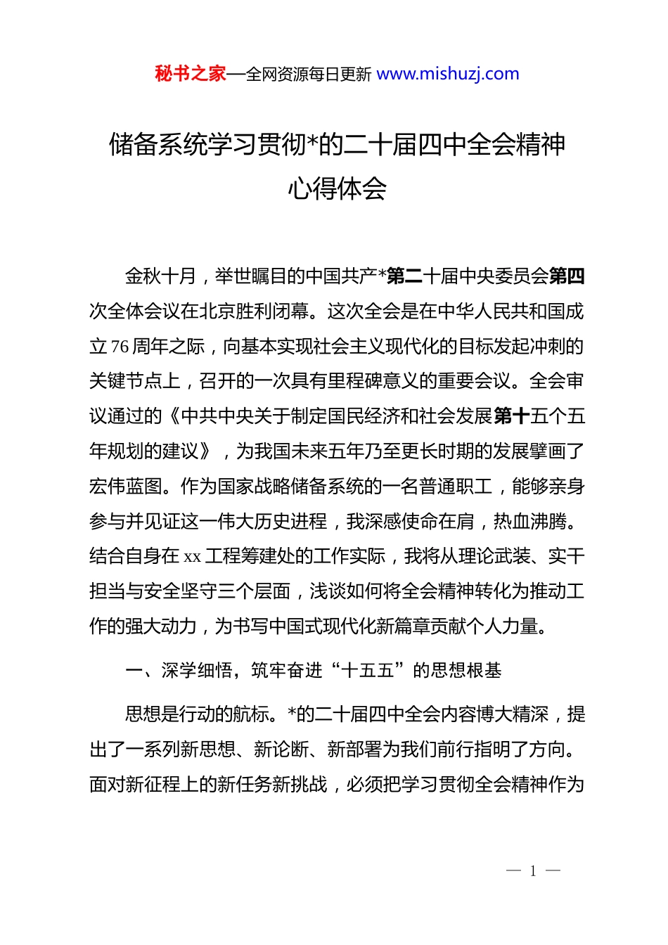 秘书之家—全网资源每日更新 www.mishuzj.com储备系统学习贯彻*的二十届四中全会精神心得体会金秋十月,举世瞩目的中国共产*第二十届中央委员会第四次全体会议在北京胜利闭幕。这次全会是在中华人民共和国成立 76 周年之际,向基本实现社会主义现代化的目标发起冲刺的关键节点上,召开的一次具有里程碑意义的重要会议。全会审议通过的《中共中央关于制定国民经济和社会发展第十五个五年规划的建议》,为我国未来五年乃至更长时期的发展擘画了宏伟蓝图。作为国家战略储备系统的一名普通职工,能够亲身参与并见证这一伟大历史进程,我深感使命在肩,热血沸腾。结合自身在 xx 工程筹建处的工作实际,我将从理论武装、实干担当与安全坚守三个层面,浅谈如何将全会精神转化为推动工作的强大动力,为书写中国式现代化新篇章贡献个人力量。一、深学细悟,筑牢奋进“十五五”的思想根基思想是行动的航标。*的二十届四中全会内容博大精深,提出了一系列新思想、新论断、新部署为我们前行指明了方向。面对新征程上的新任务新挑战,必须把学习贯彻全会精神作为— 1 —秘书之家—全网资源每日更新 www.mishuzj.com当前和今后一个时期的首要政治任务,坚持先学一步、学深一层,真正做到内化于心、外化于行。首先,要深刻领会“十五五”时期的战略定位。全会明确指出,“十五五”时期是基本实现社会主义现代化的关键时期,具有承前启后的重要地位。这一定位要求我们必须胸怀“国之大者”,将个人工作置于国家发展大局中考量。作为战略储备体系的一员,我们的工作直接关系到国家能源安全和经济稳定运行。因此,学习全会精神,就是要不断增强战略思维和全局观念,深刻认识到我们所从事的每一项工作,无论是工程建设的技术攻关,还是日常管理的精益求精,都是在为国家现代化强基固本。其次,要准确把握高质量发展的核心要义。全会公报将高质量发展置于突出位置,并特别强调了发展“新质生产力”。对于我们所在的战略物资储备领域而言,这绝非一句空洞的口号。它意味着我们不能再满足于传统的建设和管理模式,必须主动拥抱科技创新。例如,在 xx 工程的建设中,应积极探索应用新材料、新工艺,提升储备设施的耐久性和安全性;在未来的运营管理中,要思考如何运用大数据、物联网、人工智能等技术,构建智慧仓储、智能巡检和预警系统,实现从“人防”— 2 —秘书之家—全网资源每日更新 www.mishuzj.com到“技防”的跨越,这正是将“新质生产力”的要求落到实处的具体体现。最后,要系统学习并践行全会提出的“六个坚持”等重要原则。这些原则是“十五五”时期推动各项工作的根本遵循。通过反复研读全会公报和相关解读,真正理解坚持*的全面领导的根本保证作用,理解坚持人民至上的价值取向,理解坚持深化改革开放的动力源泉,从而确保我们在具体工作中,无论面对何种复杂局面,都能保持清醒头脑,站稳政治立场,确保储备事业始终沿着正确方向前进。二、勇于担当,推动规划蓝图在基层落地生根一分部署,九分落实。*的二十届四中全会为我们描绘的宏伟蓝图,需要千千万万奋斗者通过实干来将其变为现实。作为身处工程建设一线的基层职工,更应发扬“钉钉子”精神,将全会精神融入岗位职责,以实际行动推动规划建议中的各项任务在基层落地见效。立足岗位实际,积极投身于高质量项目建设。全会部署了涵盖产业体系、科技创新、国家安全等 12 项重大任务我们正在建设的 xx 工程,正是保障国家能源安全、完善现代产业体系的— 3 —秘书之家—全网资源每日更新 www.mishuzj.com关键一环。在建设过程中,金属罐体的防腐工艺、管道的精密密封防漏技术等,不仅是工程质量的生命线,更是未来设施安全运营的核心保障。这就要求我必须以极高的责任心和使命感,将全会提出的高质量发展要求,落实到每一道工序、每一个焊点、每一次检测中。要敢于对不符合标准的施工说“不”,勤于学习和引进先进的工程技术与管理经验,确保建成的储备设施能够成为经得起时间和任务考验的精品工程、放心工程。面对新情况新问题,勇于破解发展难题。改革与发展之路从无坦途。“十五五”规划的实施过程中,必然会遇到各...