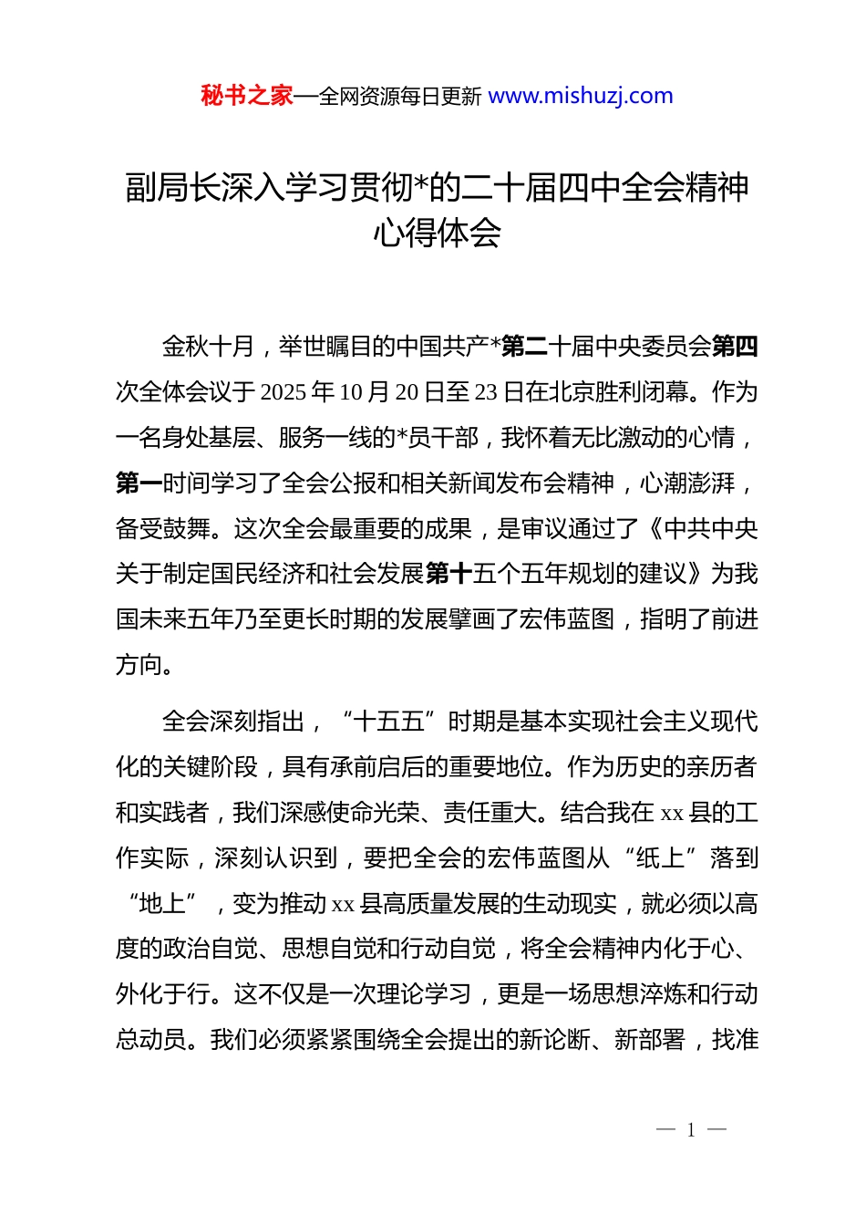 秘书之家—全网资源每日更新 www.mishuzj.com副局长深入学习贯彻*的二十届四中全会精神心得体会金秋十月,举世瞩目的中国共产*第二十届中央委员会第四次全体会议于 2025 年 10 月 20 日至 23 日在北京胜利闭幕。作为一名身处基层、服务一线的*员干部,我怀着无比激动的心情,第一时间学习了全会公报和相关新闻发布会精神,心潮澎湃,备受鼓舞。这次全会最重要的成果,是审议通过了《中共中央关于制定国民经济和社会发展第十五个五年规划的建议》为我国未来五年乃至更长时期的发展擘画了宏伟蓝图,指明了前进方向。全会深刻指出,“十五五”时期是基本实现社会主义现代化的关键阶段,具有承前启后的重要地位。作为历史的亲历者和实践者,我们深感使命光荣、责任重大。结合我在 xx 县的工作实际,深刻认识到,要把全会的宏伟蓝图从“纸上”落到“地上”,变为推动 xx 县高质量发展的生动现实,就必须以高度的政治自觉、思想自觉和行动自觉,将全会精神内化于心、外化于行。这不仅是一次理论学习,更是一场思想淬炼和行动总动员。我们必须紧紧围绕全会提出的新论断、新部署,找准— 1 —秘书之家—全网资源每日更新 www.mishuzj.com自身定位,扛起应尽之责。一、筑牢思想根基,为“十五五”宏伟蓝图定向领航思想是行动的先导。全会精神博大精深,蕴含着一系列新理念、新思想、新战略,是我们开启新征程、迎接新挑战的根本遵循。作为基层干部,首要任务就是学深悟透全会精神,用*的创新理论武装头脑、指导实践。首先,要深刻领会“十五五”时期的战略定位。全会强调,“十五五”时期要确保基本实现社会主义现代化取得决定性进展。这意味着我们正处在一个爬坡过坎、攻坚克难的关键节点。对于我们 xx 县而言,不能再满足于过去的成绩,必须清醒认识到发展不平衡不充分的问题依然存在,产业结构升级、城乡融合发展、民生保障改善等方面还有很长的路要走。必须增强忧患意识,保持战略定力,集中力量办好自己的事,将思想和行动统一到中央的判断和部署上来。其次,要牢牢把握“六个必须坚持”的根本原则。全会提出的“坚持*的全面领导、坚持人民至上、坚持高质量发展、坚持全面深化改革、坚持有效市场和有为政府相结合、坚持统筹发展和安全”这六大原则是“十五五”时期经济社会发展的— 2 —秘书之家—全网资源每日更新 www.mishuzj.com“定盘星”和“指南针”。特别是“坚持人民至上”,要求我们一切工作的出发点和落脚点都要为了人民。在 xx 县,这意味着我们的项目规划、政策制定、资金投向,都必须首先回答“群众是否答应、是否满意、是否受益”的问题。例如,在推进我县的 xx 特色产业园项目时,就不能只算经济账,更要算民生账、生态账,确保发展成果更多更公平惠及全县人民。二、强化担当实干,以严明纪律护航“十五五”落地生根一分部署,九分落实。全会提出的 12 项重大任务,涵盖产业、科技、市场、改革、开放、农业、区域、文化、民生、绿色、安全、国防等方方面面构成了“十五五”时期的“施工图”。要将这张“施工图”变为“实景画”,离不开一支政治过硬、作风优良、纪律严明的干部队伍。第一,要聚焦重点任务精准发力。全会部署的任务中,有多项与我县发展息息相关。比如,“加快推进农业农村现代化”,对我县这个农业占比较大的地区而言,就是要大力发展智慧农业、生态农业,延伸农产品加工产业链,拓宽农民增收渠道。“建设现代化产业体系”就是要立足我县的资源禀赋和产业基础,积极拥抱新质生产力,谋划布局如低空经济、绿色能源等符合未来发展方向的新兴产业避免低水平重复建设。— 3 —秘书之家—全网资源每日更新 www.mishuzj.com“扎实推进民生改善”,更是我们工作的重中之重。我们要拿出“计时器”和“验收单”,对教育、医疗、养老等领域的短板弱项,逐一明确责任人、时间表,确保年度目标如期完成。第二,要以过硬作风狠抓落实。蓝图再好,不干也只是镜花水月。全会精神的贯彻落实,容不得半点虚功。必须坚决反对形式主义、官僚主义,深入开展整治形式主义为基层减负工作。作为分管 xx 工作的副职,我深感肩上责任之重。在今后...