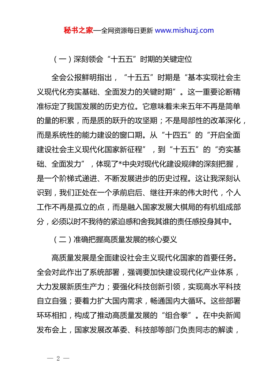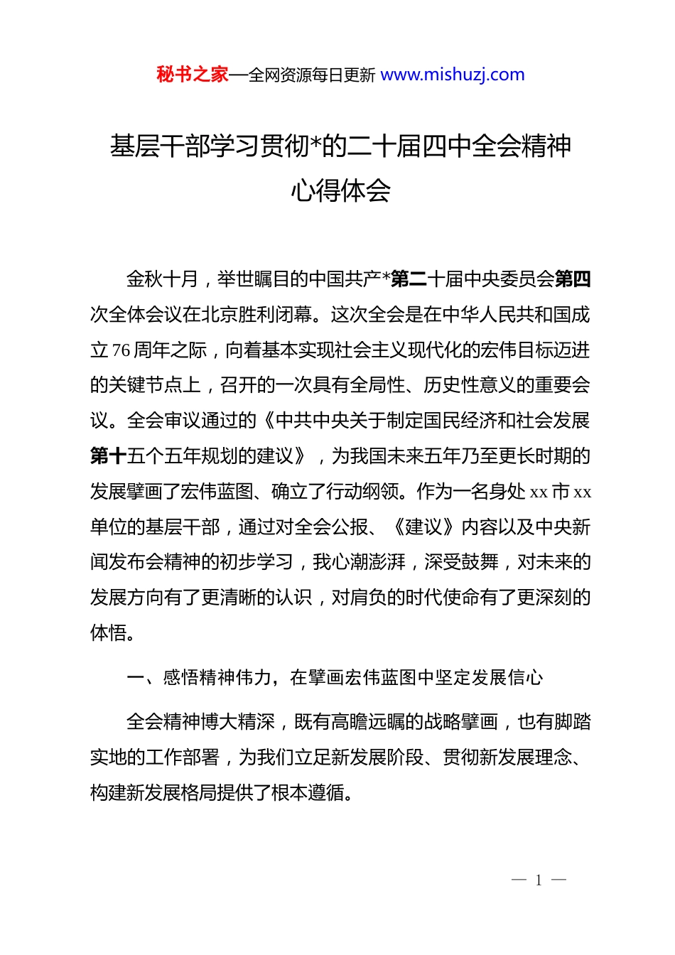 秘书之家—全网资源每日更新 www.mishuzj.com基层干部学习贯彻*的二十届四中全会精神心得体会金秋十月,举世瞩目的中国共产*第二十届中央委员会第四次全体会议在北京胜利闭幕。这次全会是在中华人民共和国成立 76 周年之际,向着基本实现社会主义现代化的宏伟目标迈进的关键节点上,召开的一次具有全局性、历史性意义的重要会议。全会审议通过的《中共中央关于制定国民经济和社会发展第十五个五年规划的建议》,为我国未来五年乃至更长时期的发展擘画了宏伟蓝图、确立了行动纲领。作为一名身处 xx 市 xx单位的基层干部,通过对全会公报、《建议》内容以及中央新闻发布会精神的初步学习,我心潮澎湃,深受鼓舞,对未来的发展方向有了更清晰的认识,对肩负的时代使命有了更深刻的体悟。一、感悟精神伟力,在擘画宏伟蓝图中坚定发展信心全会精神博大精深,既有高瞻远瞩的战略擘画,也有脚踏实地的工作部署,为我们立足新发展阶段、贯彻新发展理念、构建新发展格局提供了根本遵循。— 1 —秘书之家—全网资源每日更新 www.mishuzj.com(一)深刻领会“十五五”时期的关键定位全会公报鲜明指出,“十五五”时期是“基本实现社会主义现代化夯实基础、全面发力的关键时期”。这一重要论断精准标定了我国发展的历史方位。它意味着未来五年不再是简单的量的积累,而是质的跃升的攻坚期;不是局部性的改革深化,而是系统性的能力建设的窗口期。从“十四五”的“开启全面建设社会主义现代化国家新征程”,到“十五五”的“夯实基础、全面发力”,体现了*中央对现代化建设规律的深刻把握,是一个阶梯式递进、不断发展进步的历史过程。这让我深刻认识到,我们正处在一个承前启后、继往开来的伟大时代,个人工作不再是孤立的点,而是融入国家发展大棋局的有机组成部分,必须以时不我待的紧迫感和舍我其谁的责任感投身其中。(二)准确把握高质量发展的核心要义高质量发展是全面建设社会主义现代化国家的首要任务。全会对此作出了系统部署,强调要加快建设现代化产业体系,大力发展新质生产力;要强化科技创新引领,实现高水平科技自立自强;要着力扩大国内需求,畅通国内大循环。这些部署环环相扣,构成了推动高质量发展的“组合拳”。在中央新闻发布会上,国家发展改革委、科技部等部门负责同志的解读,— 2 —秘书之家—全网资源每日更新 www.mishuzj.com让我更加清晰地看到,未来的发展将更加注重内涵和质量。作为 xx 市的一员,我深知本地正处于产业转型升级的关键时期。全会精神为我们的工作指明了方向:必须坚决摒弃传统粗放的发展模式,紧紧围绕科技创新这个“牛鼻子”,积极推动本地的 xx 项目和 xx 产业园区的建设,努力在培育新质生产力、构建现代化产业体系上展现新作为,为坚决破除阻碍全国统一大市场建设的卡点堵点贡献 xx 力量。(三)牢固树立统筹发展和安全的底线思维安全是发展的前提,发展是安全的保障。全会公报将“统筹发展和安全”作为“十五五”时期经济社会发展必须遵循的重要原则之一。面对波谲云诡的国际形势和国内改革发展稳定的繁重任务,这一原则显得尤为重要。它要求我们在谋划工作时,既要敢于在发展上奋勇争先,又要善于在安全上防范未然。具体到我的本职工作,无论是参与制定政策,还是推进具体项目,都必须进行全面的风险评估,既要评估经济效益,也要评估社会影响和安全风险,确保各项工作在安全、稳定、有序的轨道上运行。这不仅是对事业负责,更是对人民群众的生命财产安全负责。二、深化理论武装,在学思践悟中明确前行方向— 3 —秘书之家—全网资源每日更新 www.mishuzj.com学习贯彻全会精神,不能停留在口头上、止步于思想环节,而应深入骨髓、融入血脉,转化为指导实践、推动工作的强大思想武器。(一)坚持原原本本学,做到融会贯通“学而不思则罔,思而不学则殆。”全会公报和《建议》内容丰富、思想深邃,蕴含着一系列新概念、新观点、新论断。我将把学习全会精神作为当前和今后一个时期的首要政治任务。通过反复研读公报原文,逐字逐句领会《建议》的十二项重大部署,并结合中央新闻发布会的权威解读,力求全面、准确、深入...