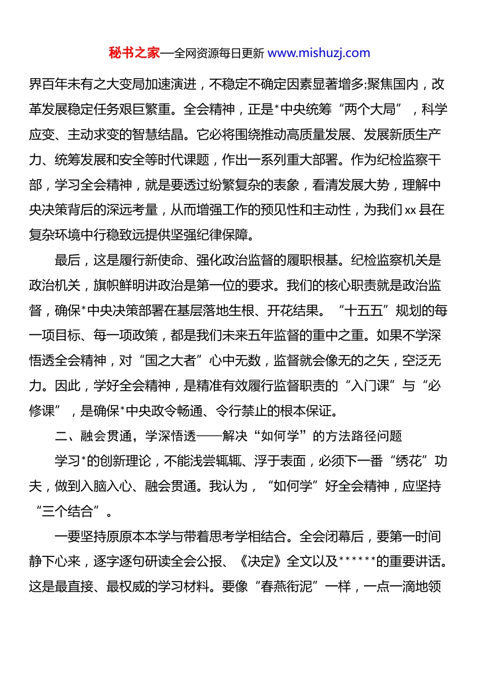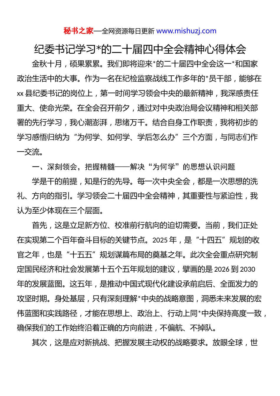 秘书之家—全网资源每日更新 www.mishuzj.com纪委书记学习*的二十届四中全会精神心得体会金秋十月,硕果累累。我们即将迎来*的二十届四中全会这一*和国家政治生活中的大事。作为一名在纪检监察战线工作多年的*员干部,能够在xx 县纪委书记的岗位上,第一时间学习领会中央的最新精神,我深感责任重大、使命光荣。在全会召开前夕,通过对中央政治局会议精神和相关部署的先行学习,我心潮澎湃,思绪万千。结合自身工作职责,我将初步的学习感悟归纳为“为何学、如何学、学后怎么办”三个方面,与同志们作一交流。一、深刻领会,把握精髓——解决“为何学”的思想认识问题学是干的前提,知是行的先导。每一次中央全会,都是一次思想的洗礼、方向的指引。学习领会二十届四中全会精神,其重要性与紧迫性,我认为至少体现在三个层面。首先,这是立足新方位、校准前行航向的迫切需要。当前,我们正处在实现第二个百年奋斗目标的关键节点。2025 年,是“十四五”规划的收官之年,也是“十五五”规划谋篇布局的奠基之年。此次全会重点研究制定国民经济和社会发展第十五个五年规划的建议,擘画的是 2026 到 2030年的发展蓝图。这五年,是推动中国式现代化建设承前启后、全面发力的攻坚时期。身处基层,只有深刻理解*中央的战略意图,洞悉未来发展的宏伟蓝图和实践路径,才能在思想上、政治上、行动上同*中央保持高度一致,确保我们的工作始终沿着正确的方向前进,不偏航、不掉队。其次,这是应对新挑战、把握发展主动权的战略要求。放眼全球,世秘书之家—全网资源每日更新 www.mishuzj.com界百年未有之大变局加速演进,不稳定不确定因素显著增多;聚焦国内,改革发展稳定任务艰巨繁重。全会精神,正是*中央统筹“两个大局”,科学应变、主动求变的智慧结晶。它必将围绕推动高质量发展、发展新质生产力、统筹发展和安全等时代课题,作出一系列重大部署。作为纪检监察干部,学习全会精神,就是要透过纷繁复杂的表象,看清发展大势,理解中央决策背后的深远考量,从而增强工作的预见性和主动性,为我们 xx 县在复杂环境中行稳致远提供坚强纪律保障。最后,这是履行新使命、强化政治监督的履职根基。纪检监察机关是政治机关,旗帜鲜明讲政治是第一位的要求。我们的核心职责就是政治监督,确保*中央决策部署在基层落地生根、开花结果。“十五五”规划的每一项目标、每一项政策,都是我们未来五年监督的重中之重。如果不学深悟透全会精神,对“国之大者”心中无数,监督就会像无的之矢,空泛无力。因此,学好全会精神,是精准有效履行监督职责的“入门课”与“必修课”,是确保*中央政令畅通、令行禁止的根本保证。二、融会贯通,学深悟透——解决“如何学”的方法路径问题学习*的创新理论,不能浅尝辄辄、浮于表面,必须下一番“绣花”功夫,做到入脑入心、融会贯通。我认为,“如何学”好全会精神,应坚持“三个结合”。一要坚持原原本本学与带着思考学相结合。全会闭幕后,要第一时间静下心来,逐字逐句研读全会公报、《决定》全文以及******的重要讲话。这是最直接、最权威的学习材料。要像“春燕衔泥”一样,一点一滴地领秘书之家—全网资源每日更新 www.mishuzj.com会其中的新思想、新观点、新论断。同时,不能仅停留在“读过”“看过”的层面,更要带着问题去思考,比如:全会提出的新要求,对我们 xx 县的发展意味着什么?对我们纪检监察工作提出了哪些新的更高要求?我们现有的工作方式和能力,与新形势新任务之间还存在哪些差距?通过这样的深度思考,才能将精神要义真正内化为自己的思想武器和行动指南。二要坚持贯通历史学与联系实际学相结合。*的理论创新和实践发展是一个接续奋斗的过程。学习二十届四中全会精神,必须将其置于*的二十大以来的整体部署中去理解,与二十届三中全会关于全面深化改革的决定贯通起来,与******关于*的自我革命的重要思想,特别是“九个以”的实践要求联系起来。如此,才能既见“树木”又见“森林”,形成一个系统、完整、立体的认识。更重要的是,要紧密联系 xx 县的实际。要思考如何将全会的宏观部署,转化为推动本地发展的具体举措;如何将中央...